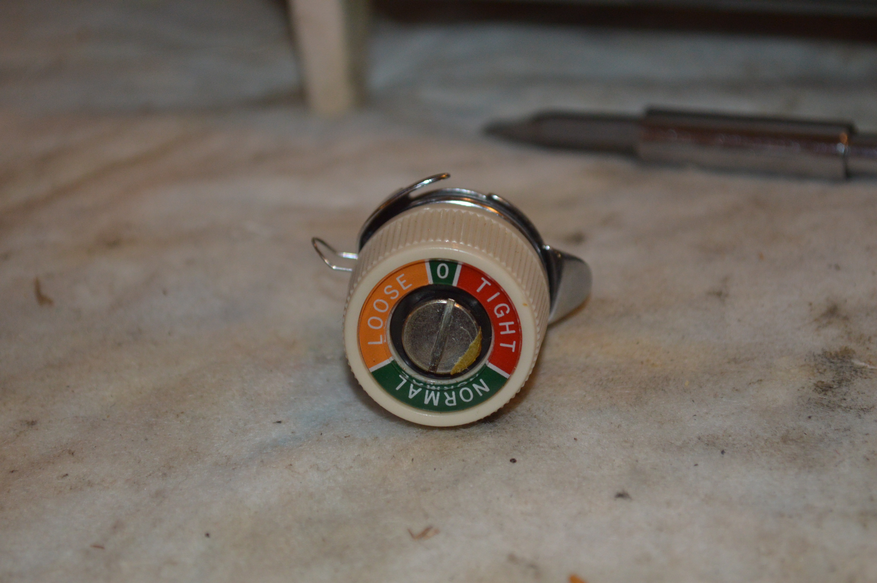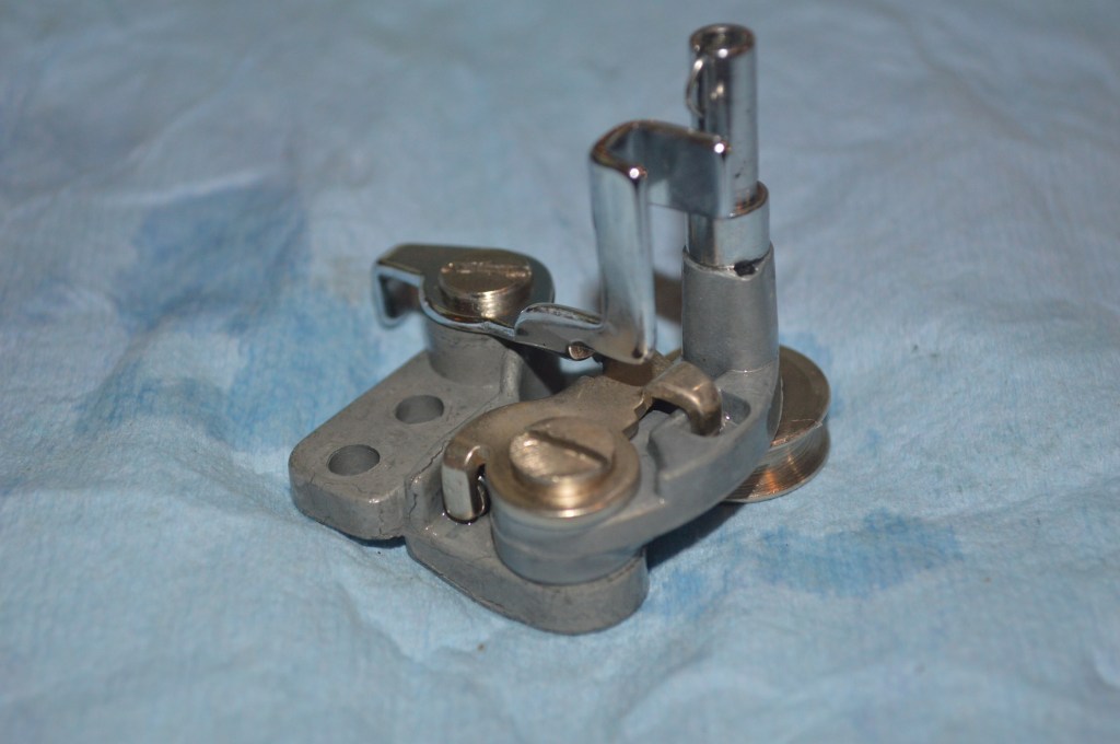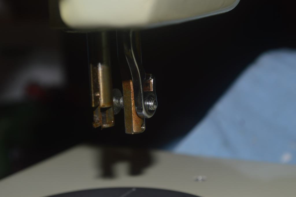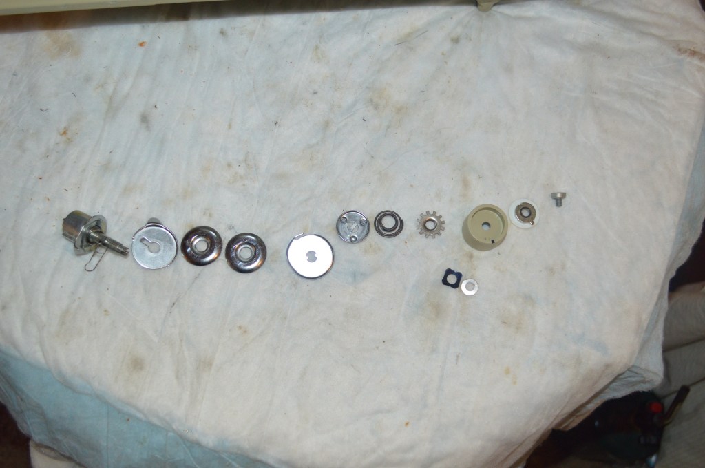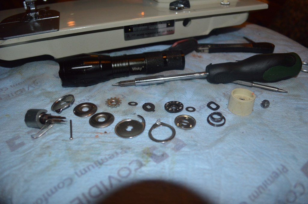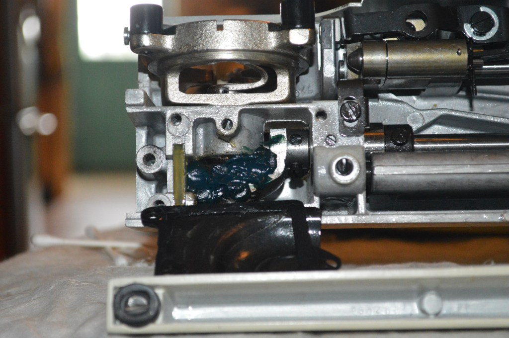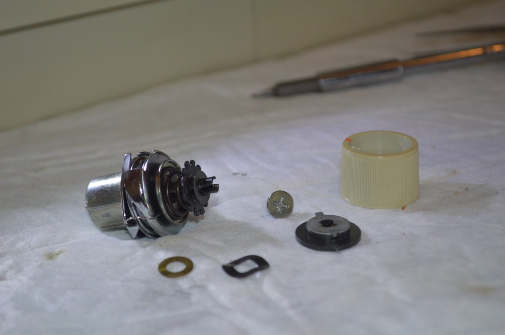 Next is the top tension control restoration. The tension discs and the tension disc shaft are polished. Everything else is cleaned. This will assure a smooth thread path and even thread tension.