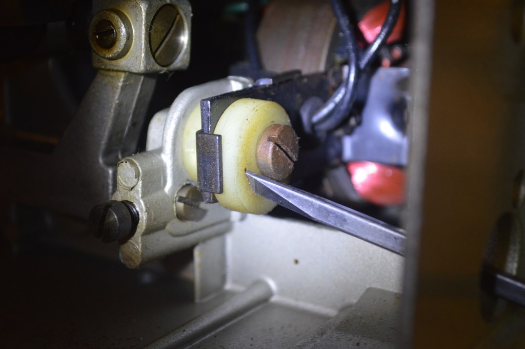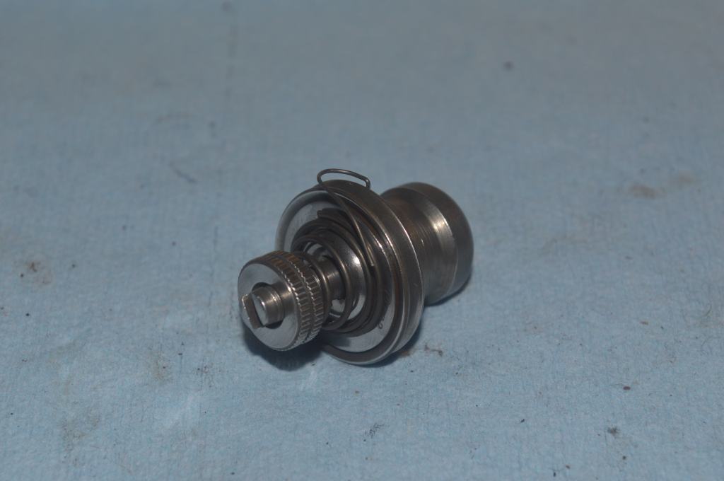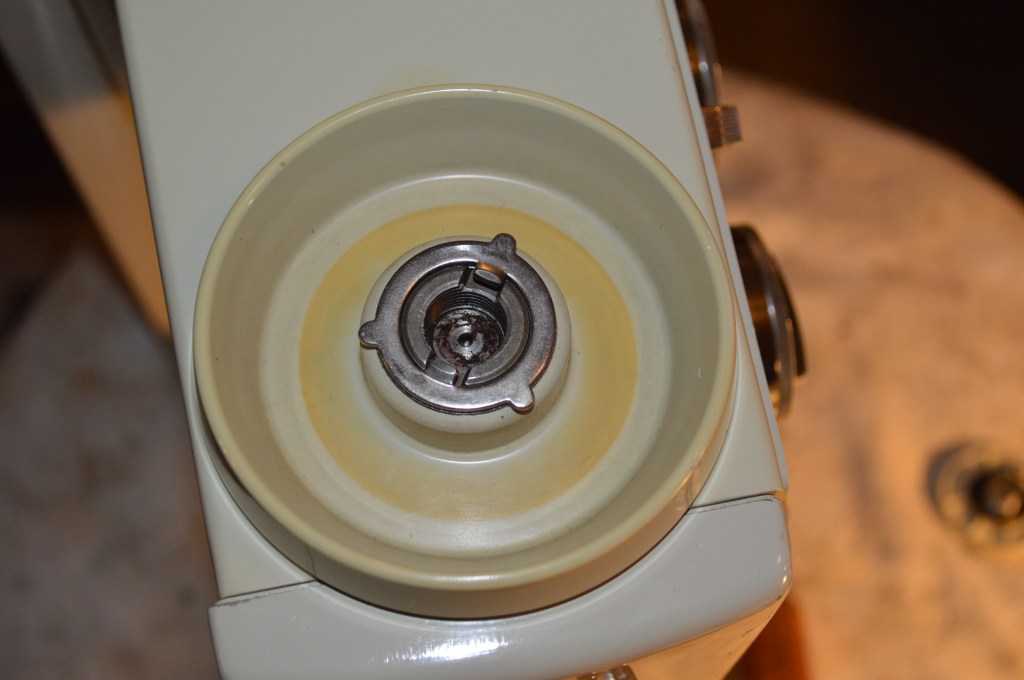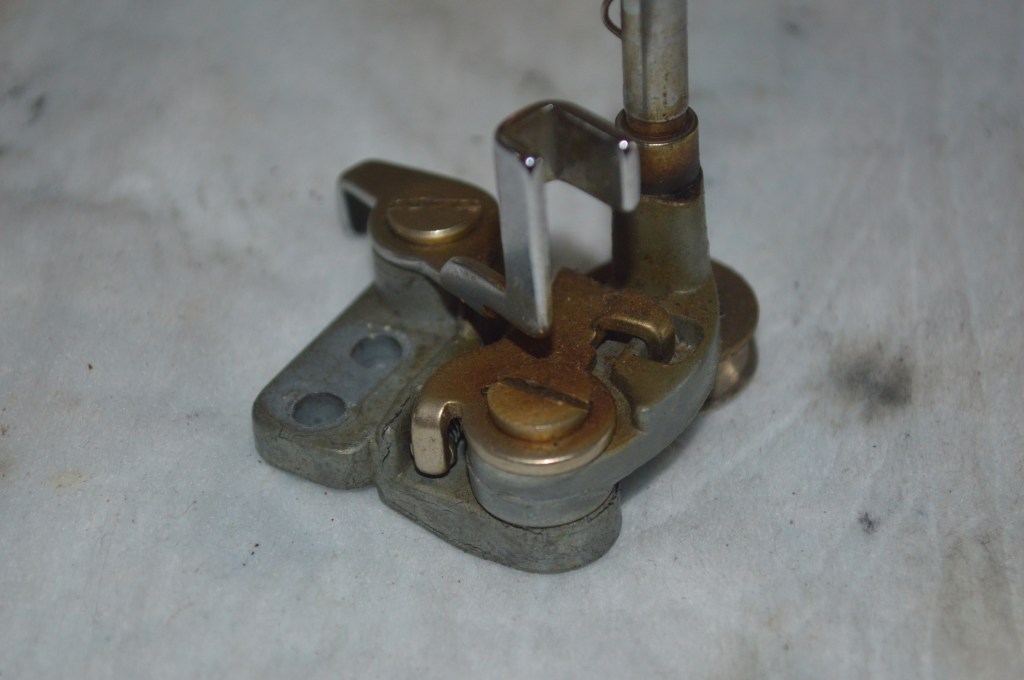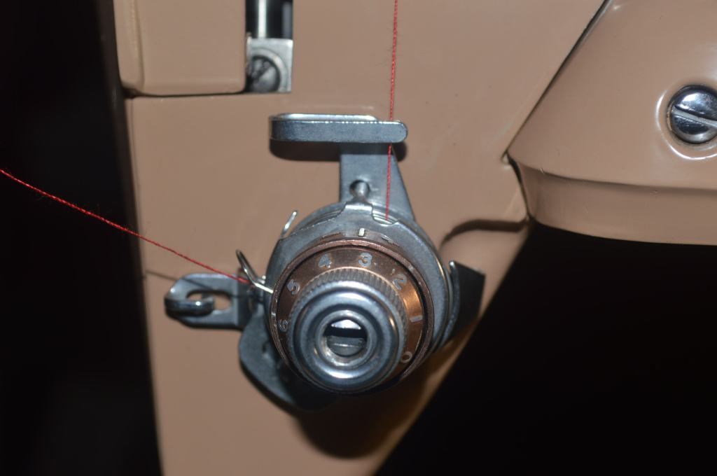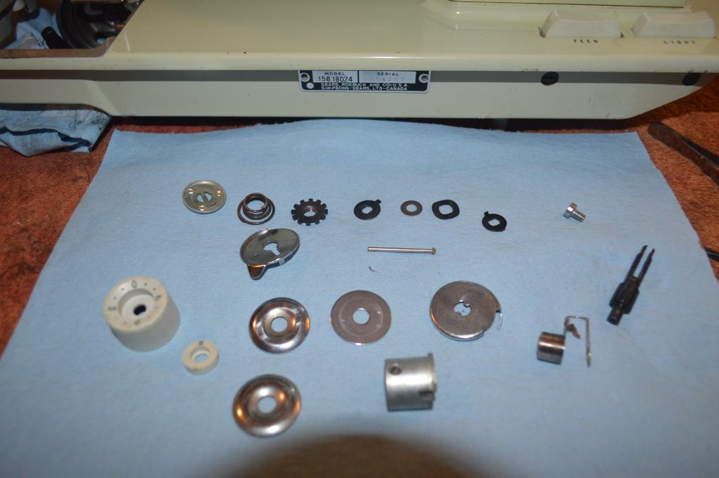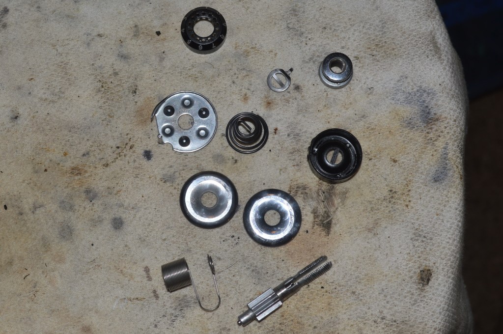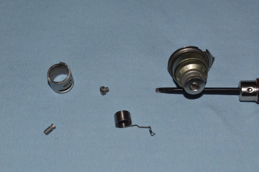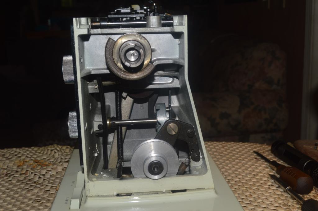 Next is the top tension control restoration. The tension discs and the tension disc shaft are polished. Everything else is cleaned. This will assure a smooth thread path and even thread tension.