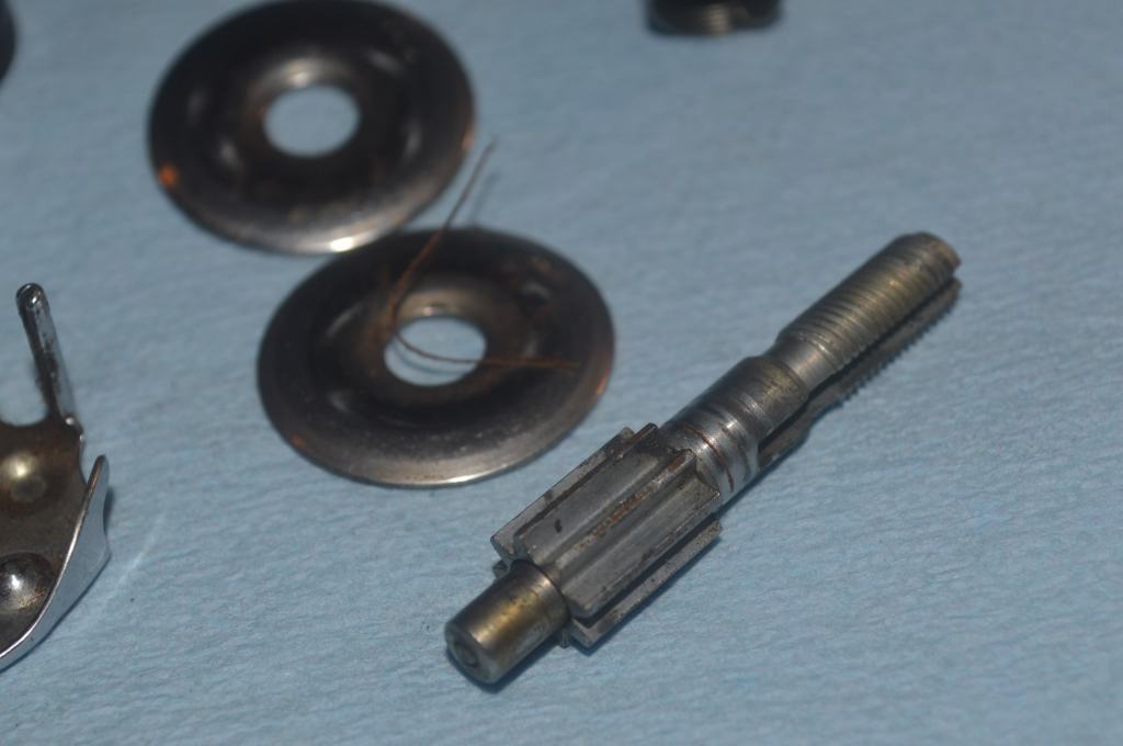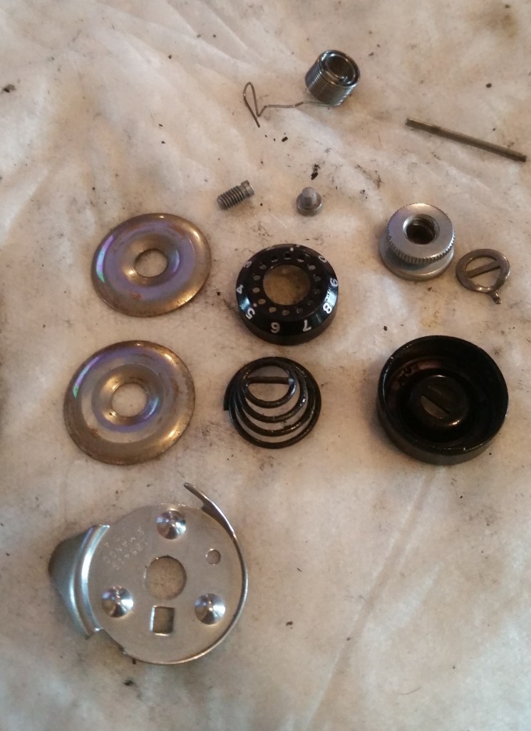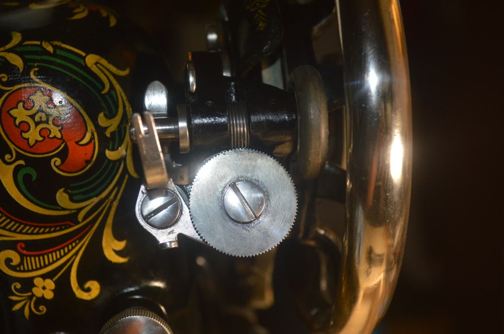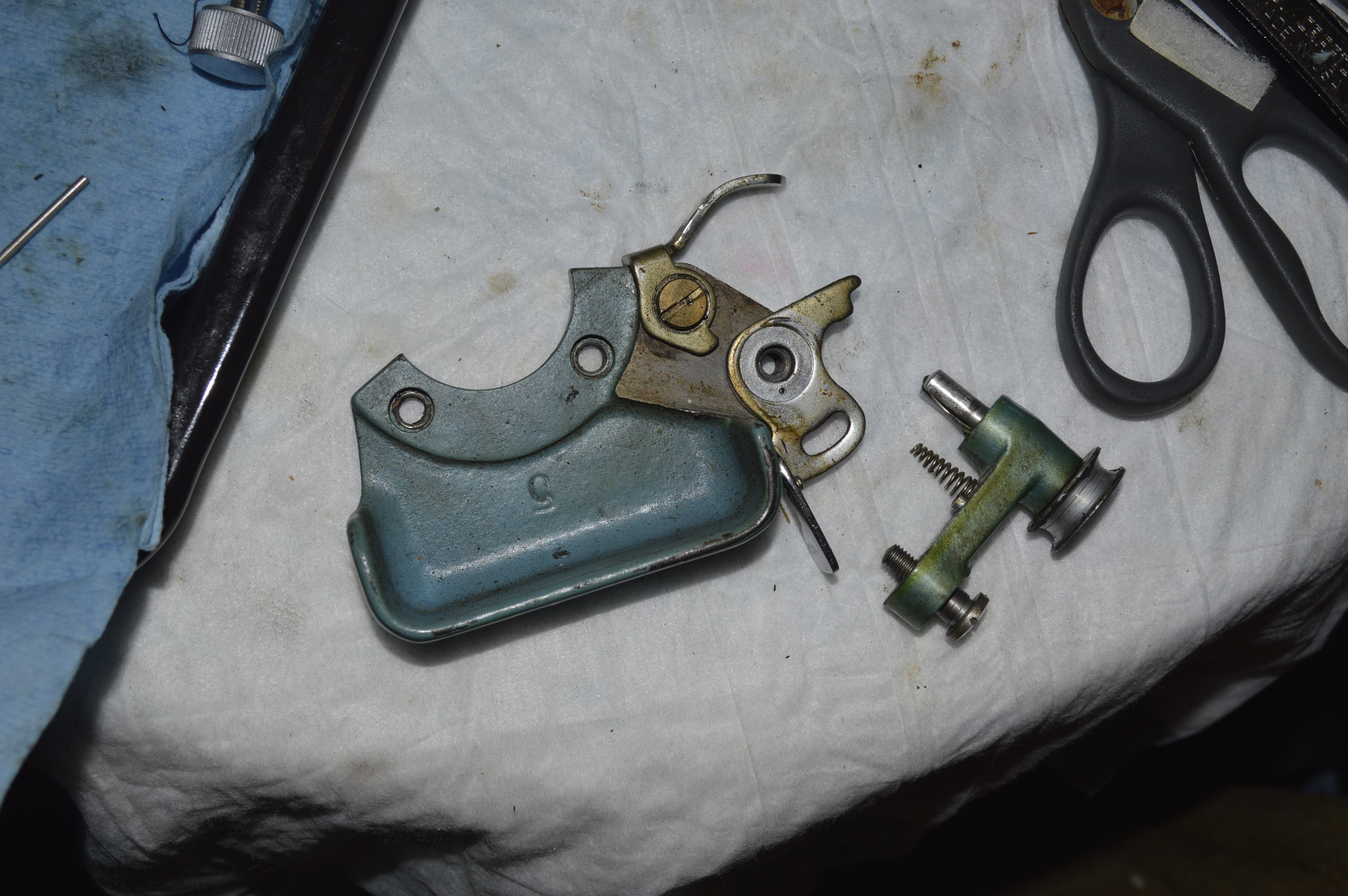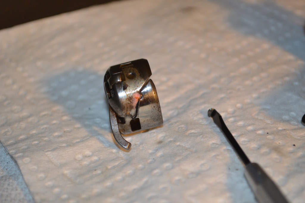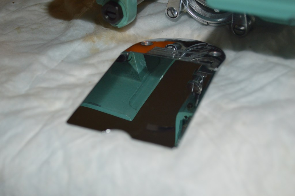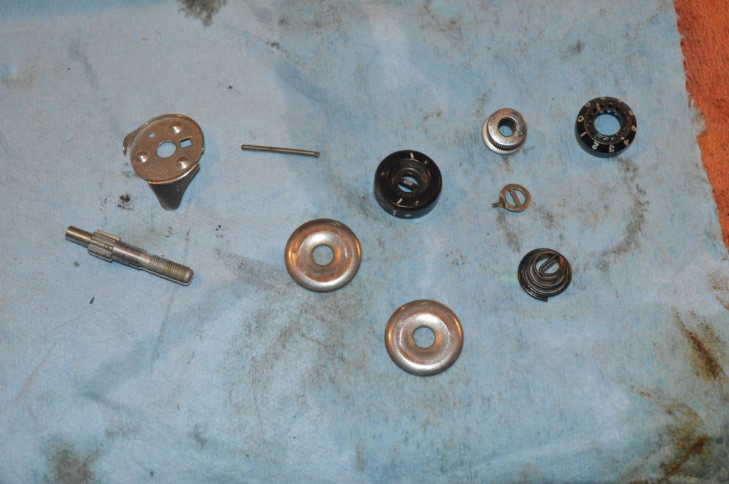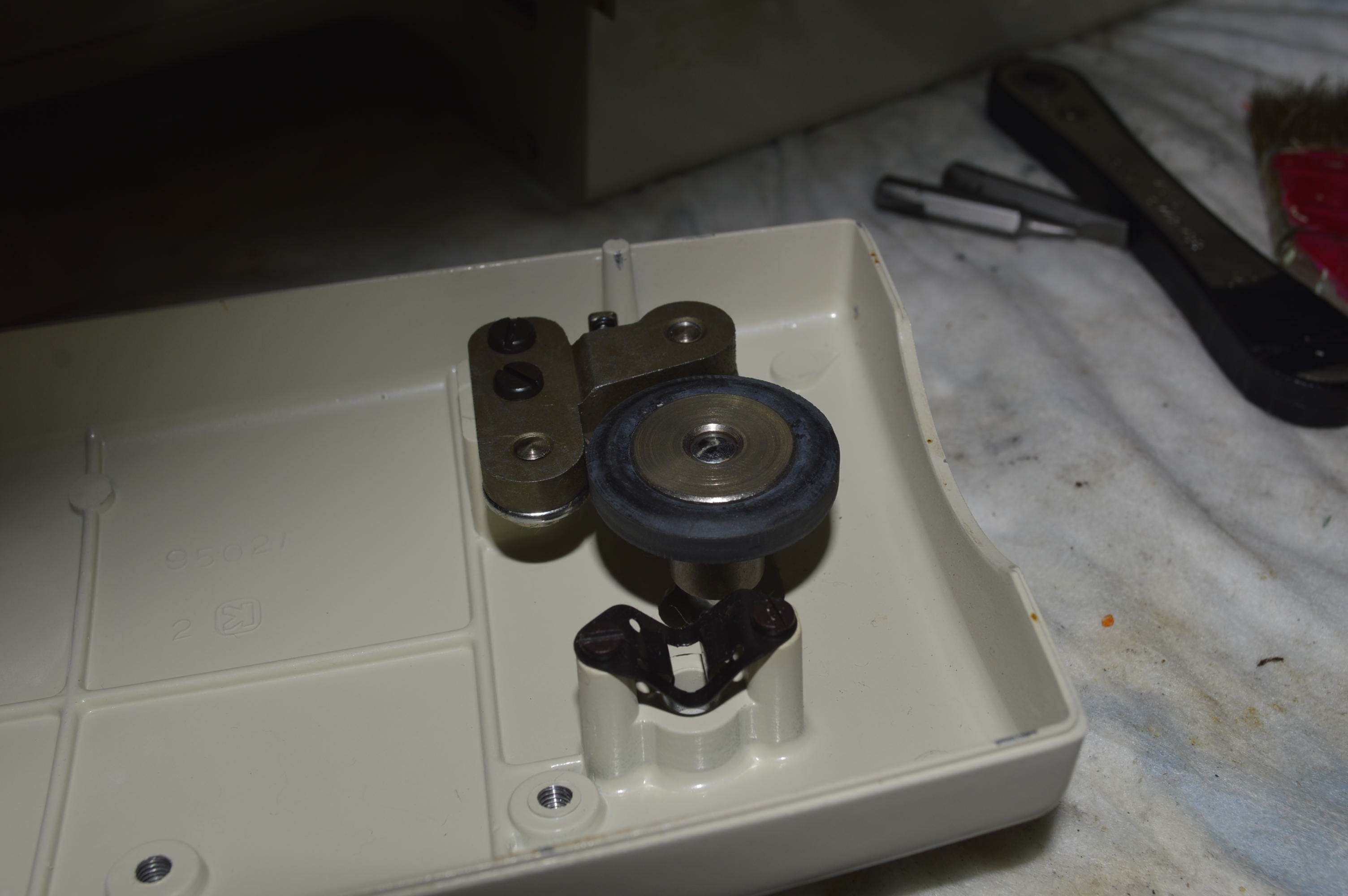 Next is the top tension control restoration. The tension discs and the tension disc shaft are polished. Everything else is cleaned. This will assure a smooth thread path and even thread tension.