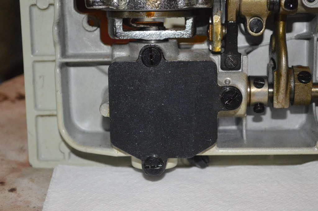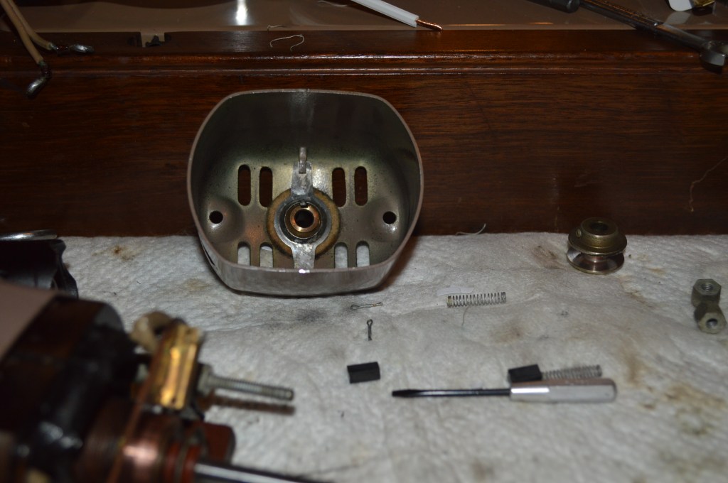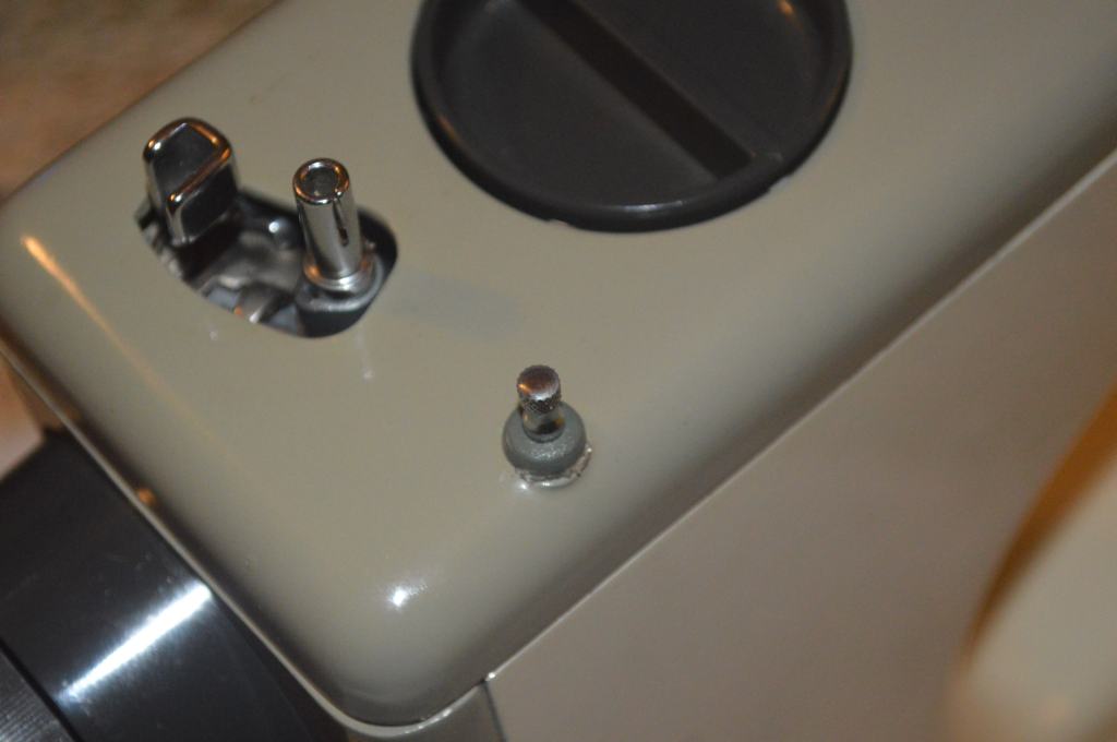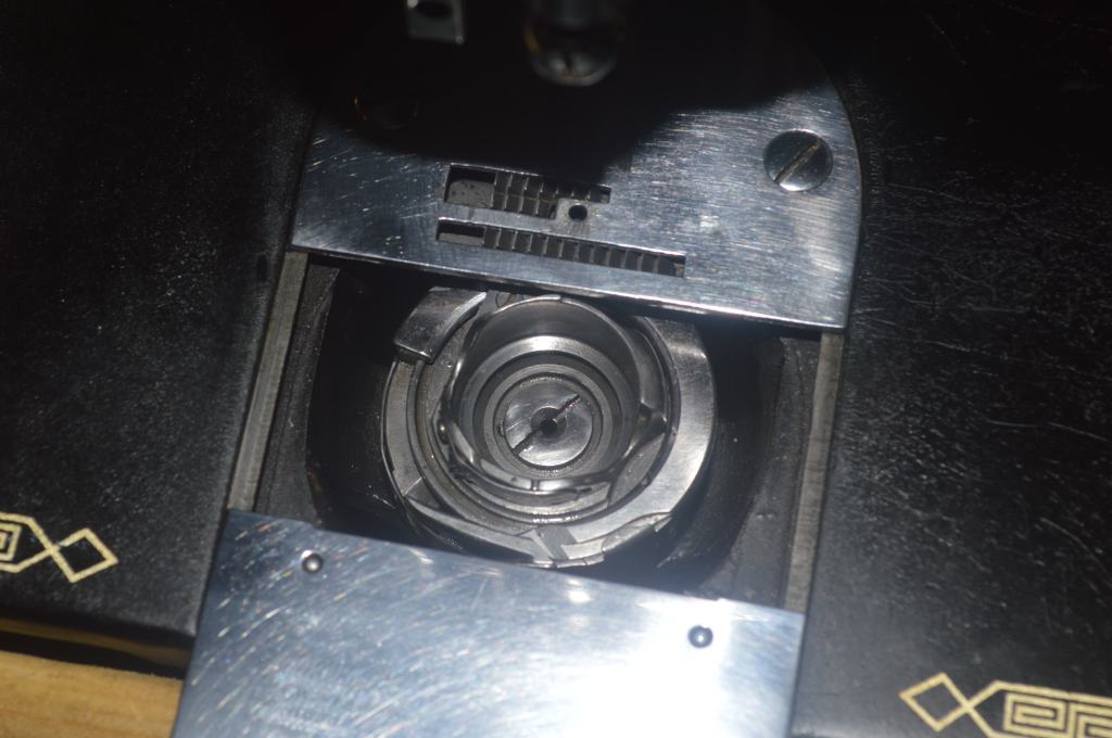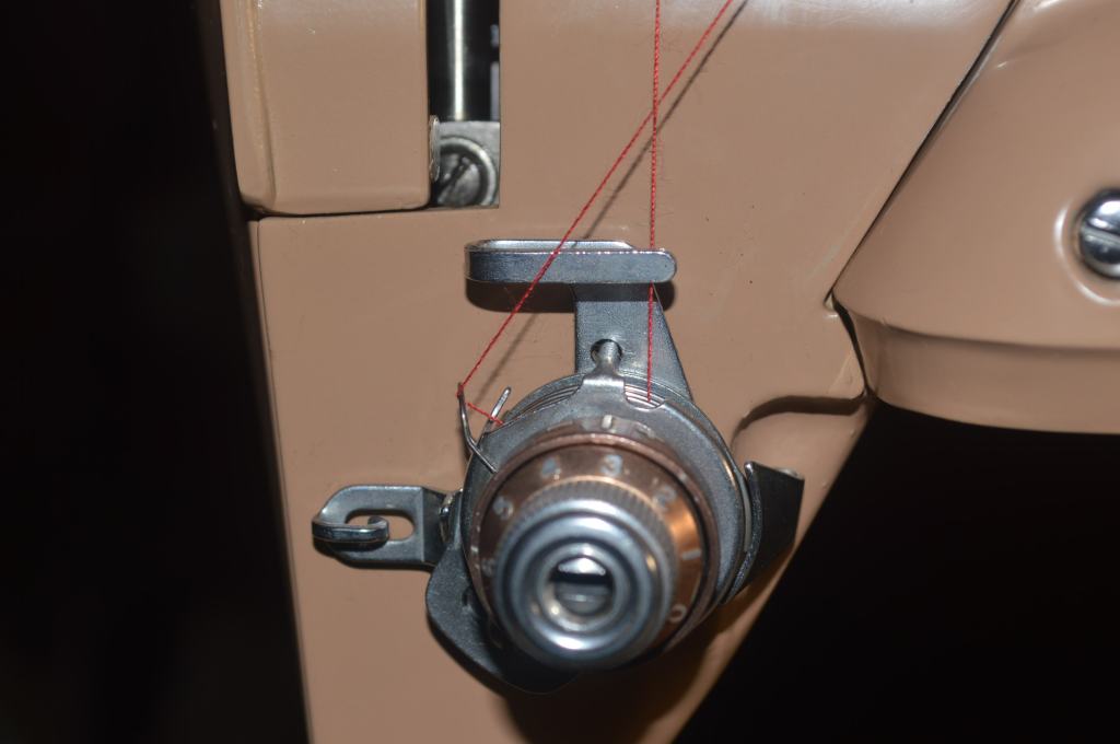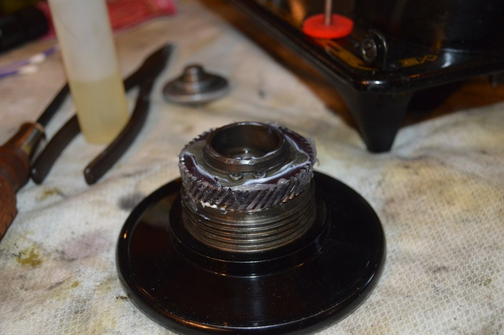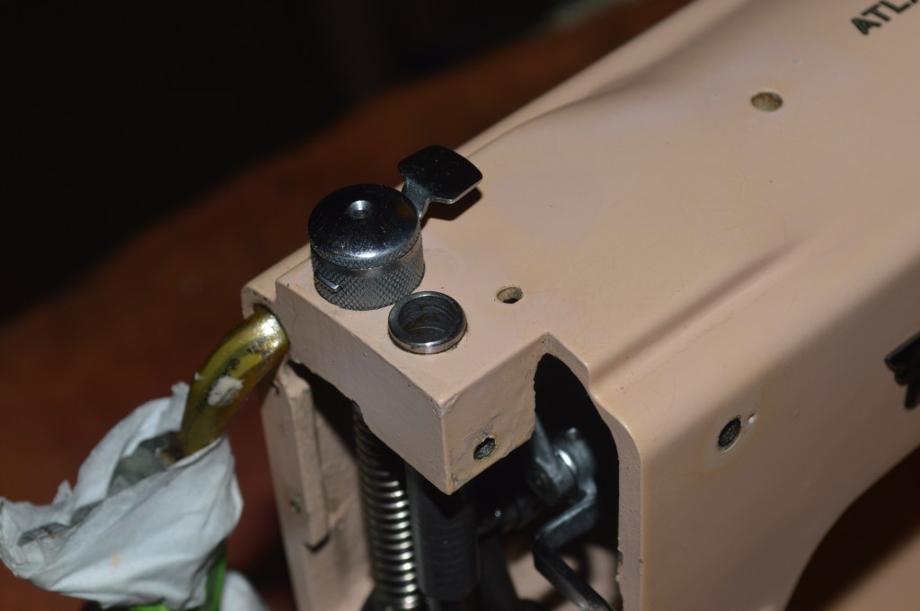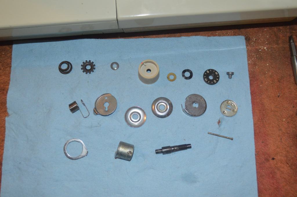 Next is the top tension control restoration. The tension discs and the tension disc shaft are polished. Everything else is cleaned. This will assure a smooth thread path and even thread tension.