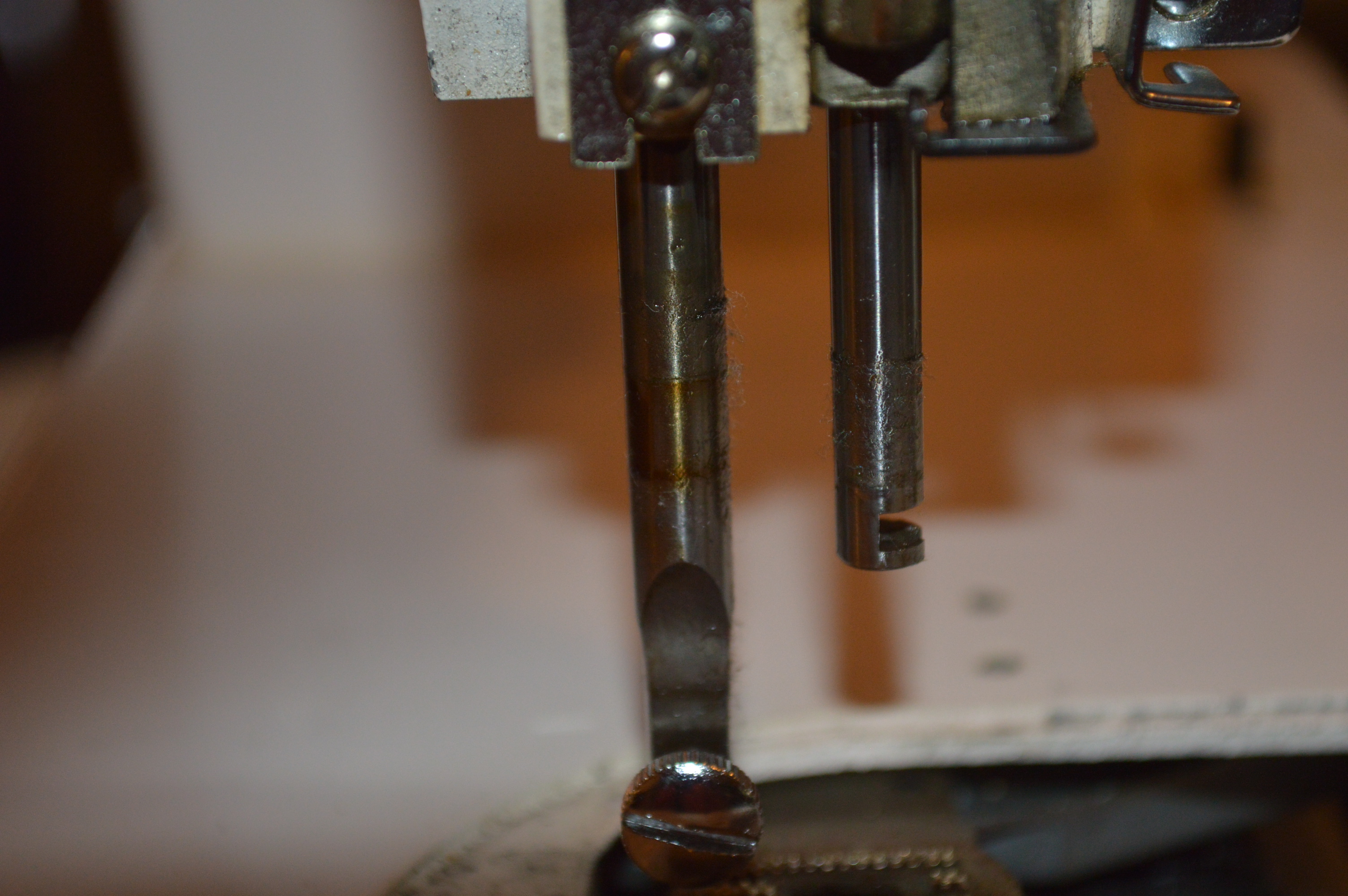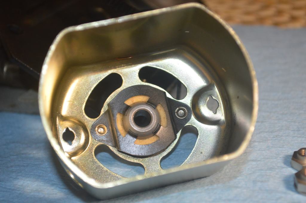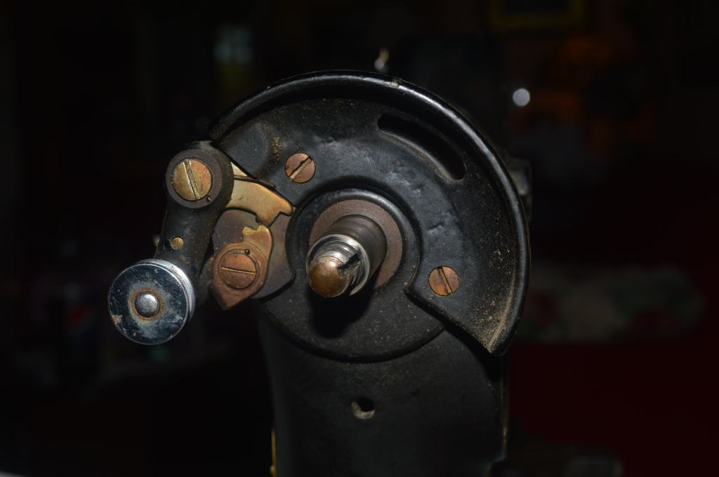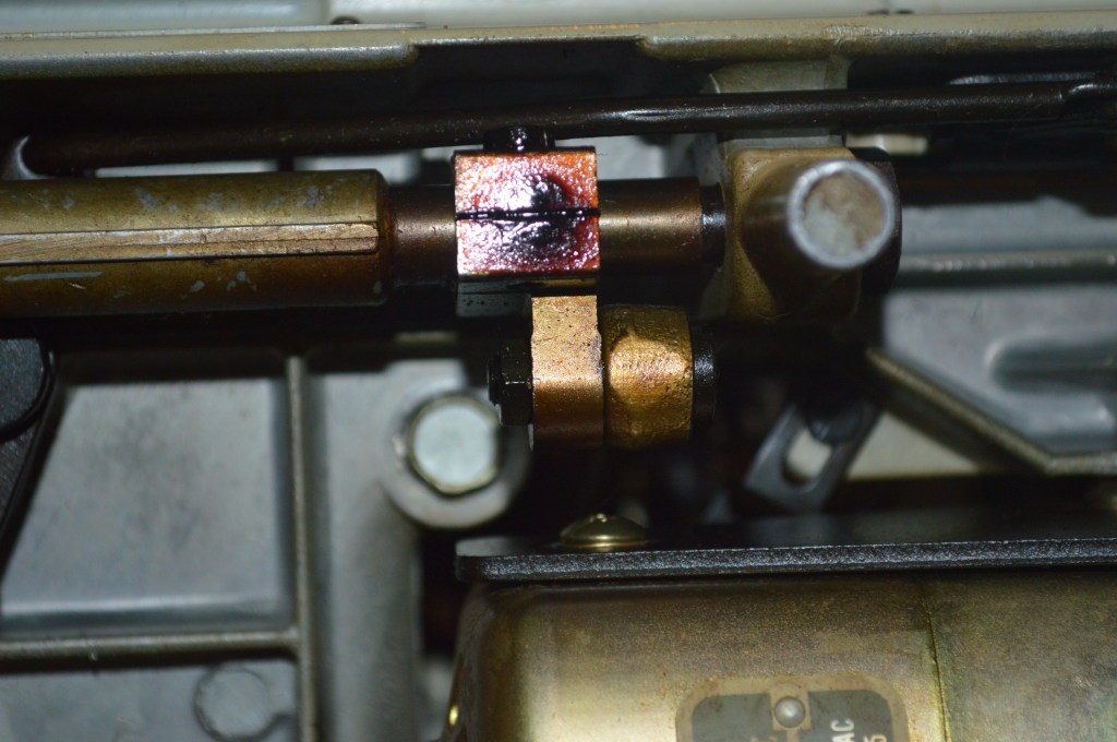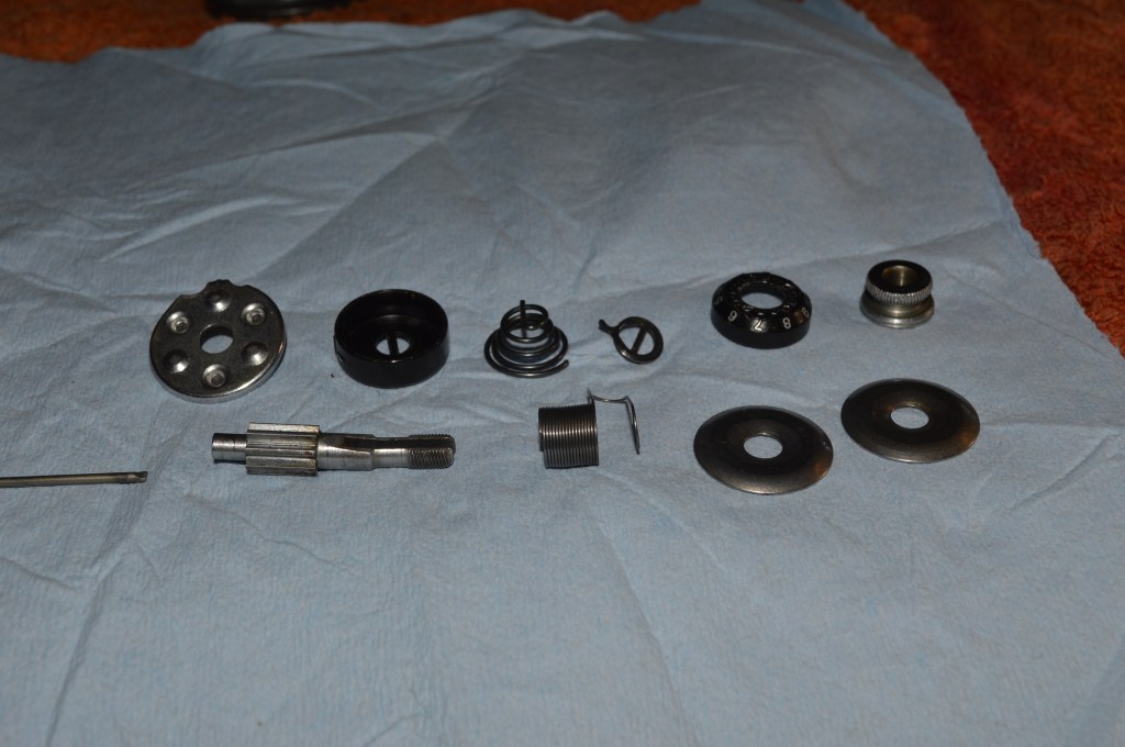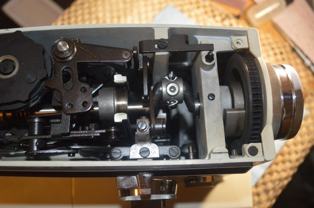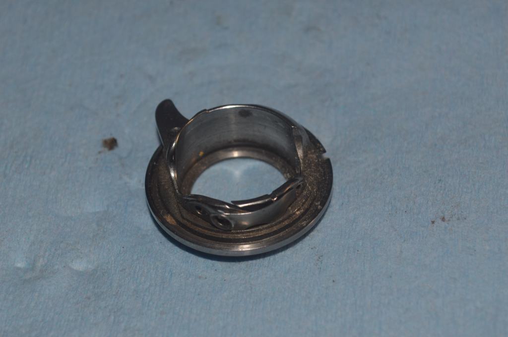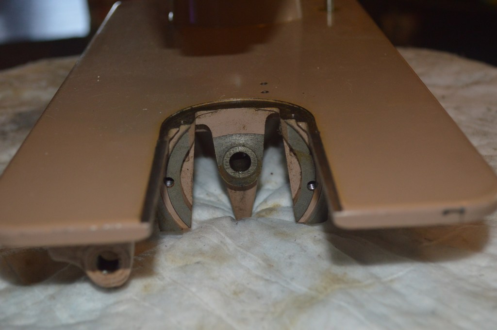 Next is the top tension control restoration. The tension discs and the tension disc shaft are polished. Everything else is cleaned. This will assure a smooth thread path and even thread tension.