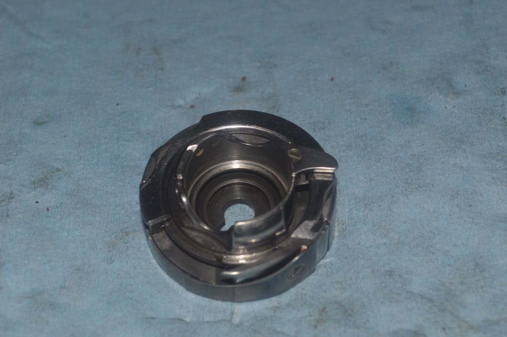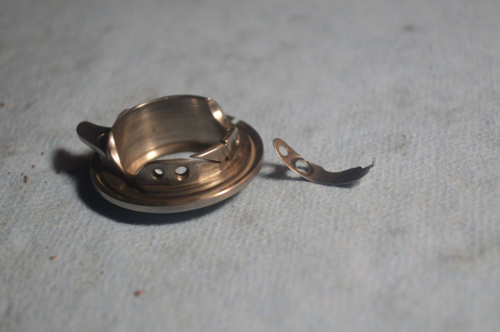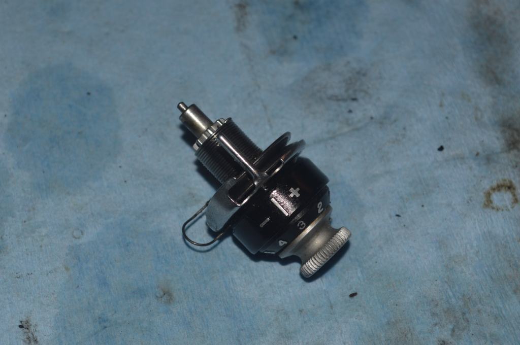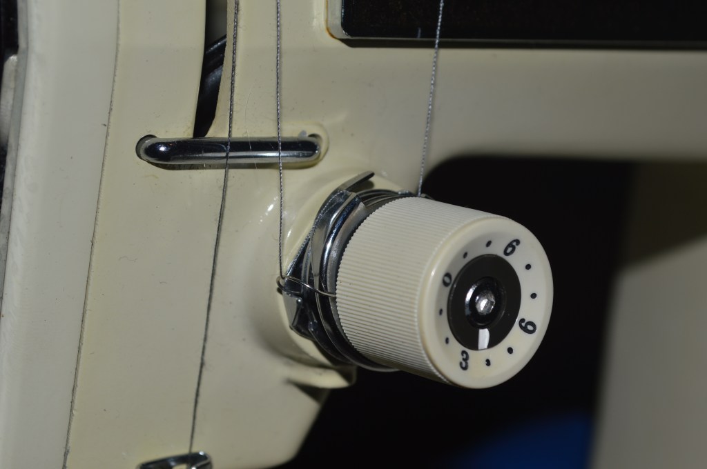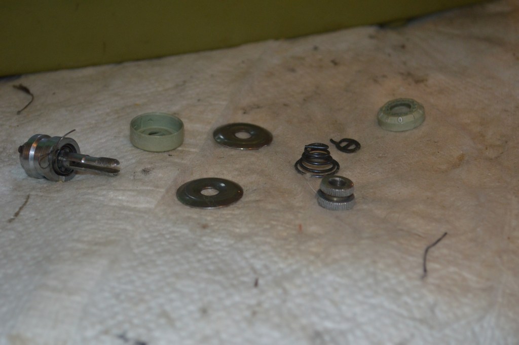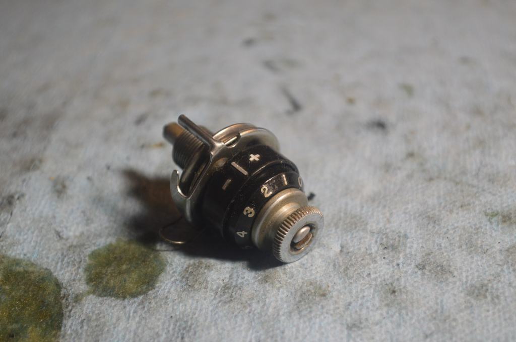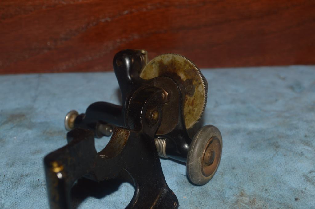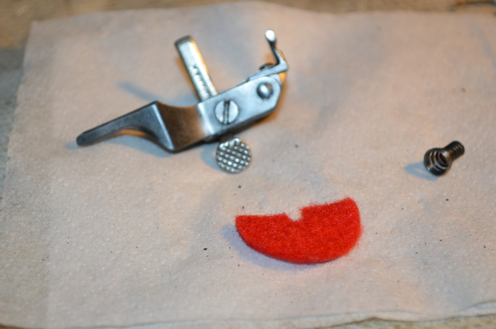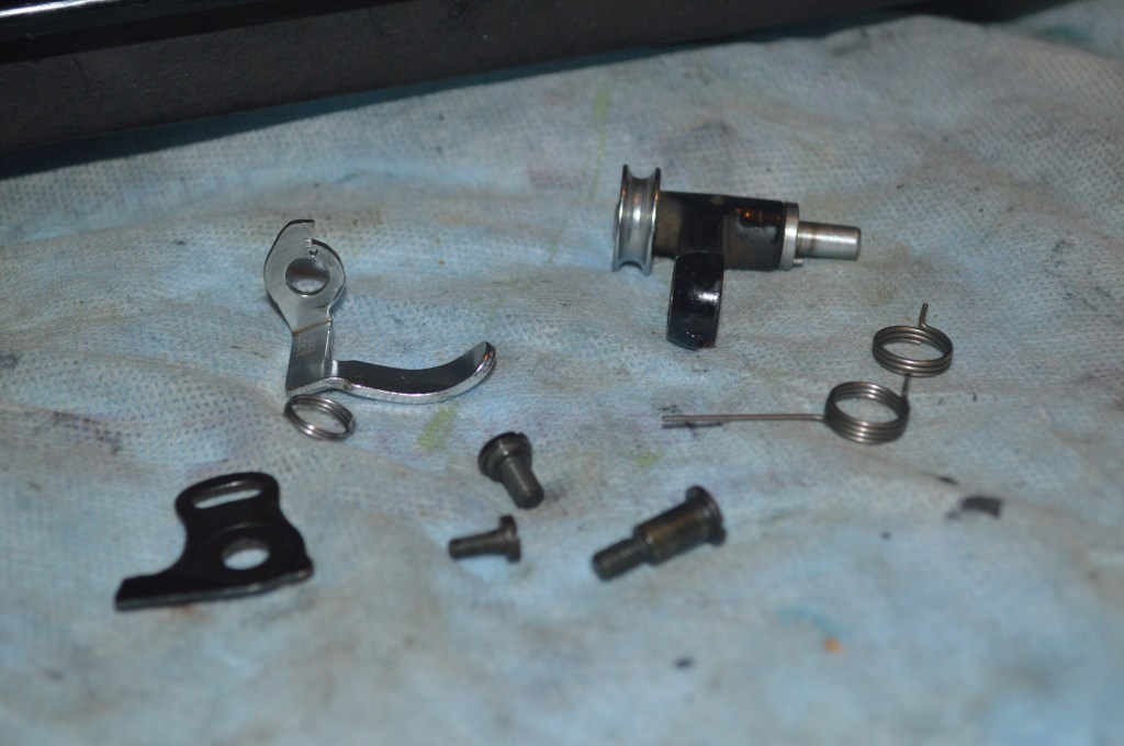 Next is the top tension control restoration. The tension discs and the tension disc shaft are polished. Everything else is cleaned. This will assure a smooth thread path and even thread tension.