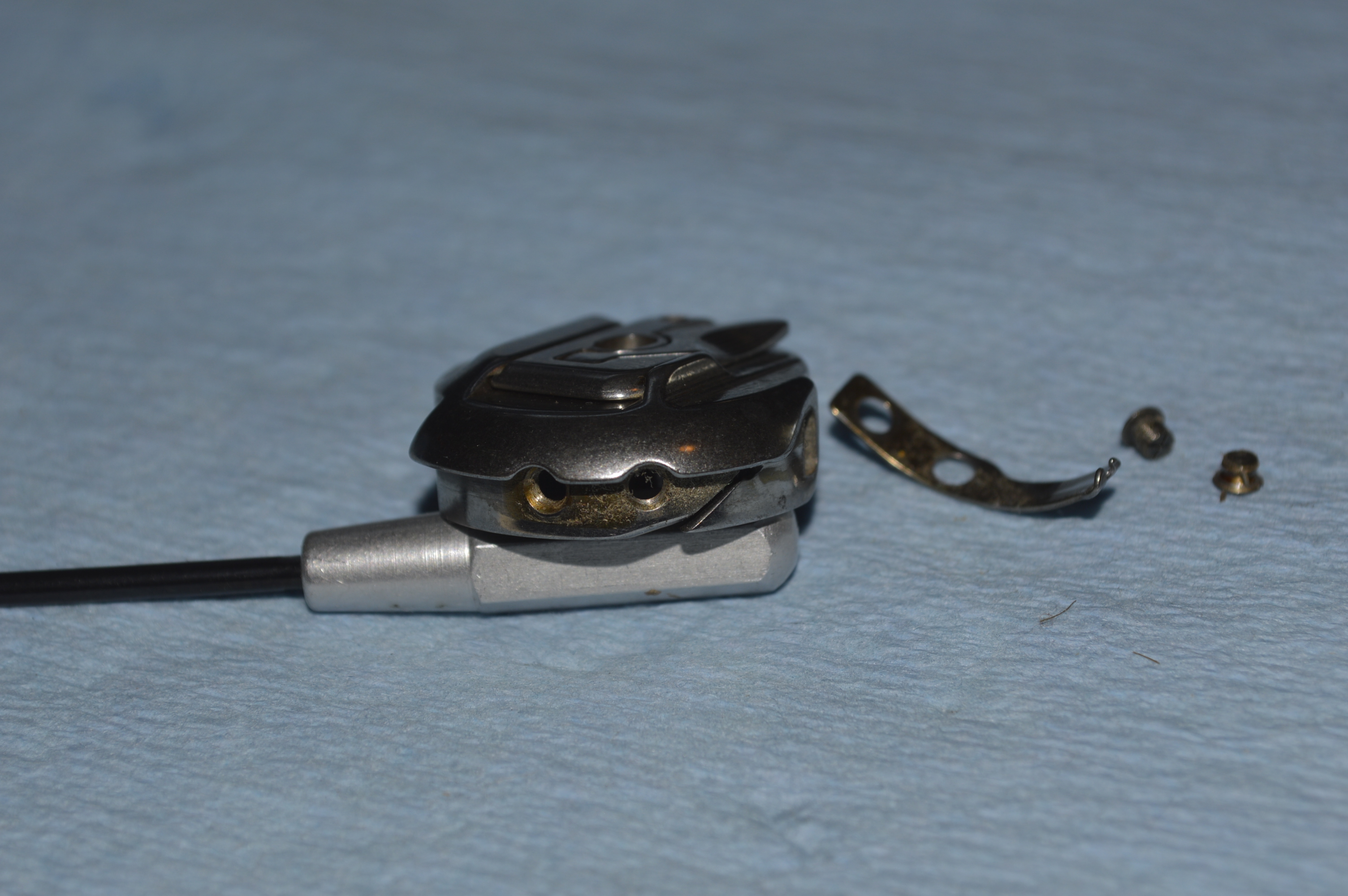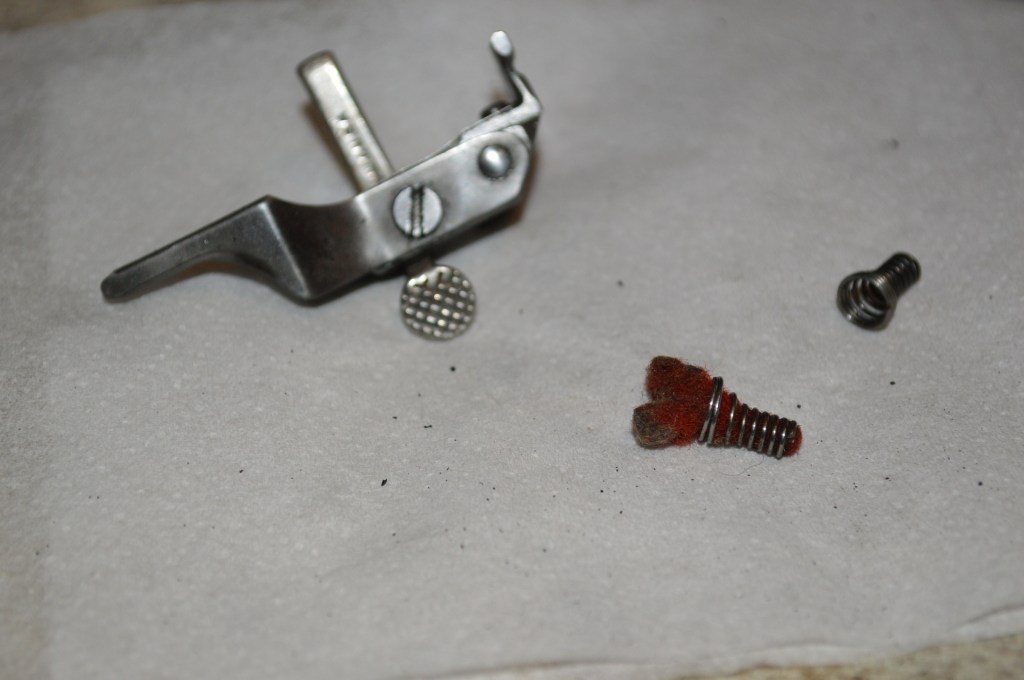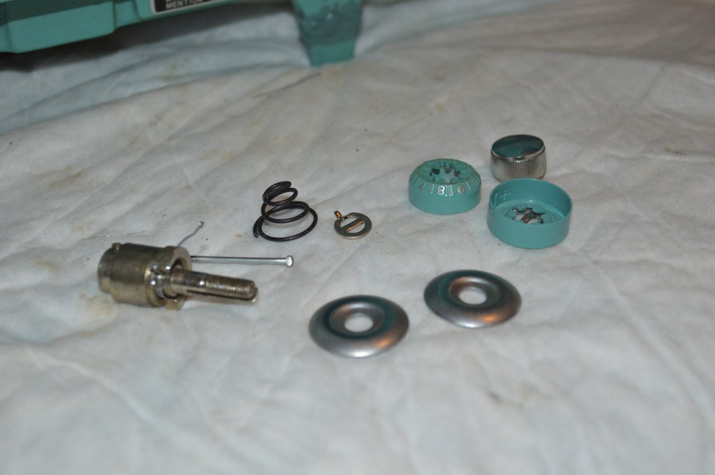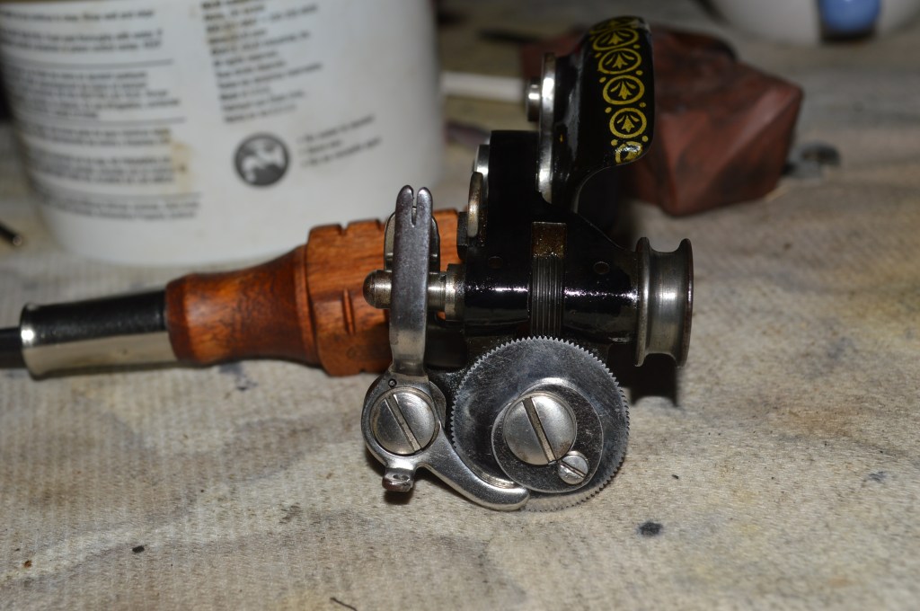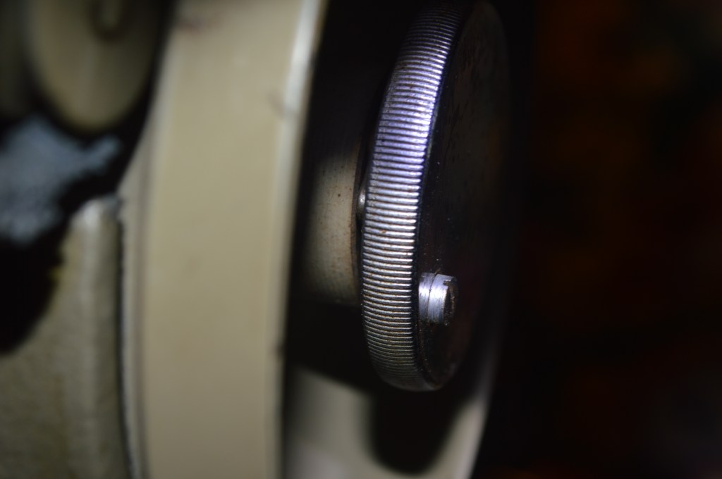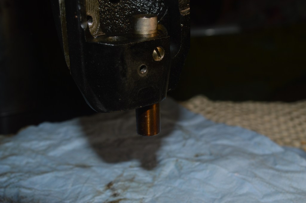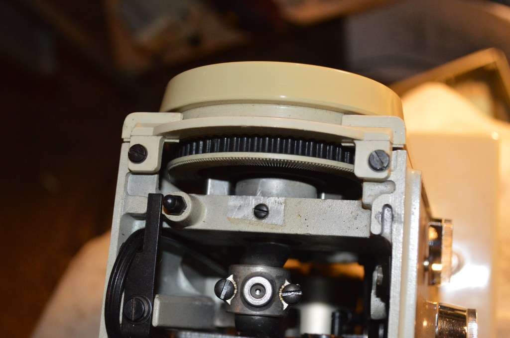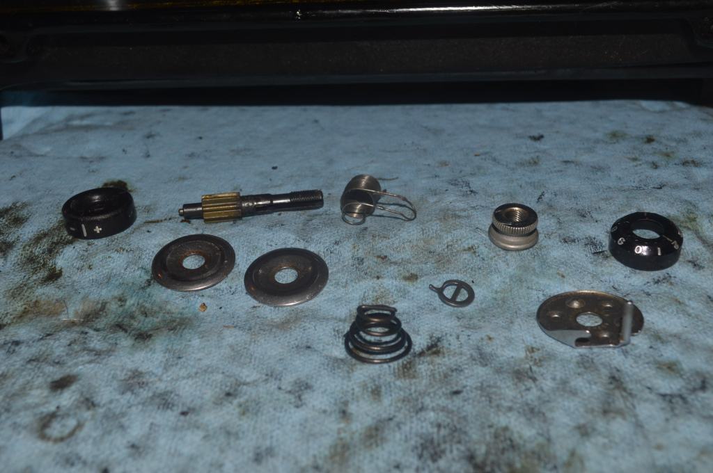 Next is the top tension control restoration. The tension discs and the tension disc shaft are polished. Everything else is cleaned. This will assure a smooth thread path and even thread tension.
