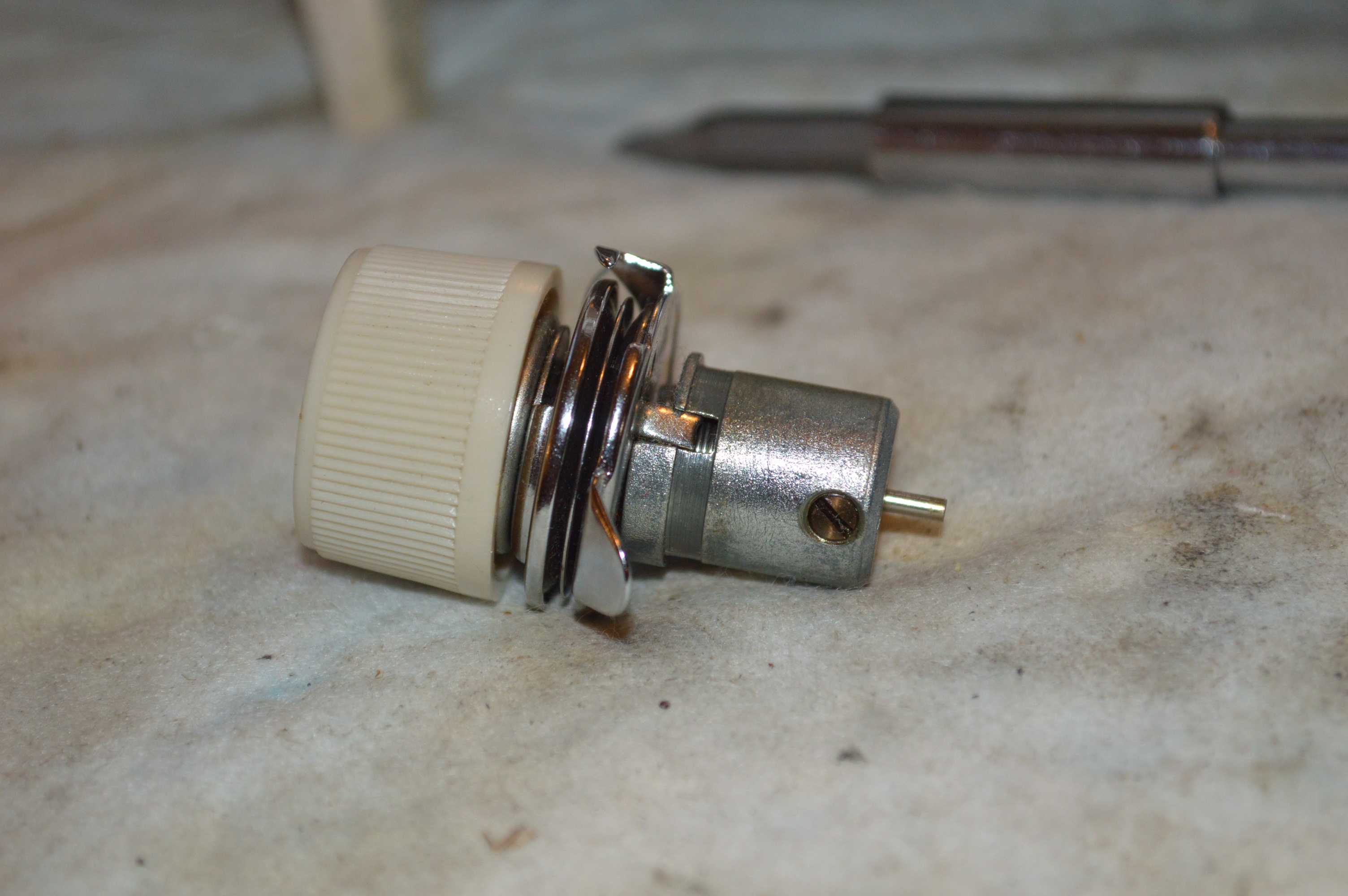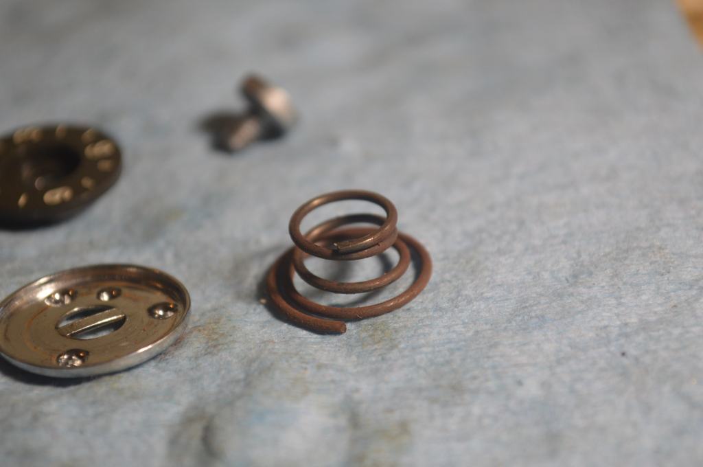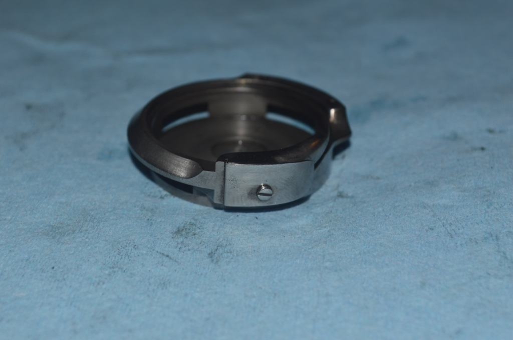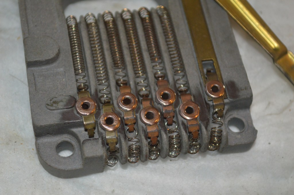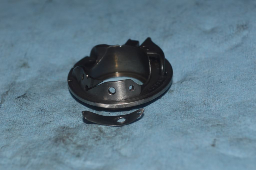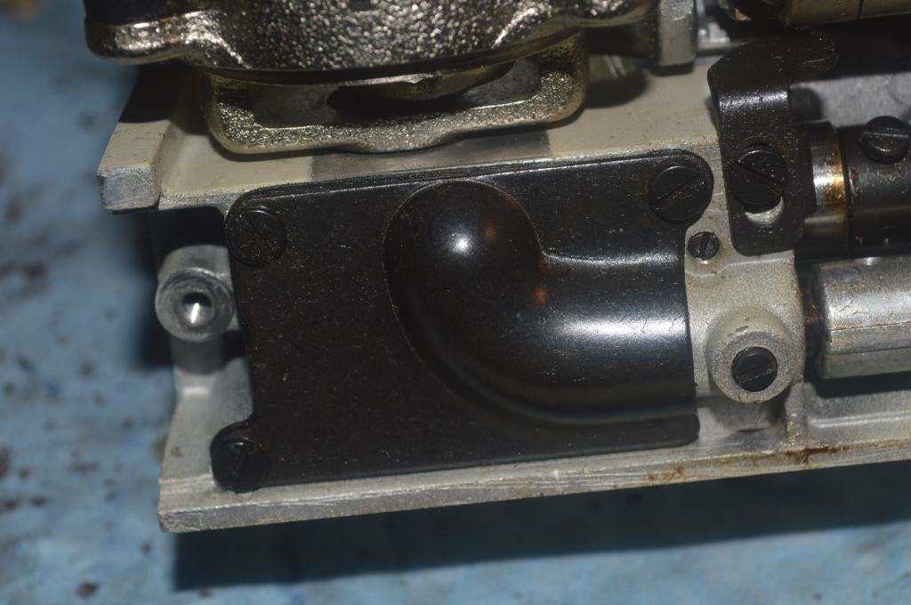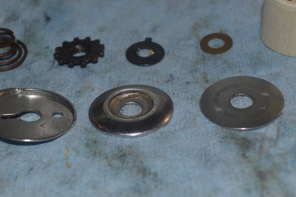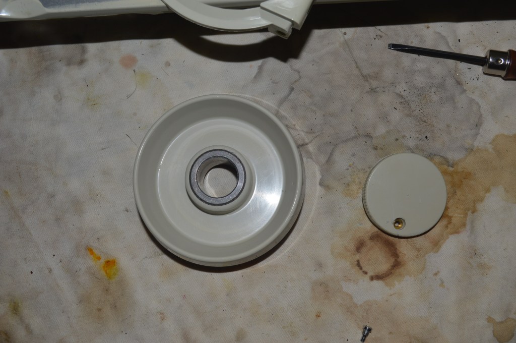 Next is the top tension control restoration. The tension discs and the tension disc shaft are polished. Everything else is cleaned. This will assure a smooth thread path and even thread tension.
