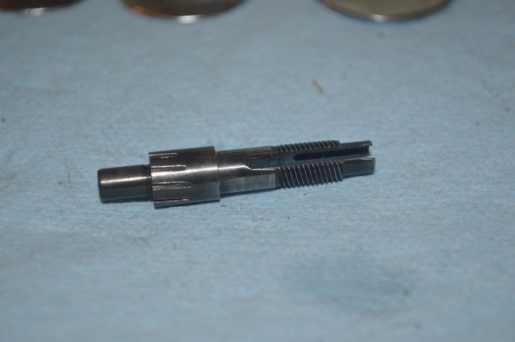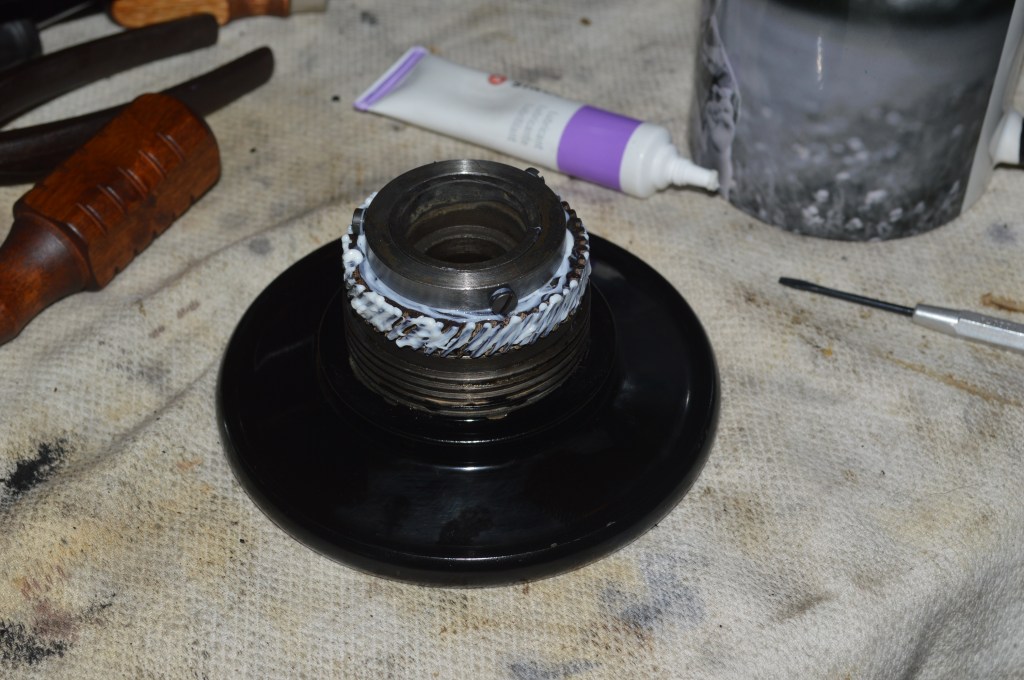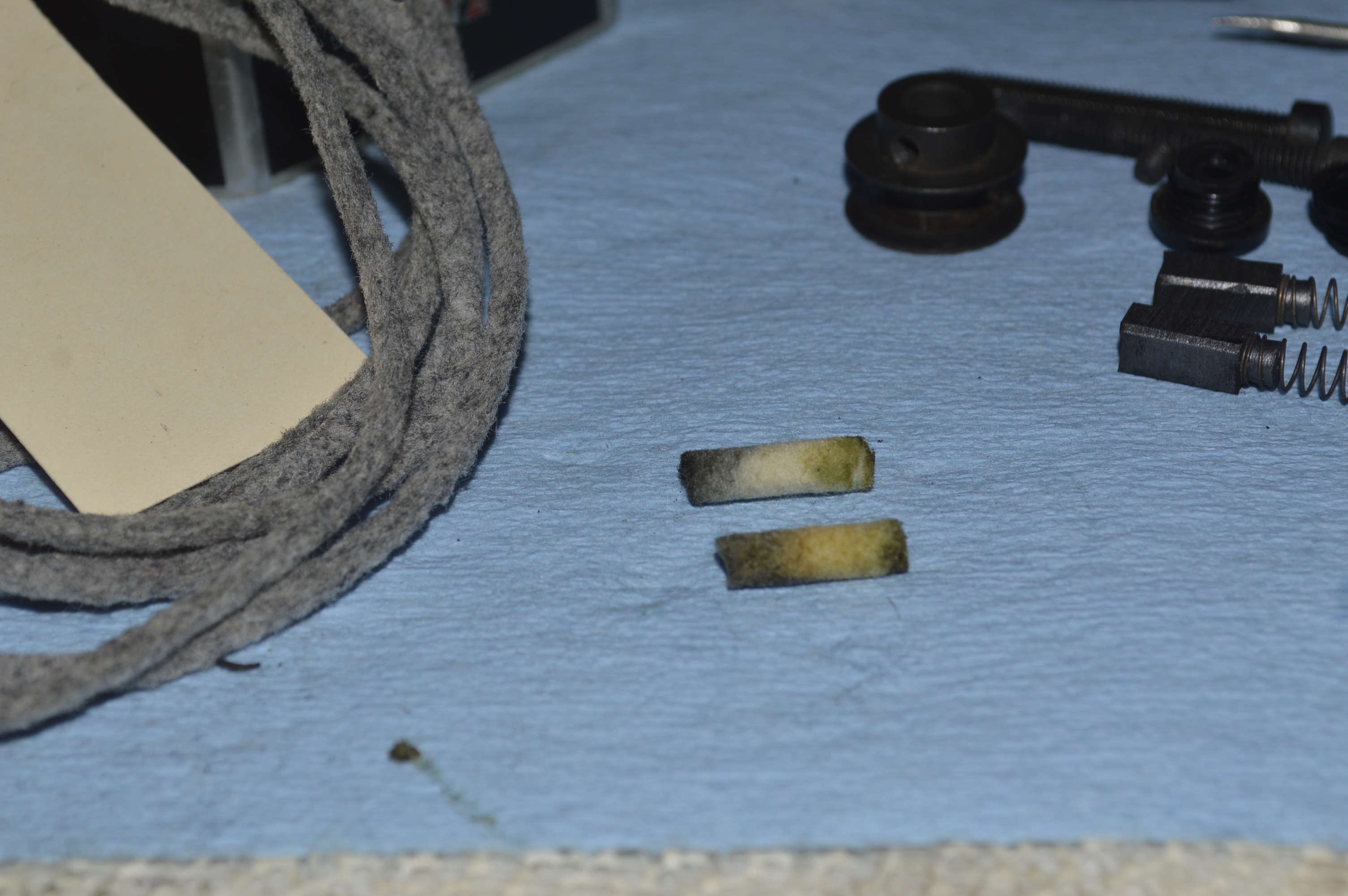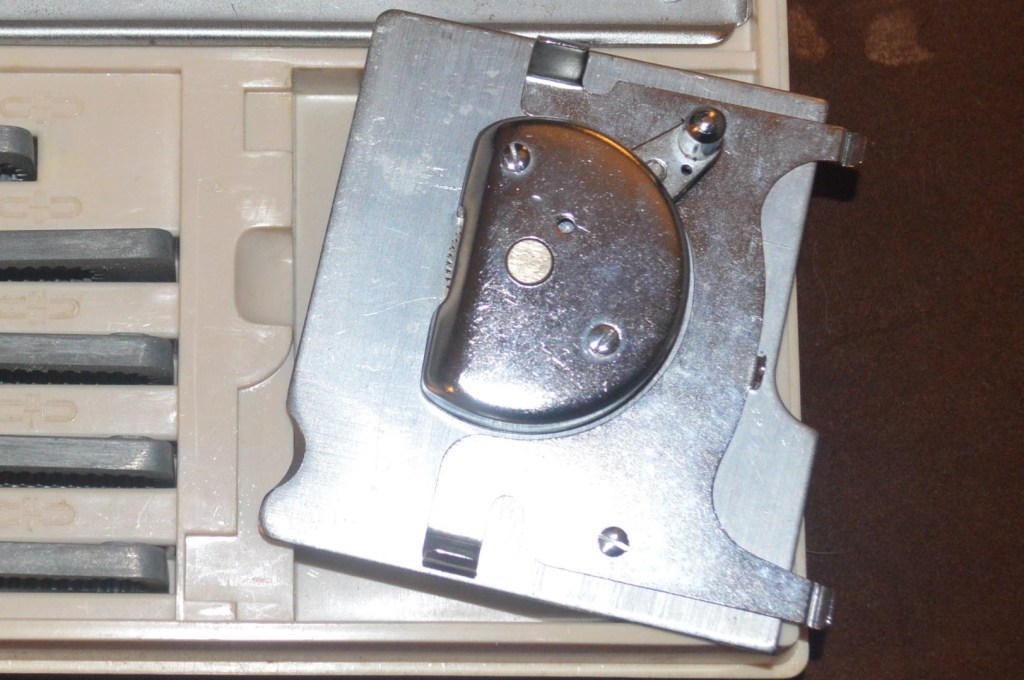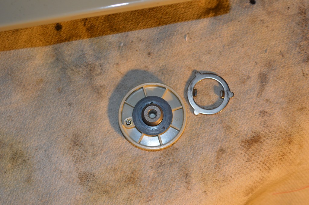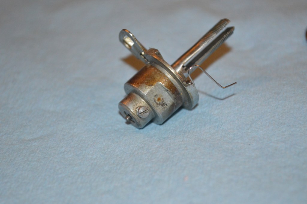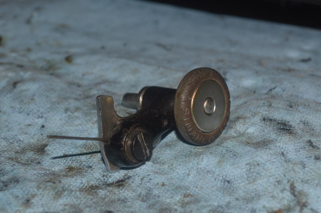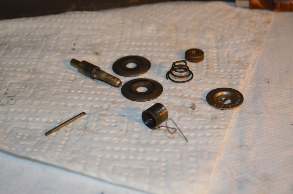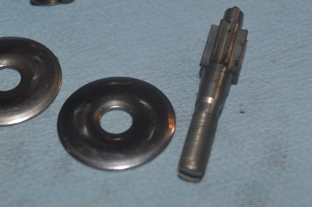 Next is the top tension control restoration. The tension discs and the tension disc shaft are polished. Everything else is cleaned. This will assure a smooth thread path and even thread tension.