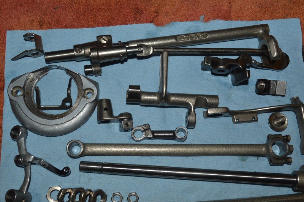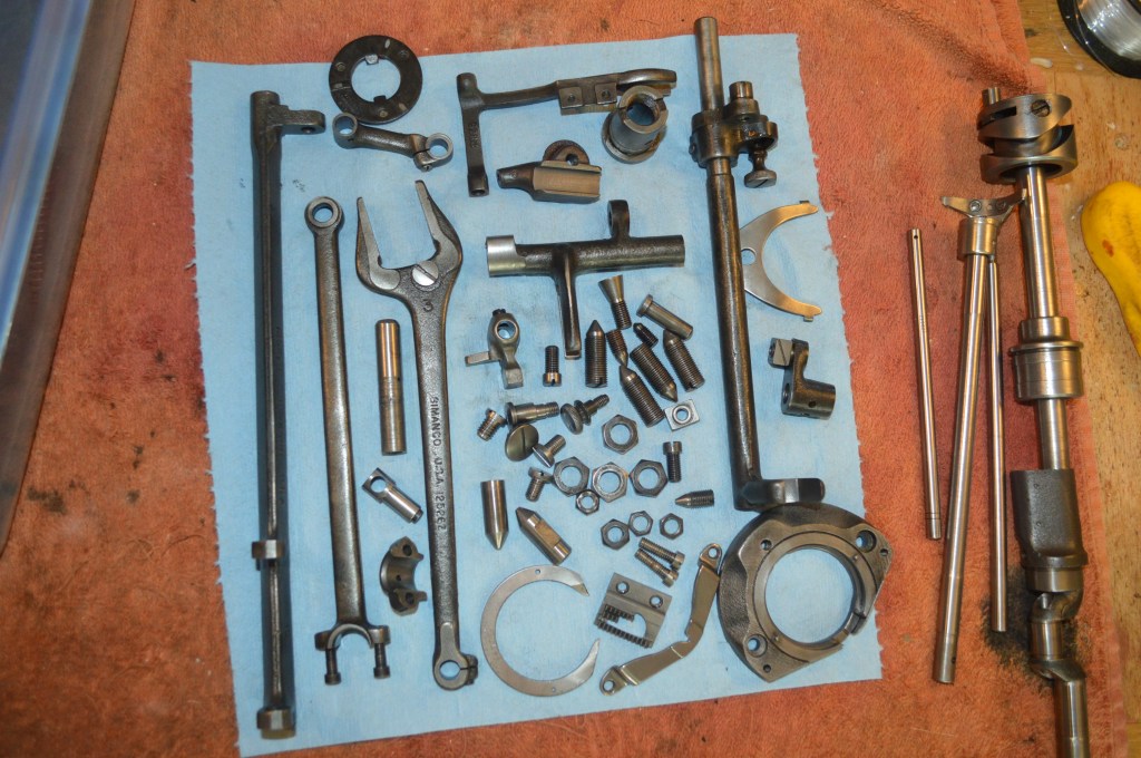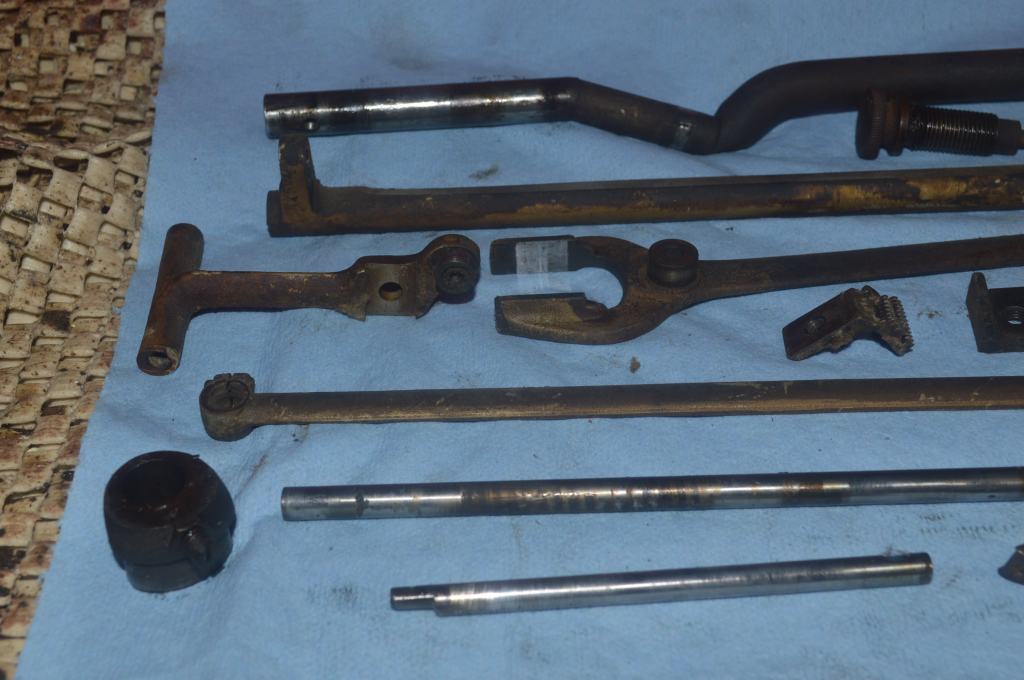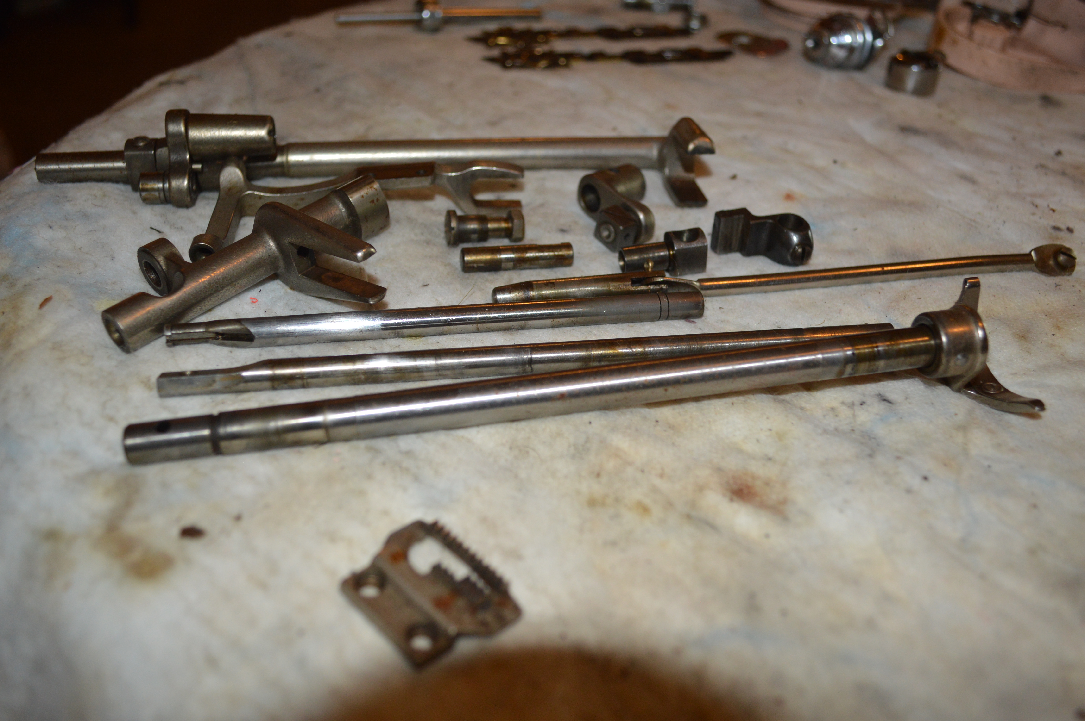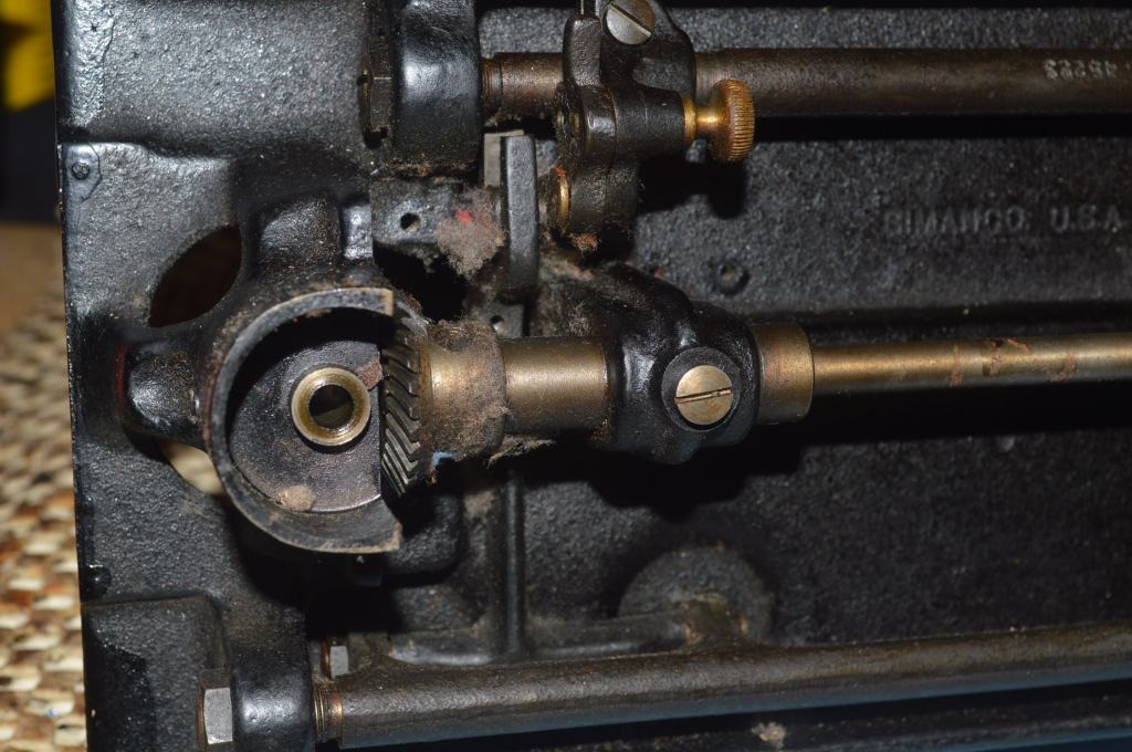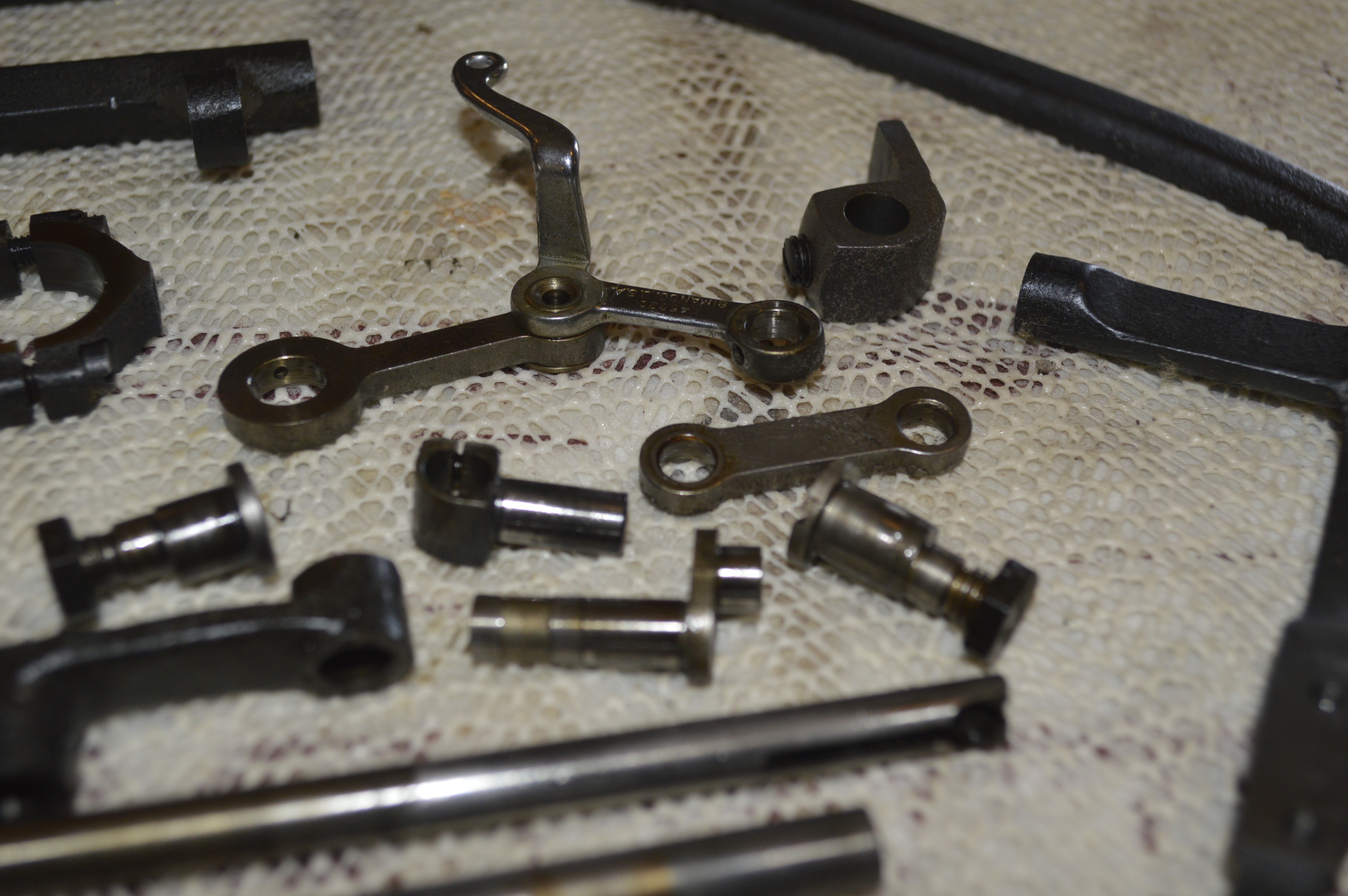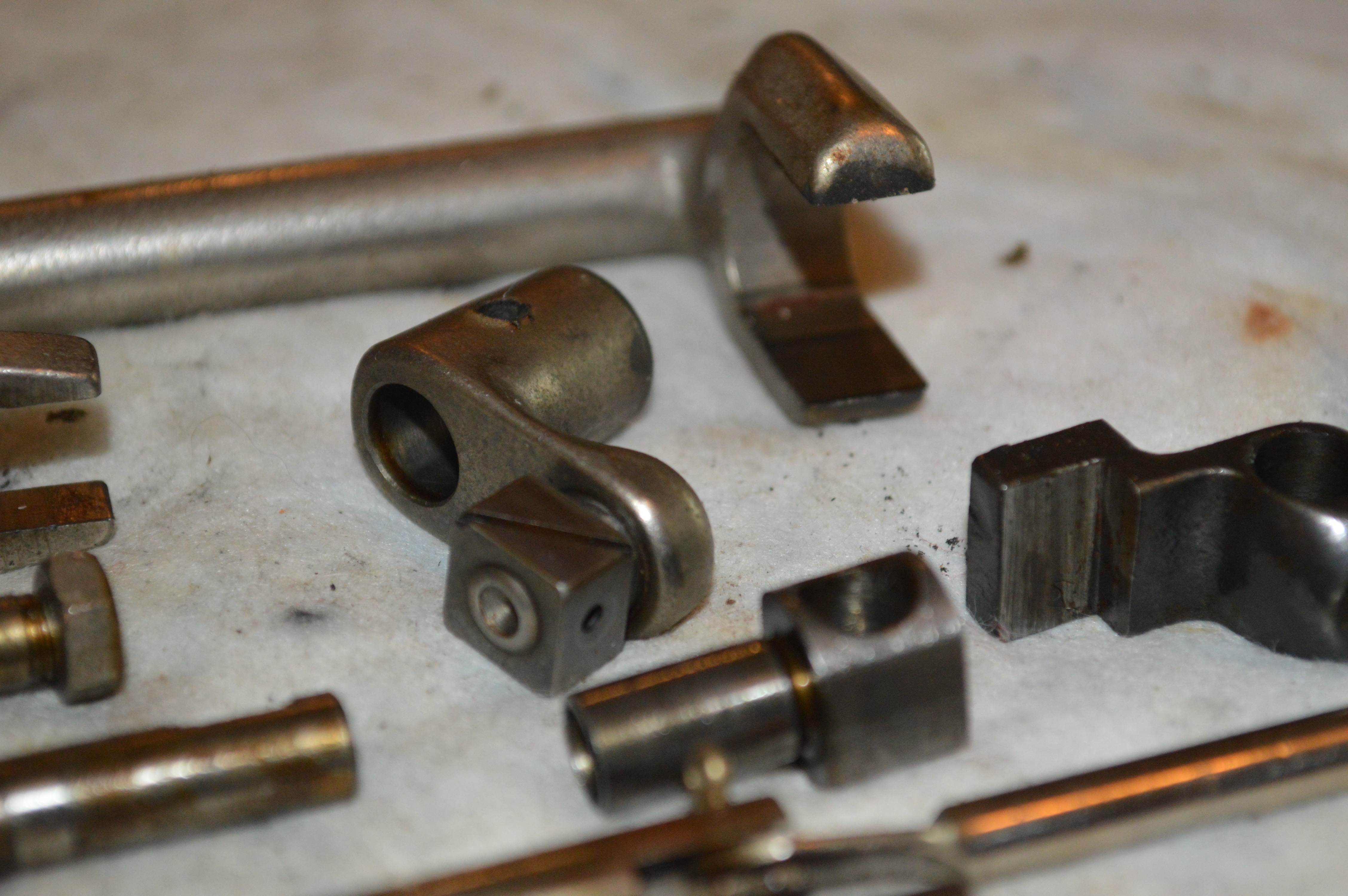 All of those likages fit together and are attached to a single bolt on the machine deep in the pillar cavity. I thought about it long and hard and decide that if I removed these assemblies I may never get them back together and in place. Rather than risk this, I decided to clean them in place. Luckily, the arm shaft turns smoothly and I can work around its removal.