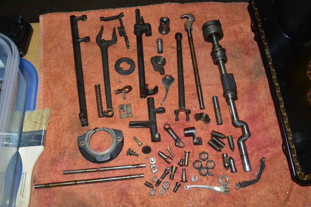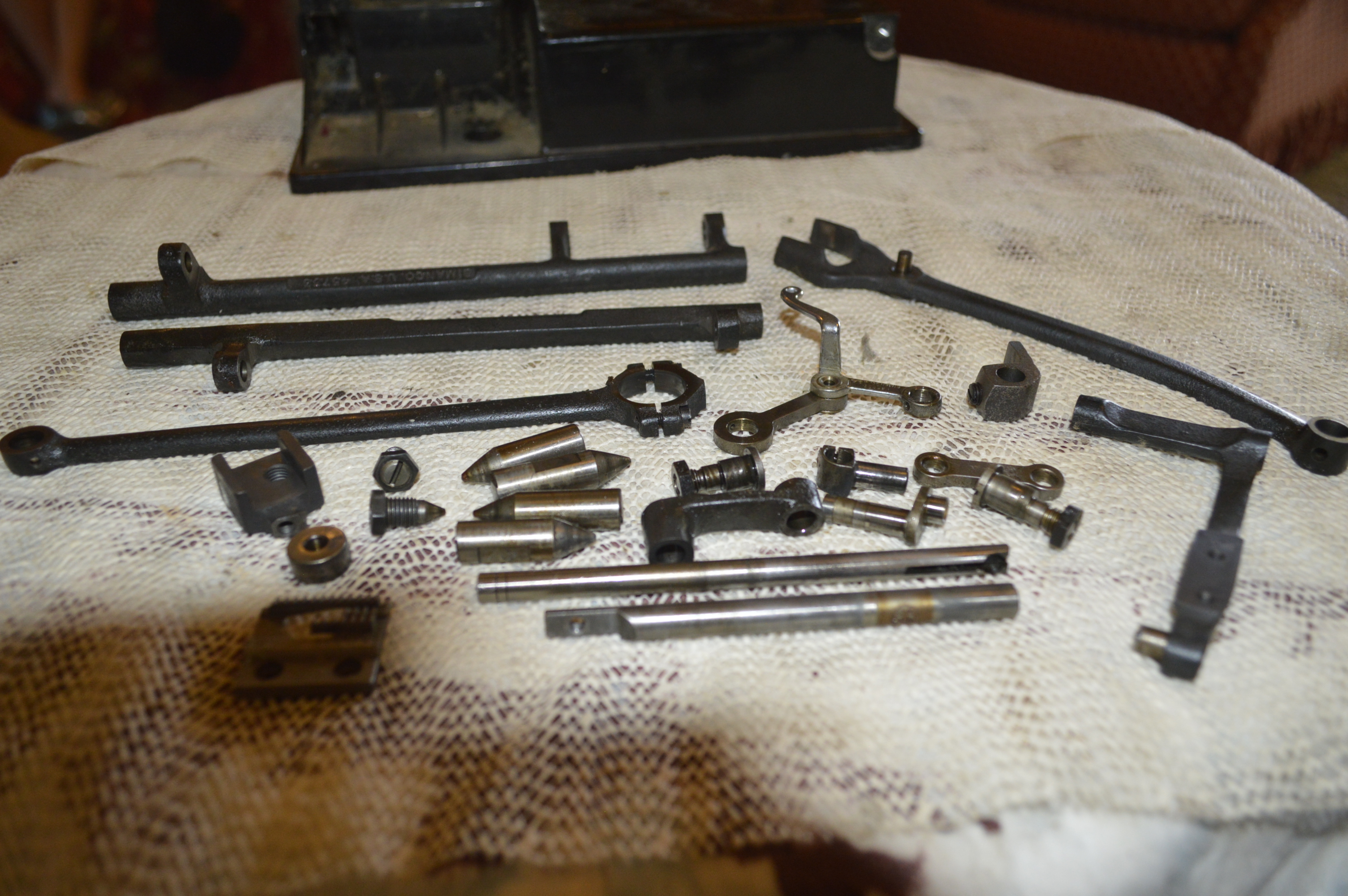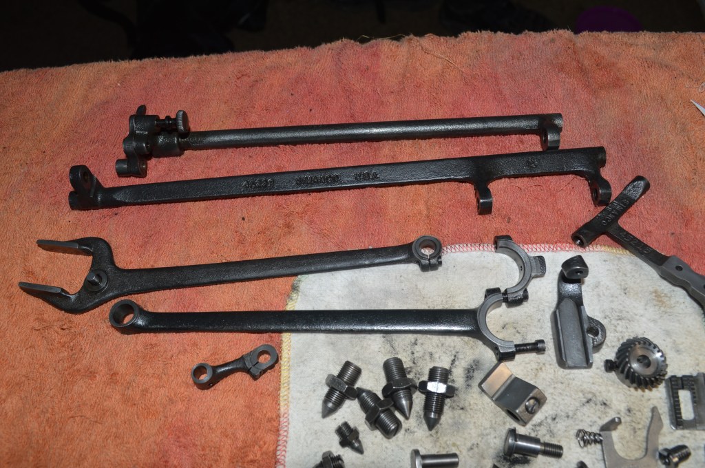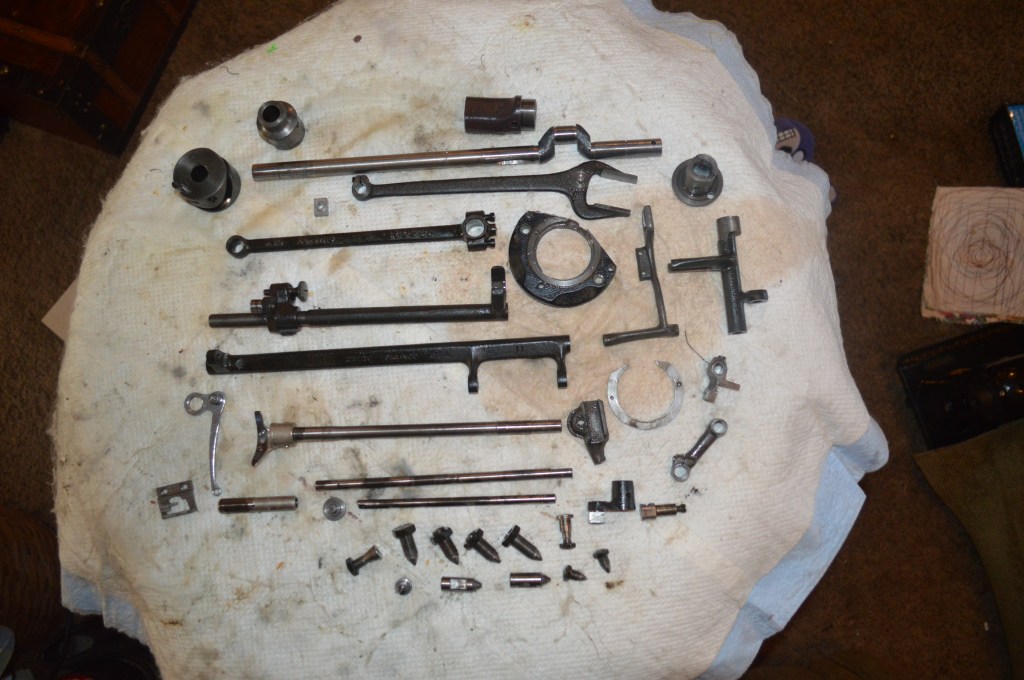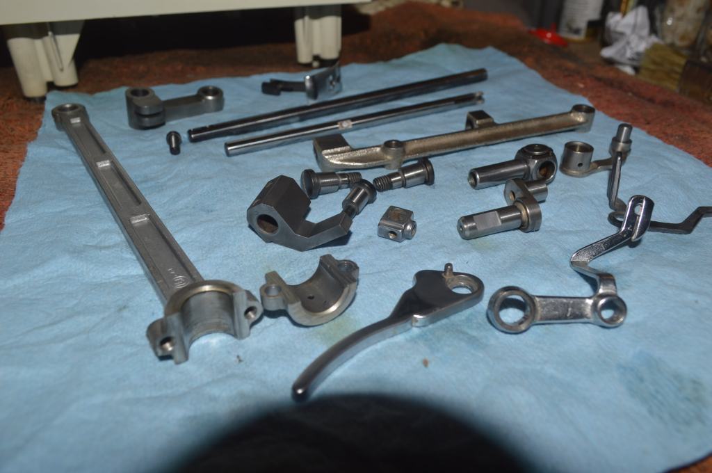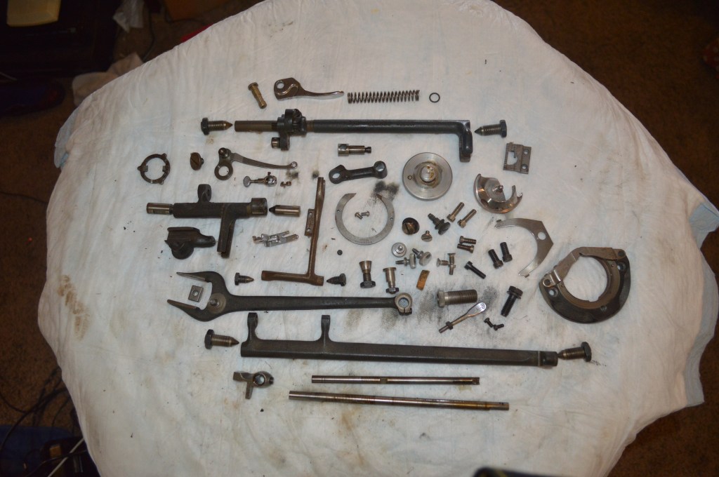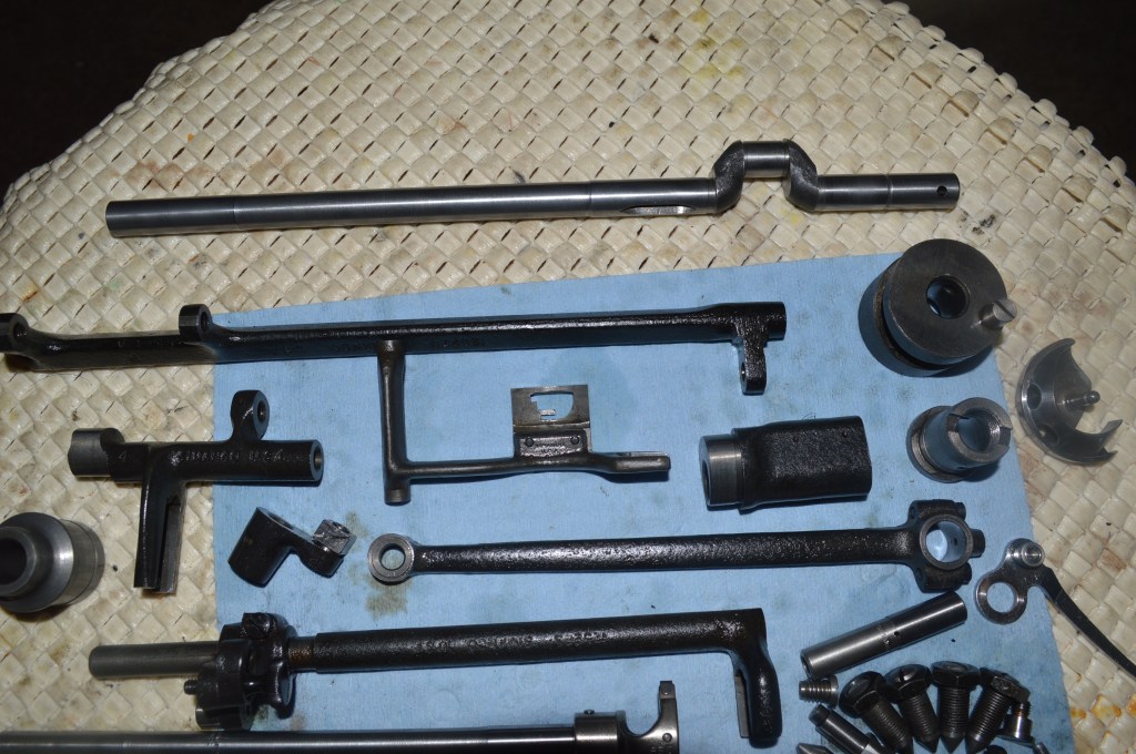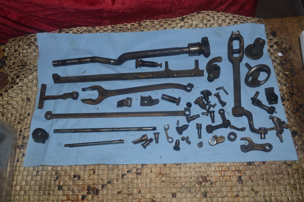 All of those likages fit together and are attached to a single bolt on the machine deep in the pillar cavity. I thought about it long and hard and decide that if I removed these assemblies I may never get them back together and in place. Rather than risk this, I decided to clean them in place. Luckily, the arm shaft turns smoothly and I can work around its removal.