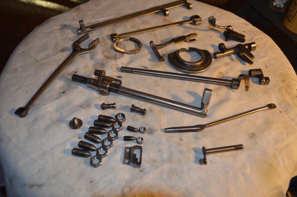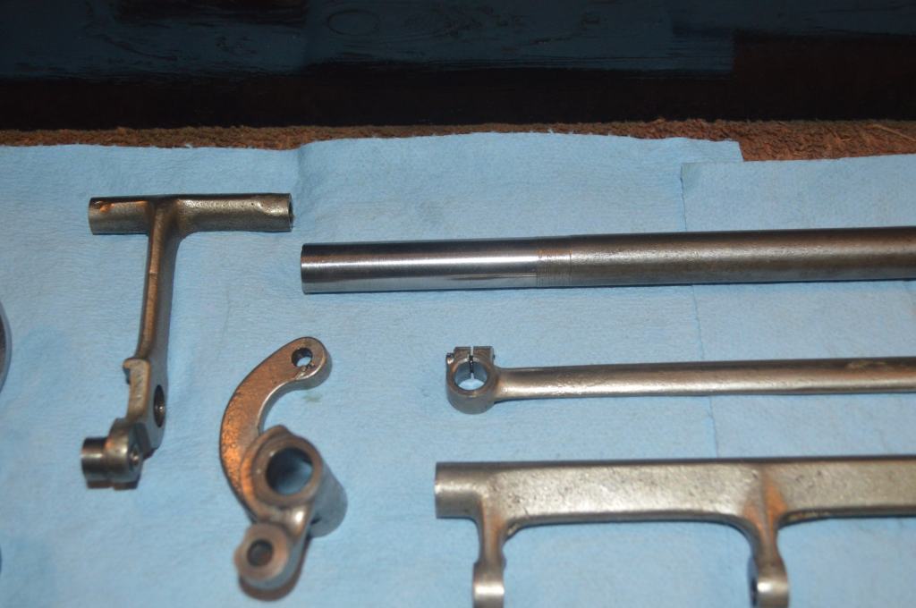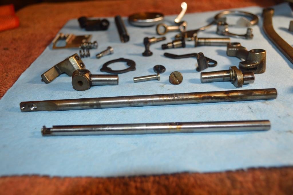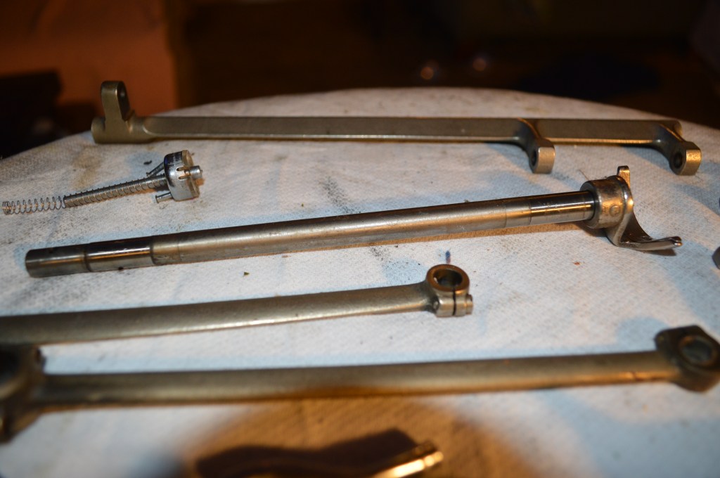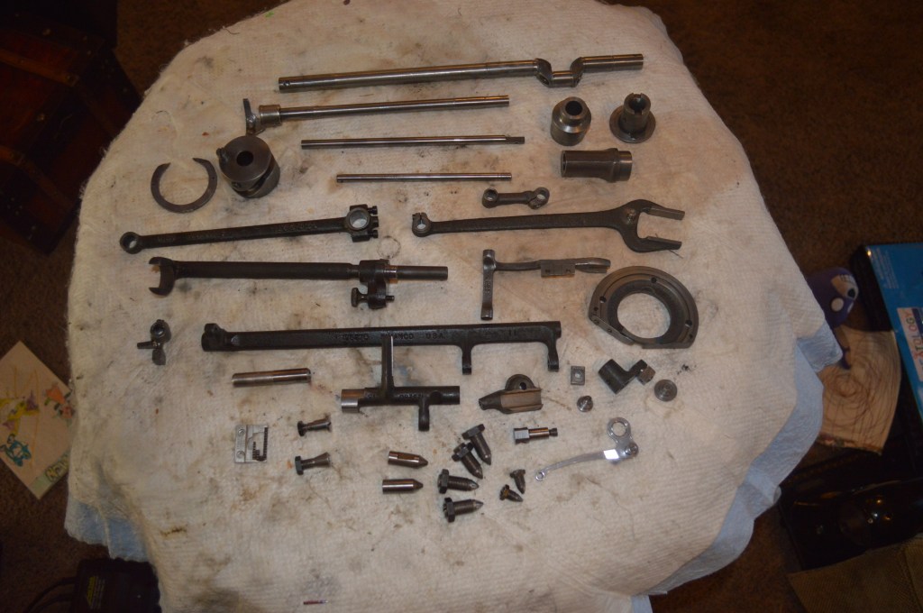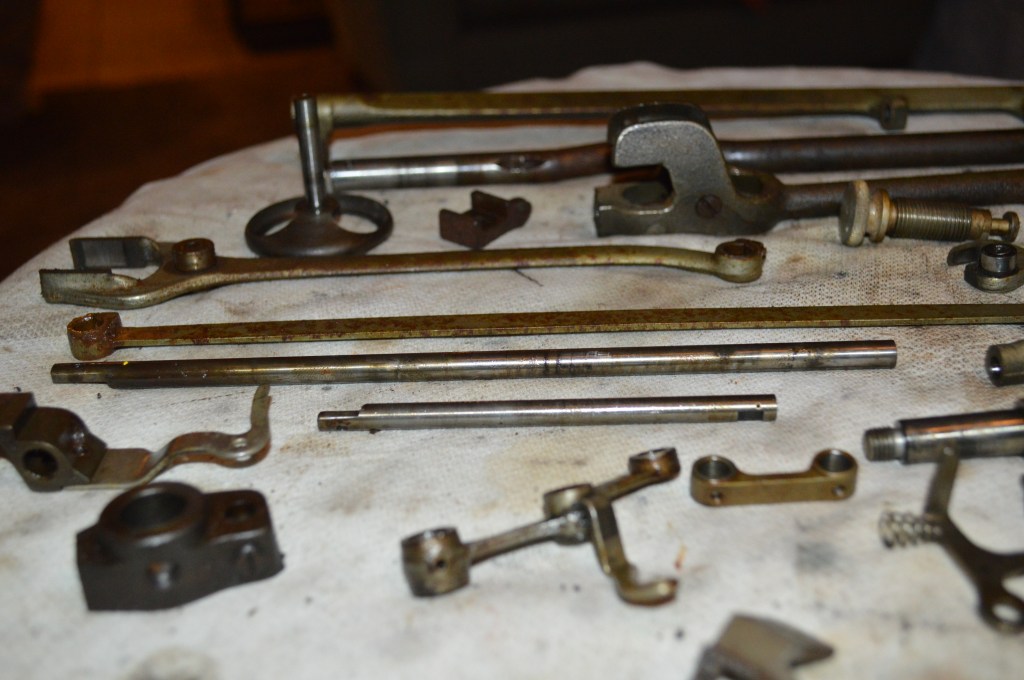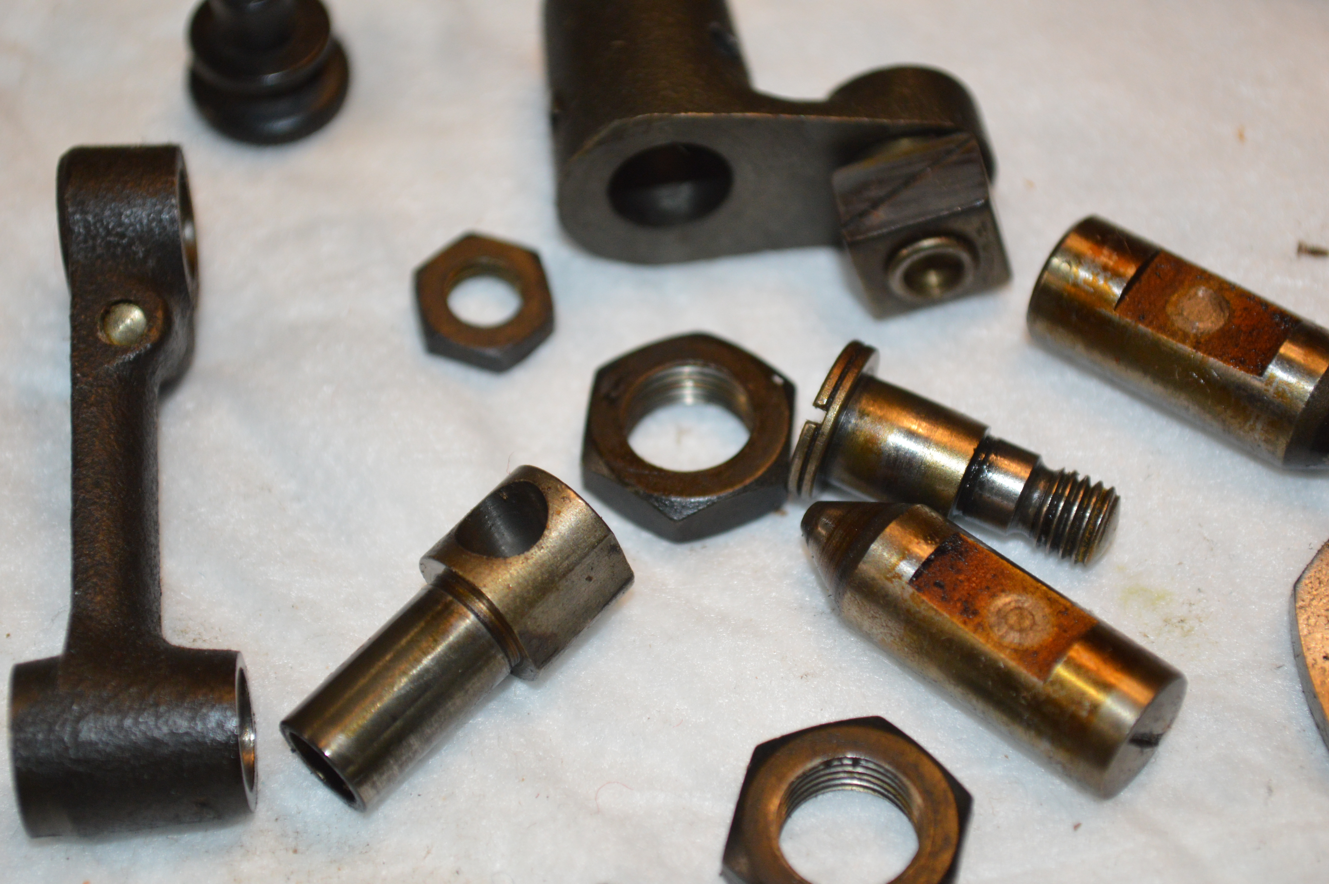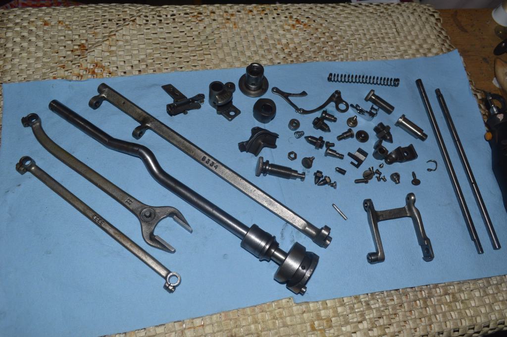 All of those likages fit together and are attached to a single bolt on the machine deep in the pillar cavity. I thought about it long and hard and decide that if I removed these assemblies I may never get them back together and in place. Rather than risk this, I decided to clean them in place. Luckily, the arm shaft turns smoothly and I can work around its removal.
