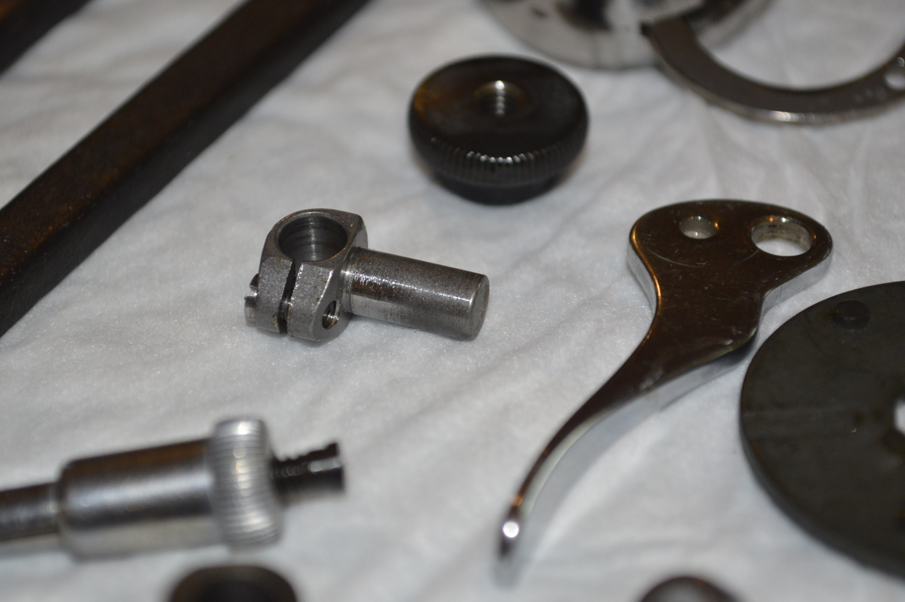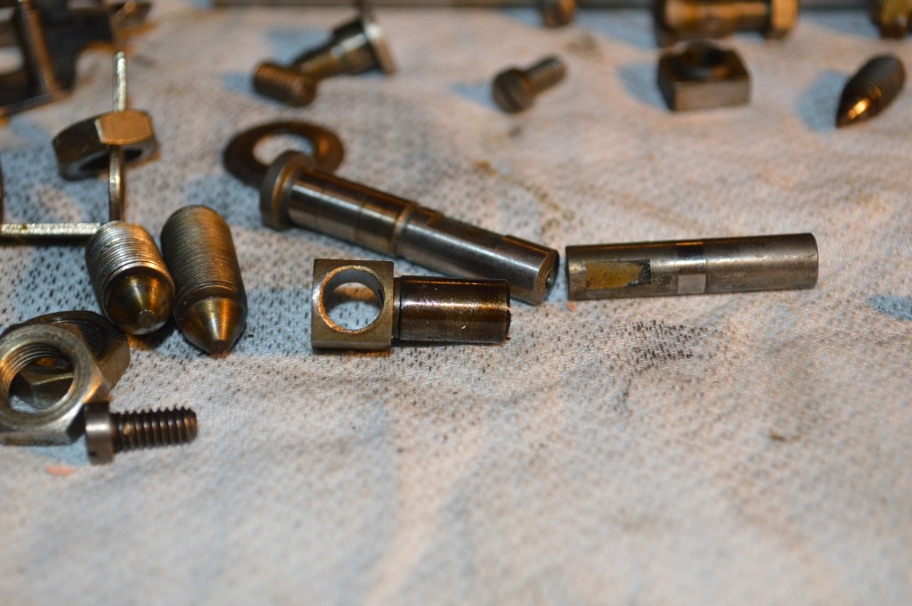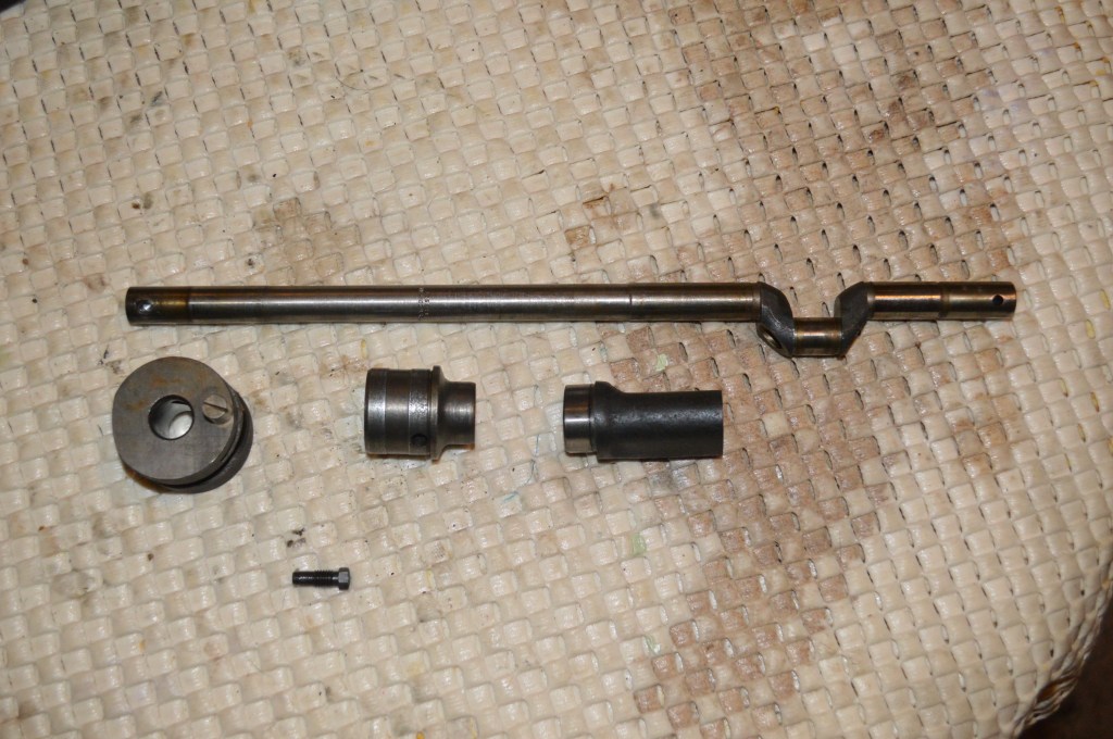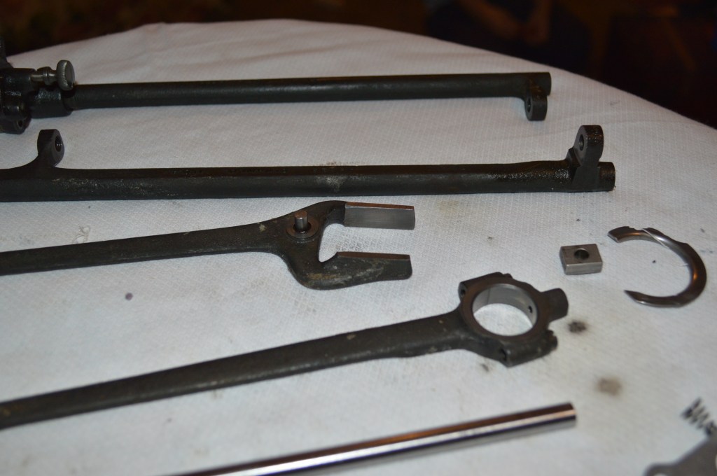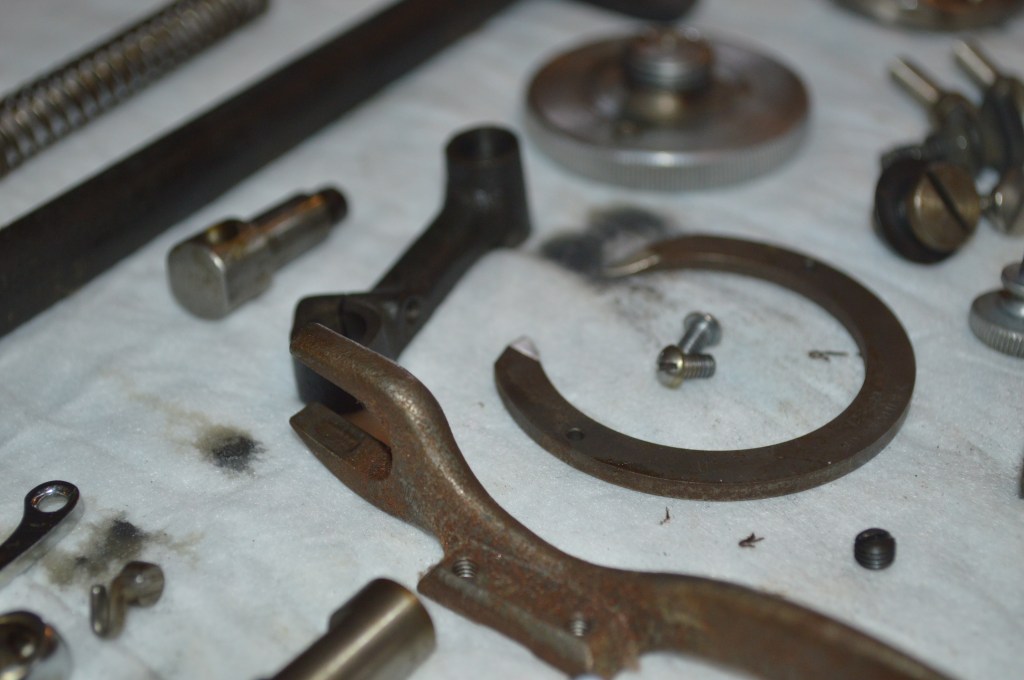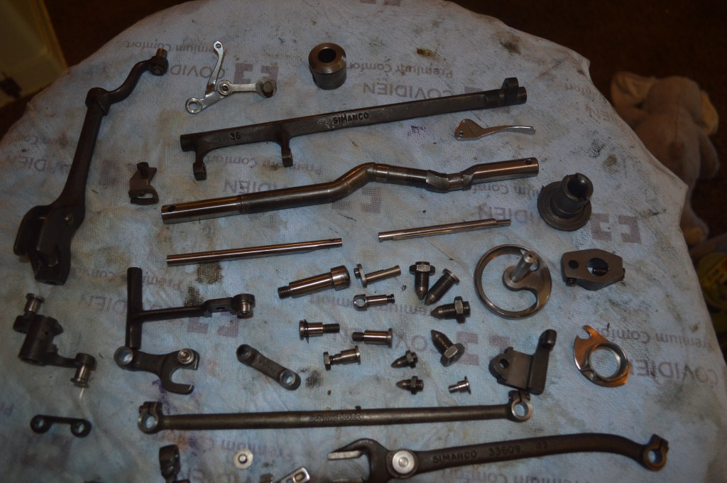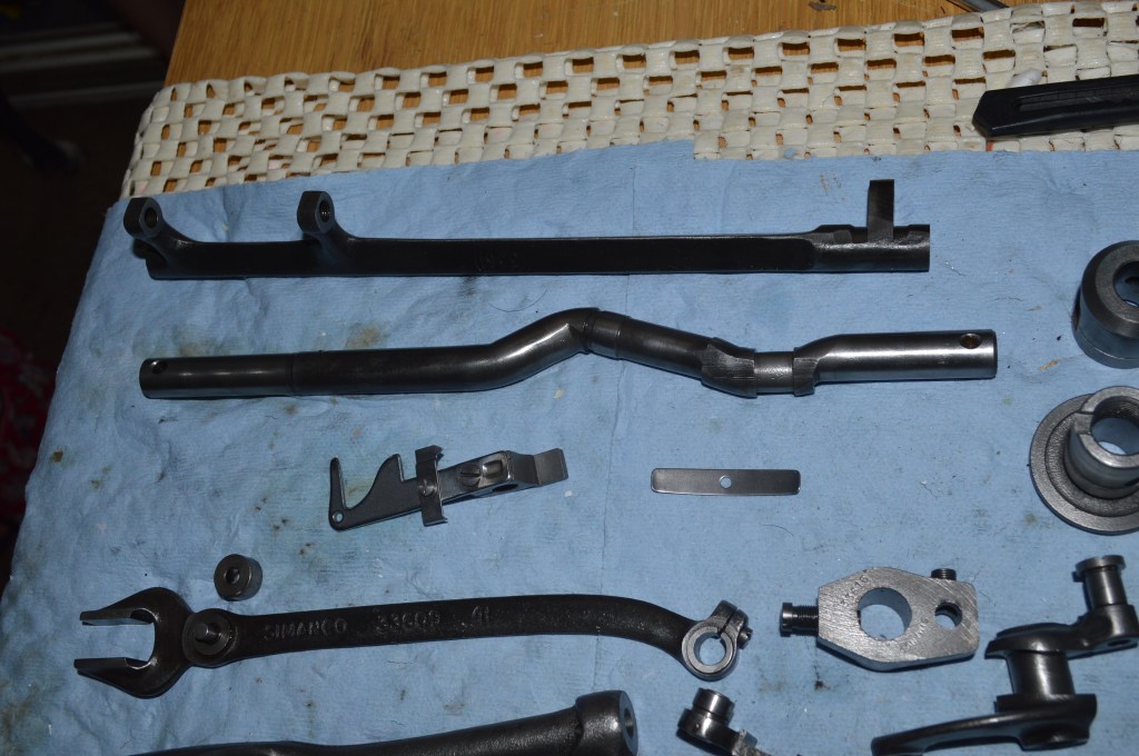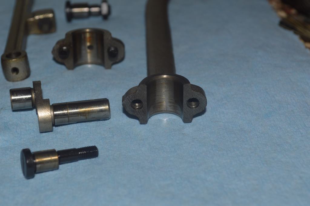 All of those likages fit together and are attached to a single bolt on the machine deep in the pillar cavity. I thought about it long and hard and decide that if I removed these assemblies I may never get them back together and in place. Rather than risk this, I decided to clean them in place. Luckily, the arm shaft turns smoothly and I can work around its removal.