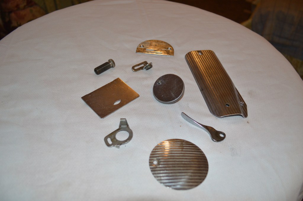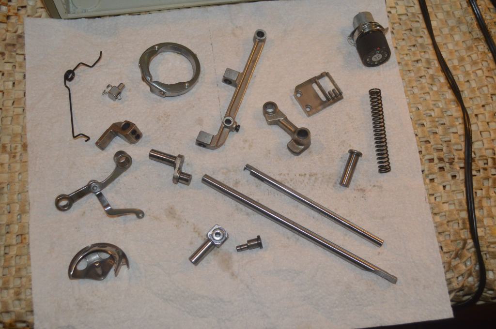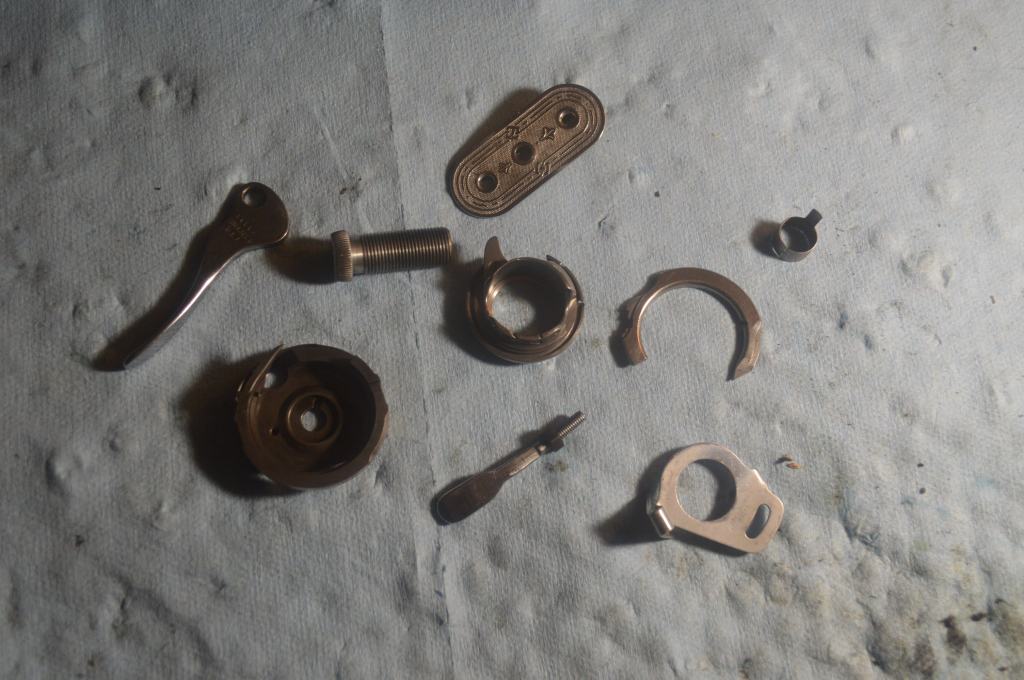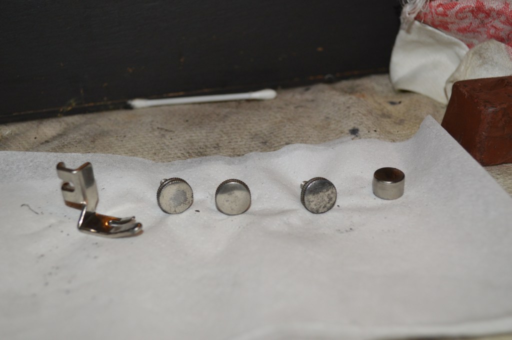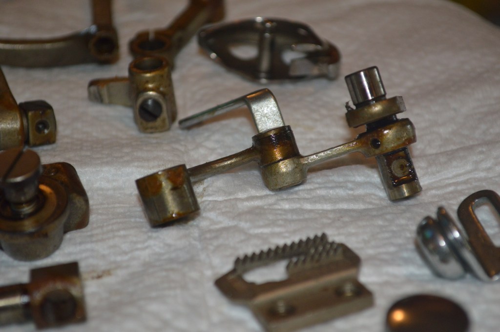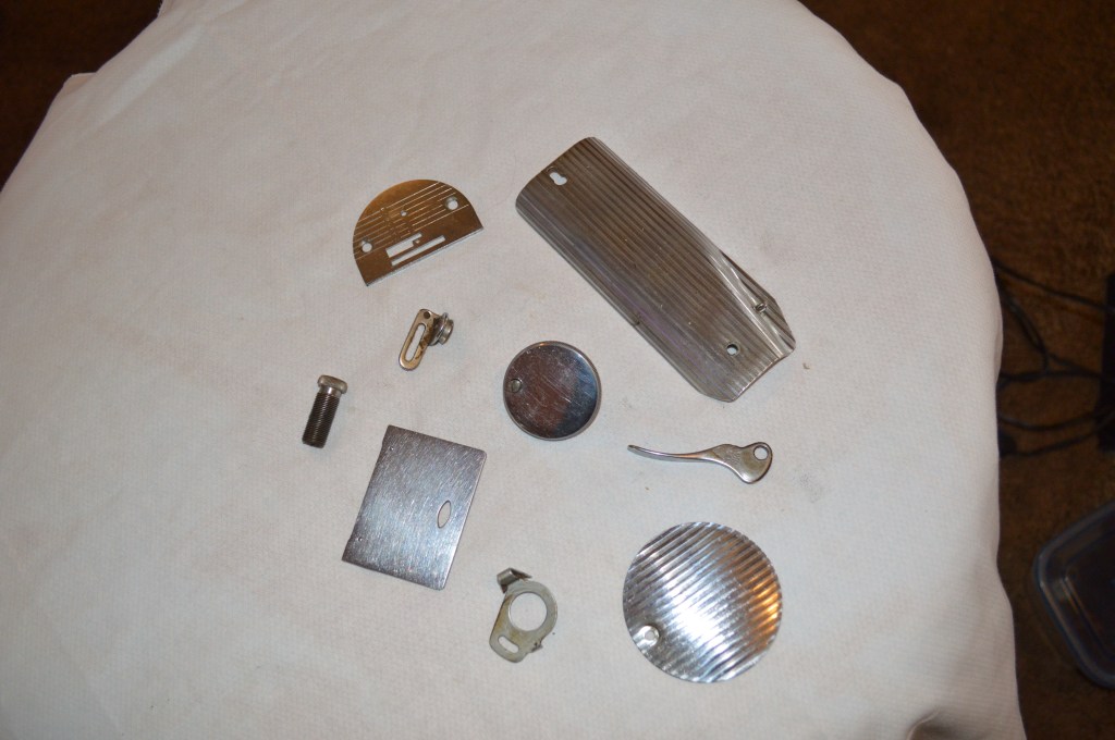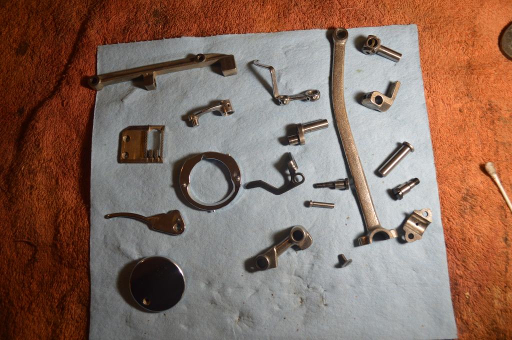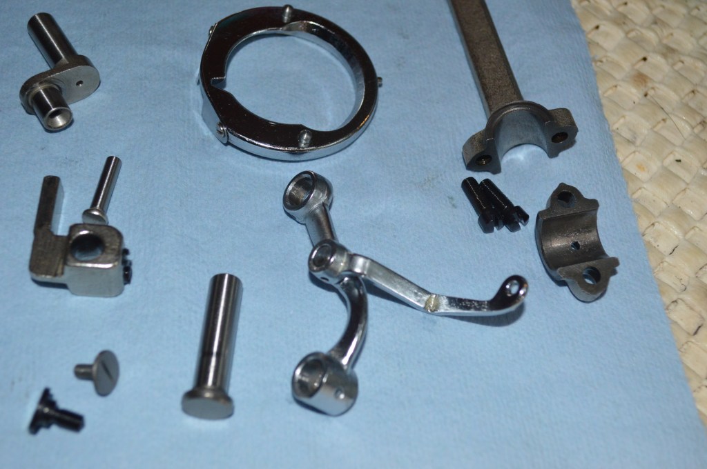 The large plated pieces are cleaned and then polished. Taking pictures of polished pieces isn’t easy, so you will see them shine on the assembled machine! Sorry, but it is worth the wait… The same goes for the little pieces like the stitch length lever, bobbin winder guide, and other little bits and pieces.