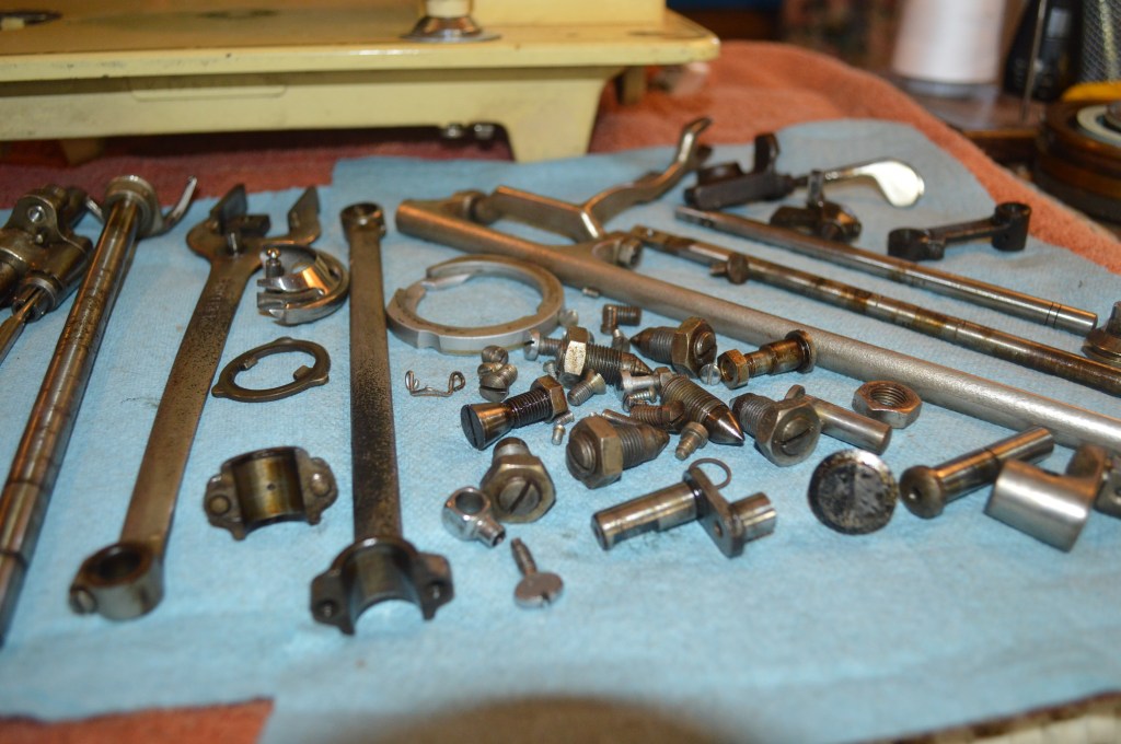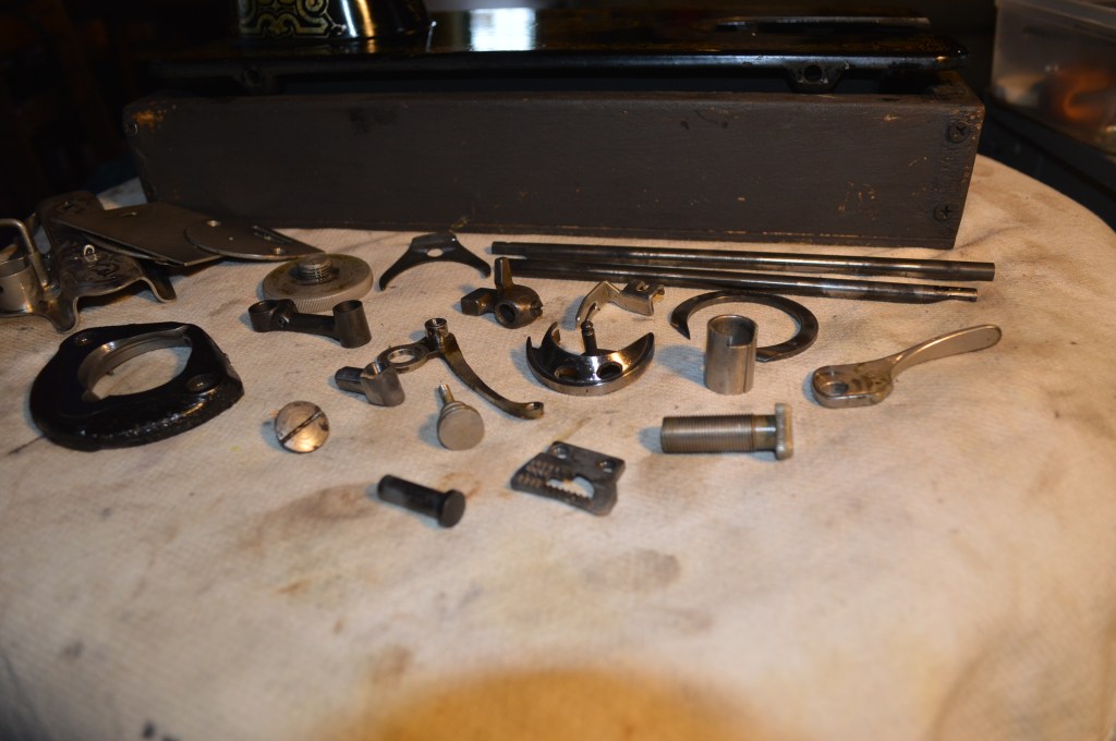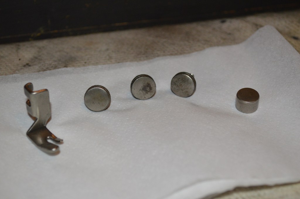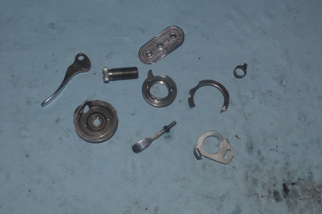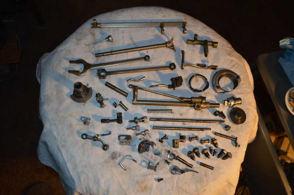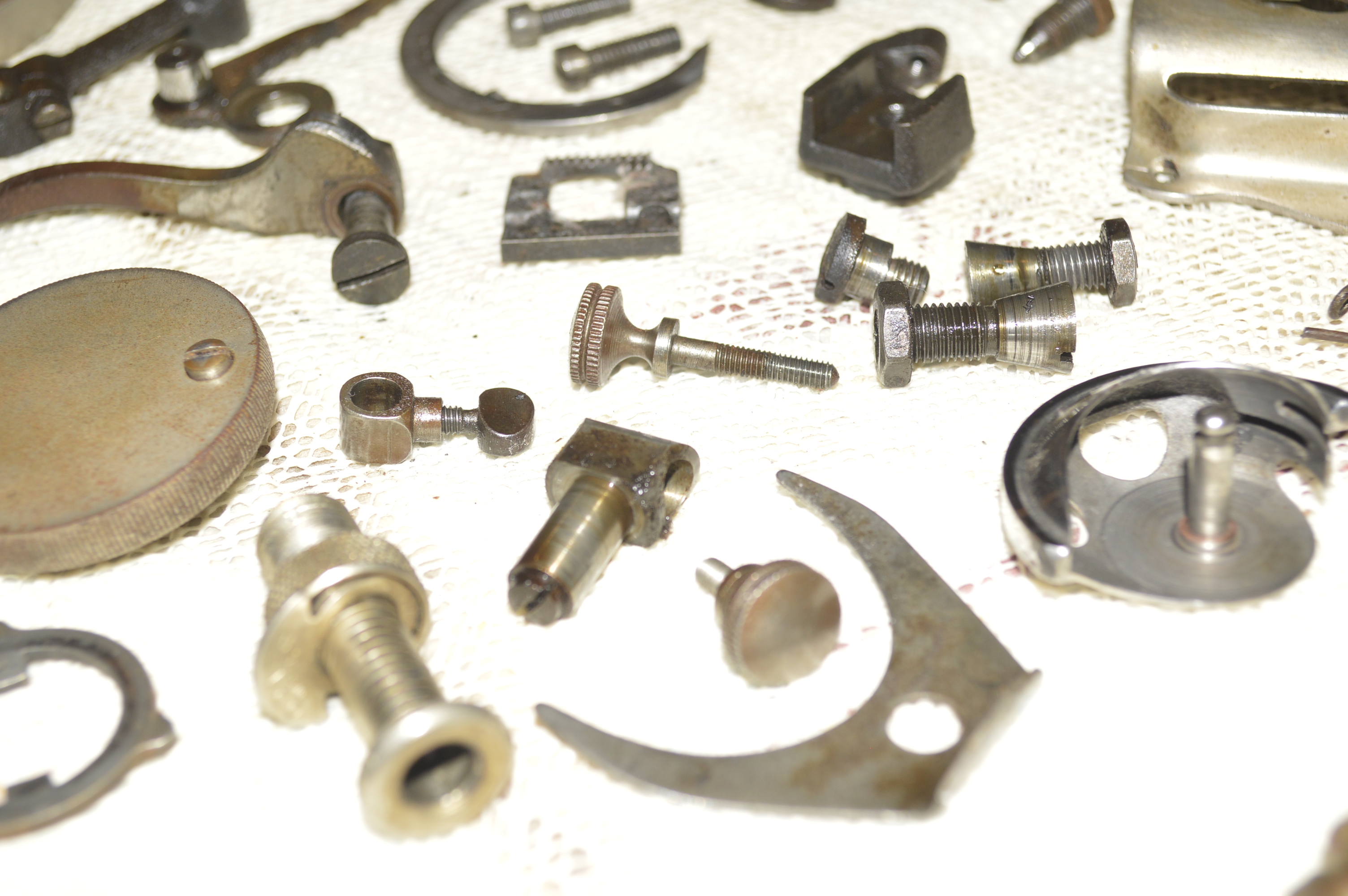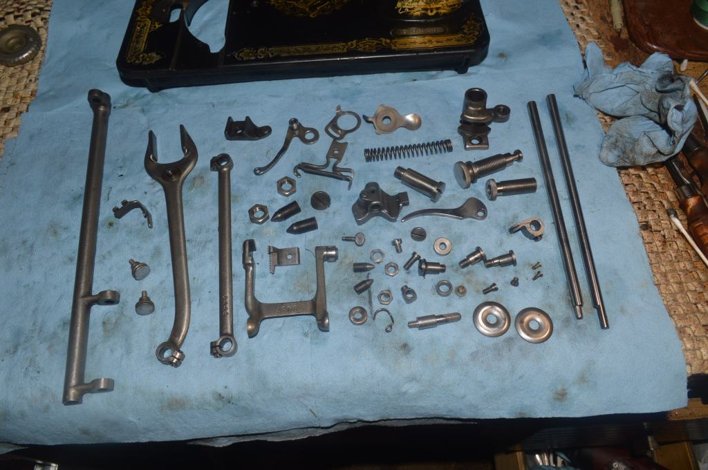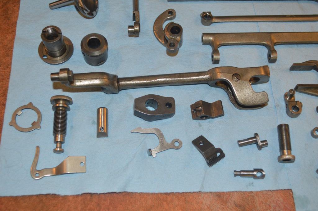 The large plated pieces are cleaned and then polished. Taking pictures of polished pieces isn’t easy, so you will see them shine on the assembled machine! Sorry, but it is worth the wait… The same goes for the little pieces like the stitch length lever, bobbin winder guide, and other little bits and pieces.