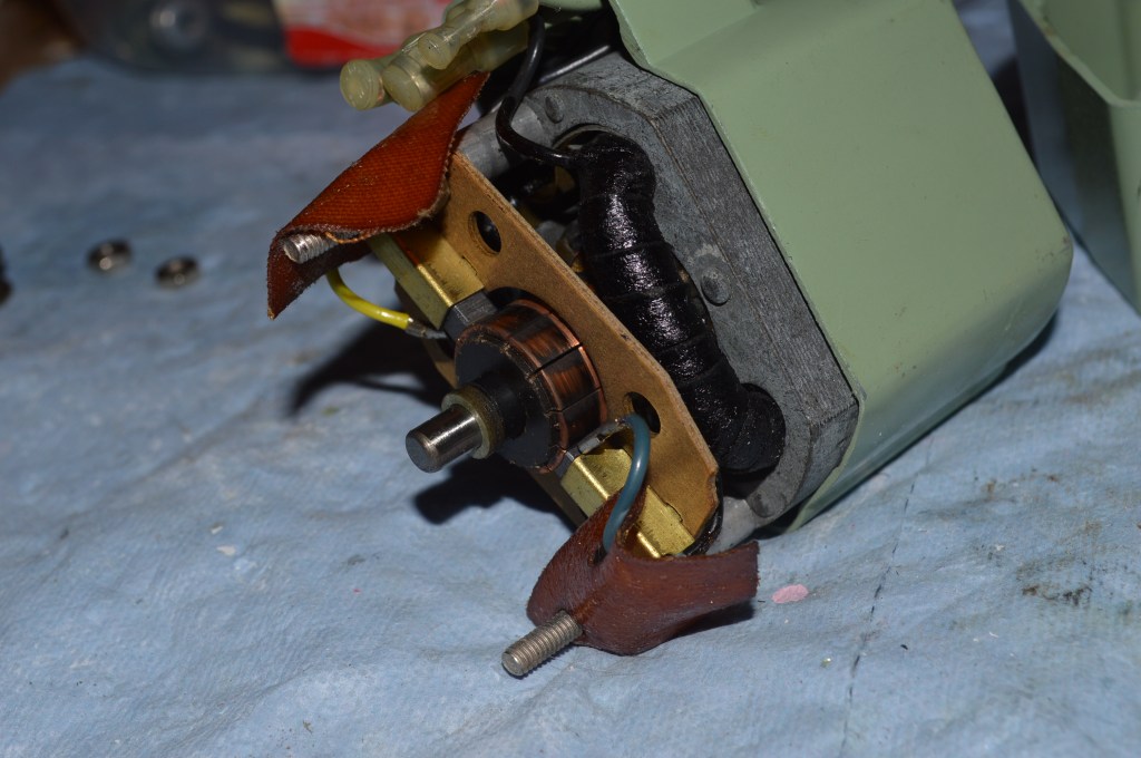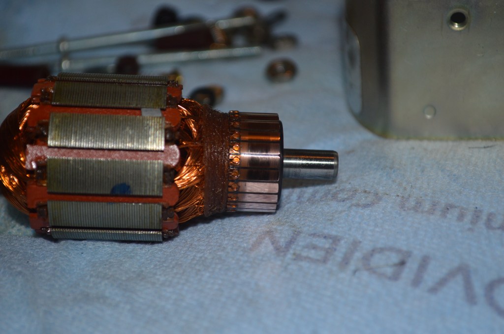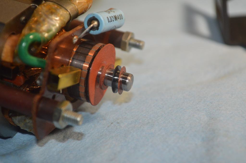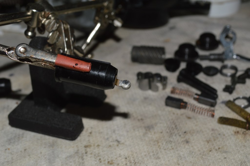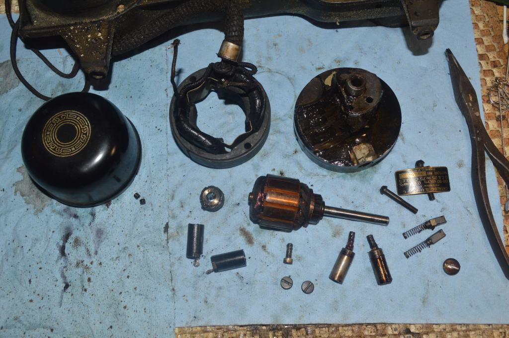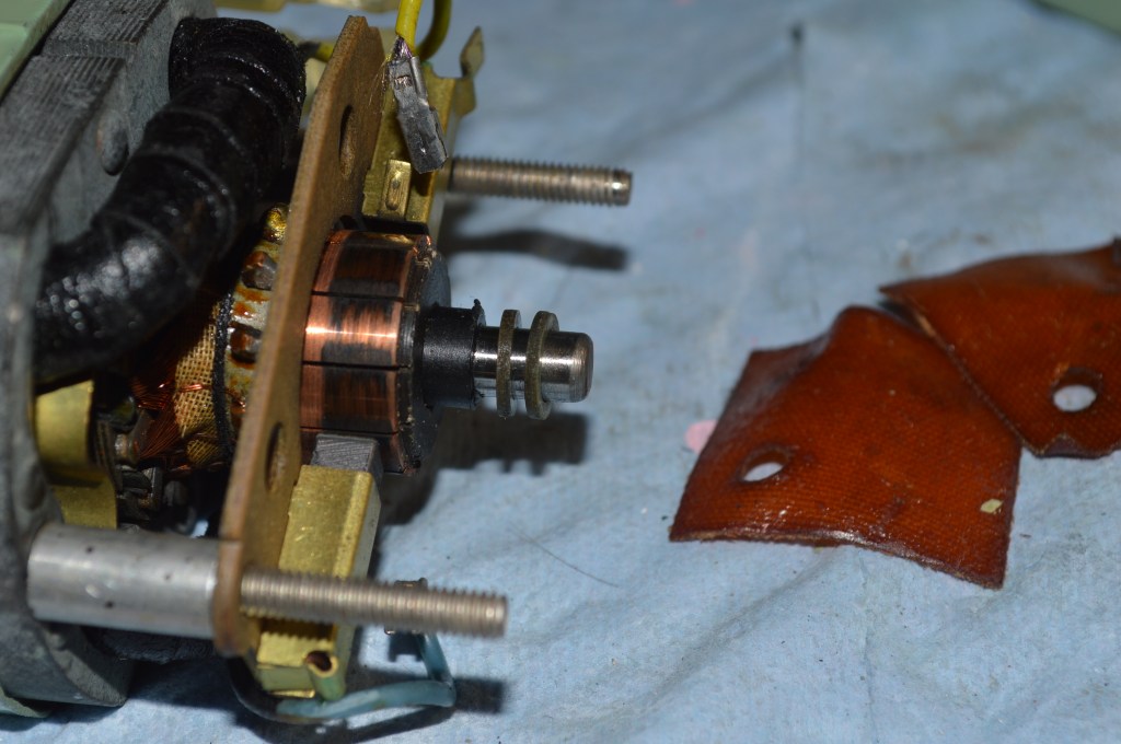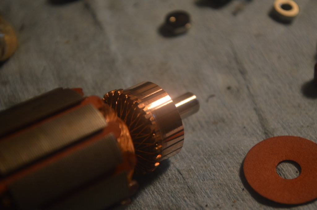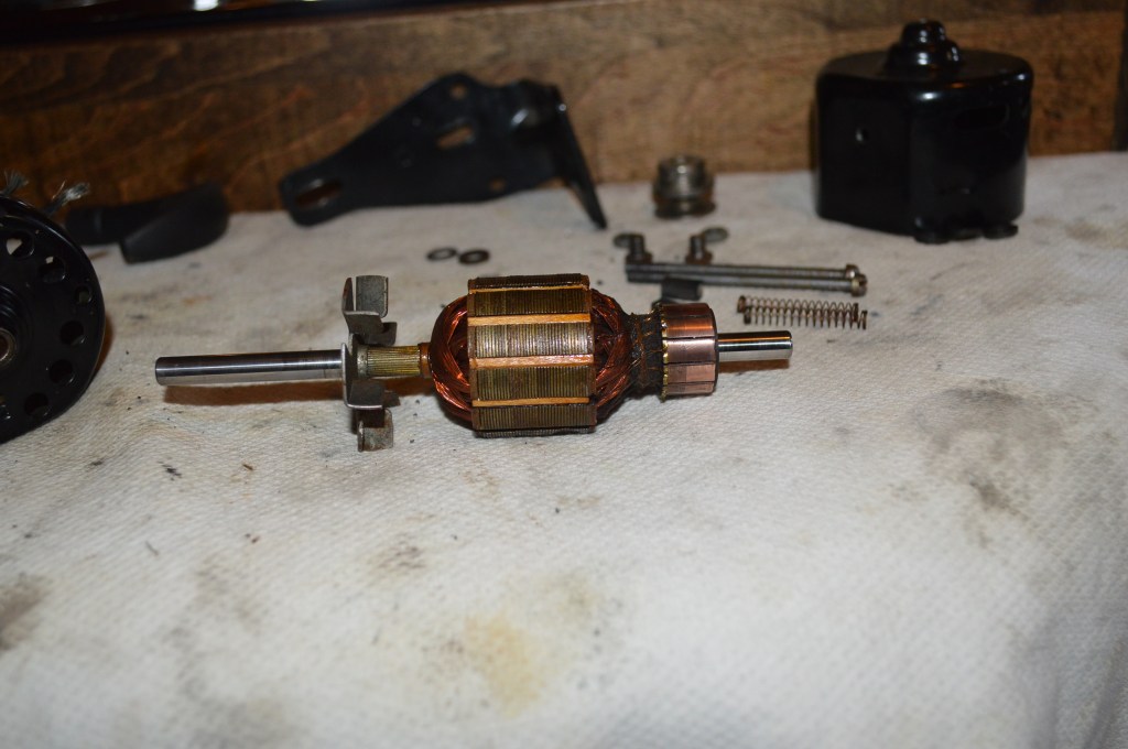 Before reassembly, the brushes are removed and cleaned, the armature and shafts are polished, the motor housings are cleaned on the inside and the oil wicks are recharged. The main wires are attached and soldered to the brush tubes. After reassembly, paint chips on the motor housing are corrected with paint match paint.