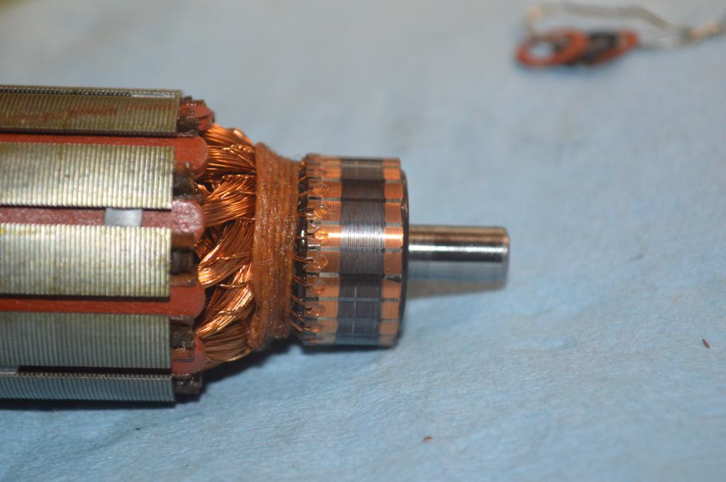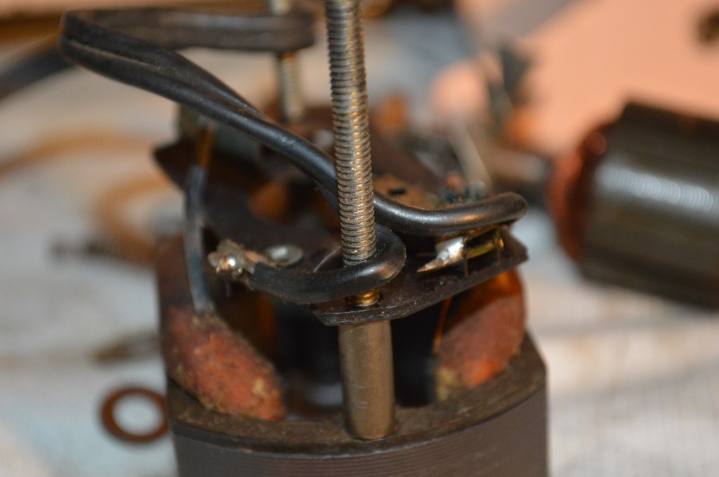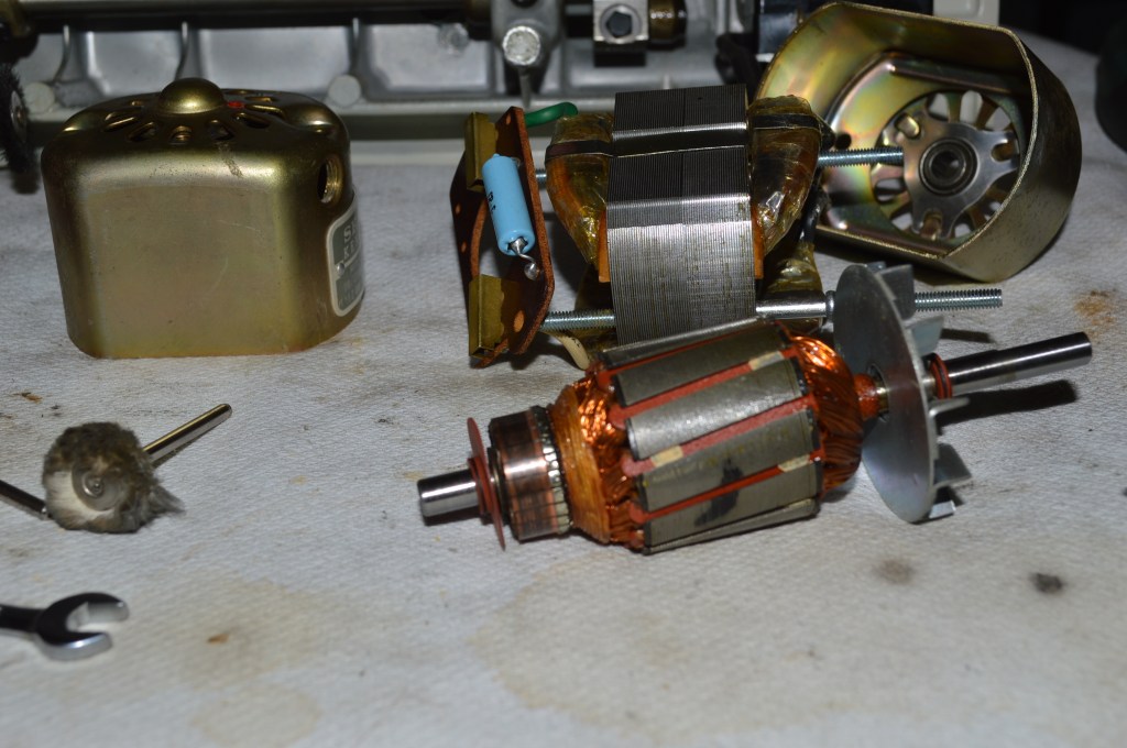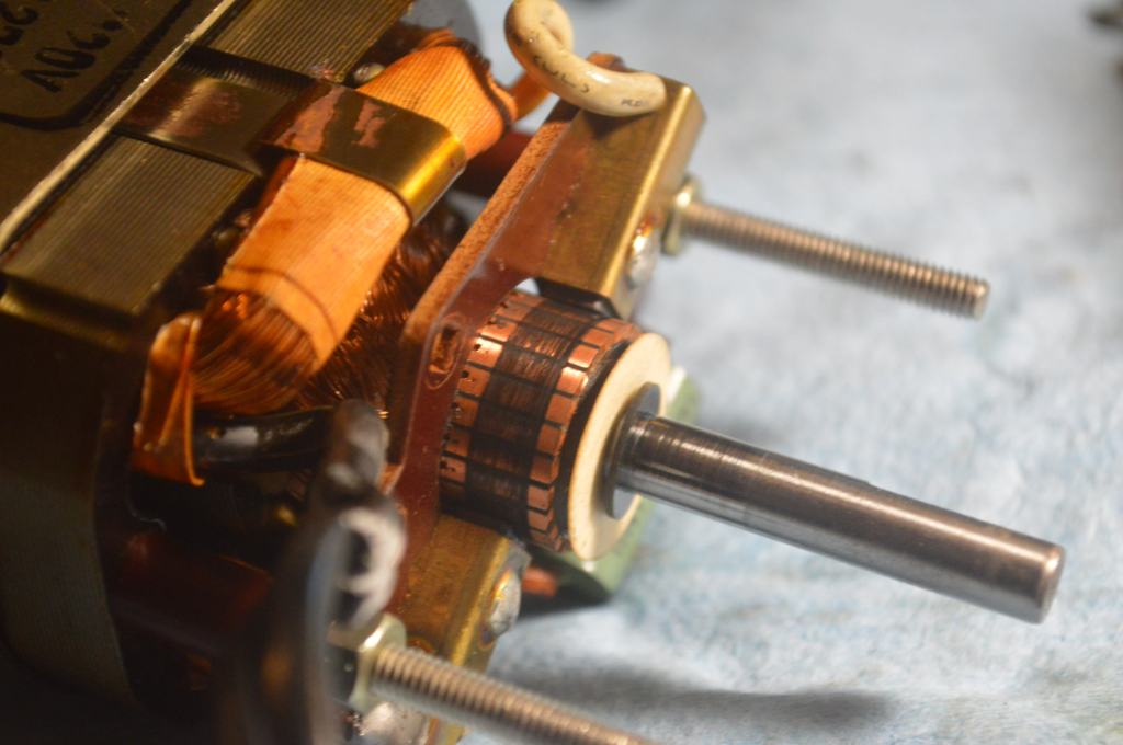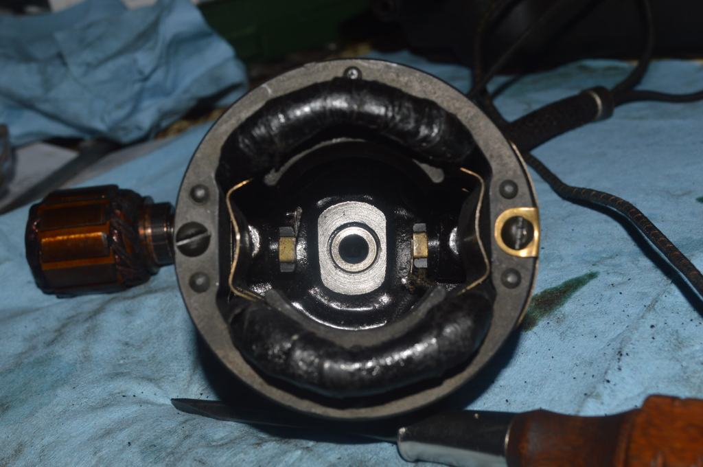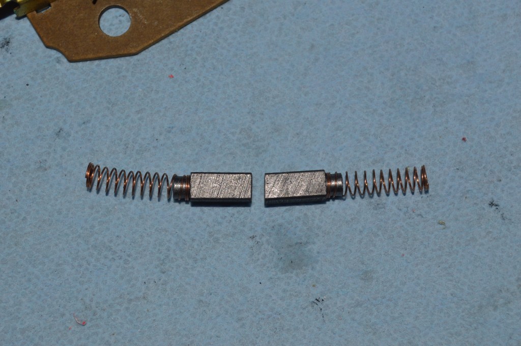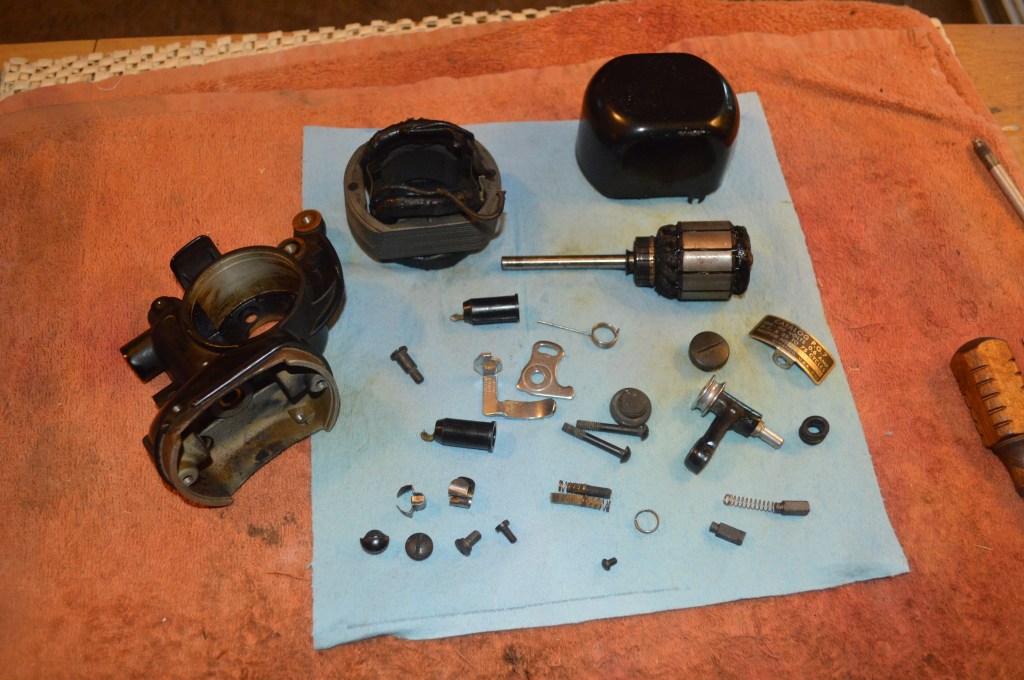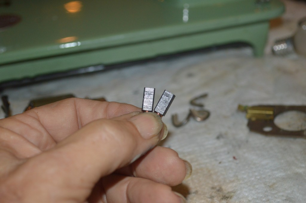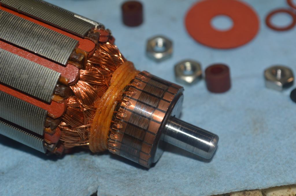 Before reassembly, the brushes are removed and cleaned, the armature and shafts are polished, the motor housings are cleaned on the inside and the oil wicks are recharged. The main wires are attached and soldered to the brush tubes. After reassembly, paint chips on the motor housing are corrected with paint match paint.