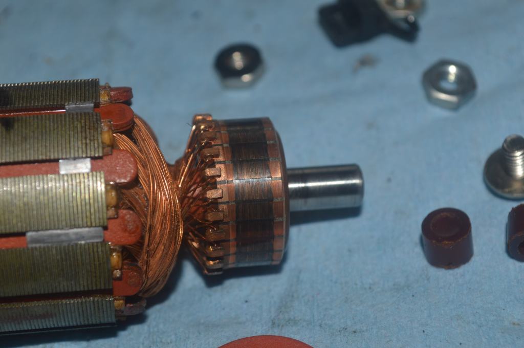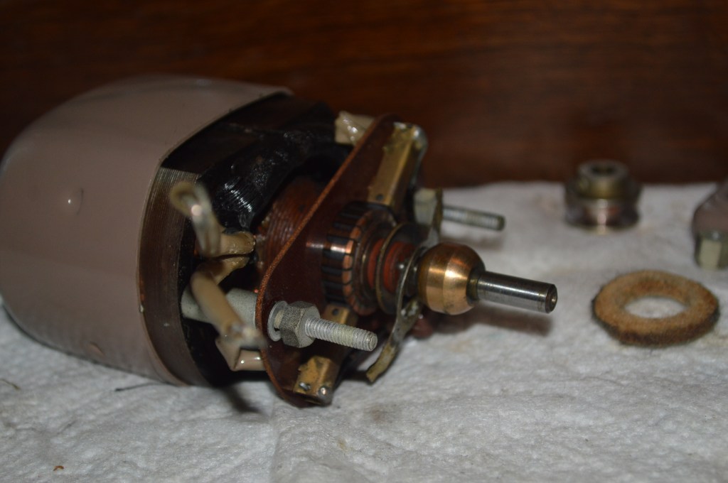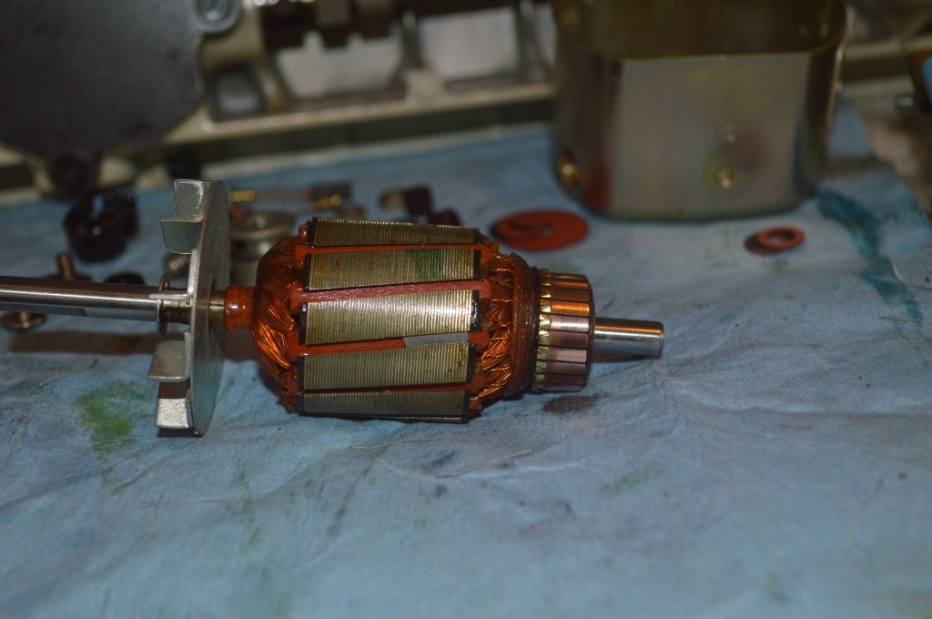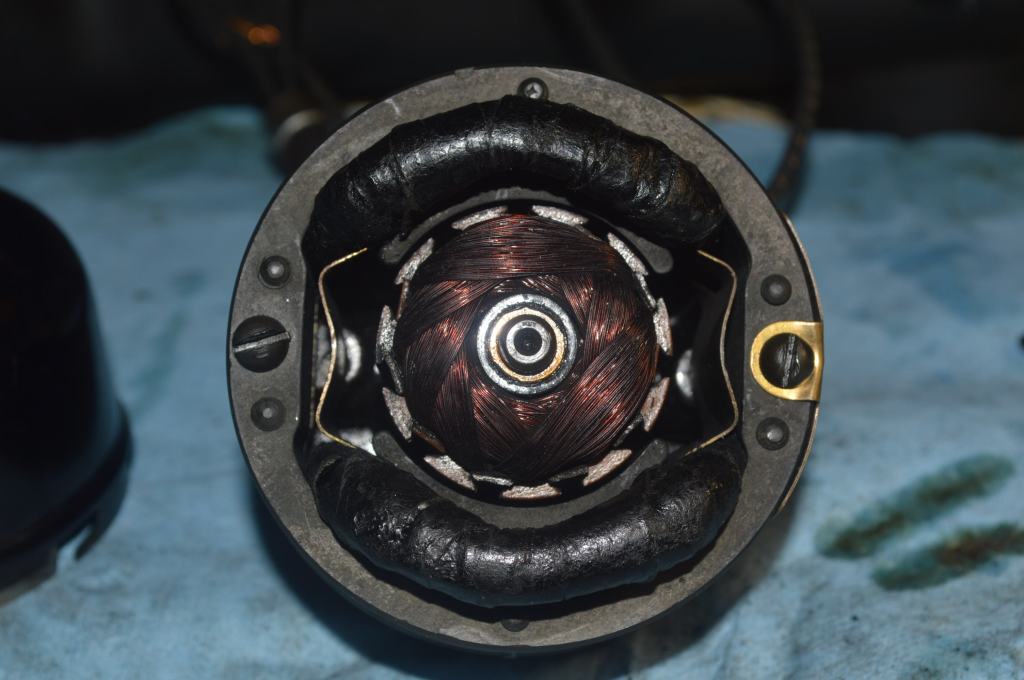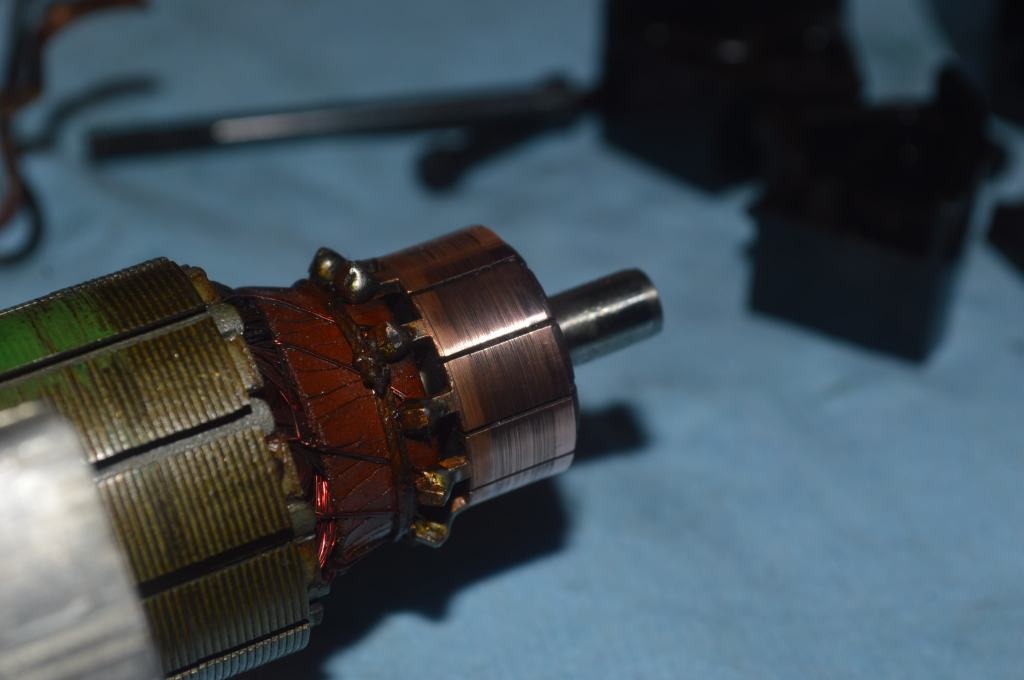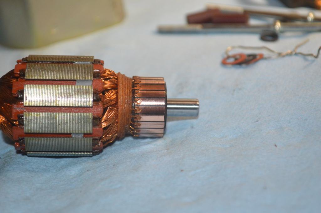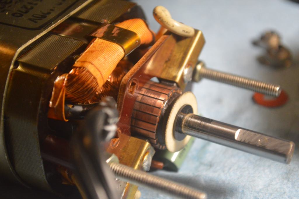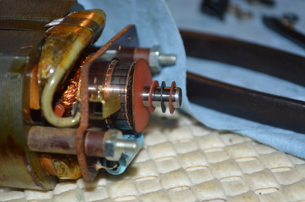 Before reassembly, the brushes are removed and cleaned, the armature and shafts are polished, the motor housings are cleaned on the inside and the oil wicks are recharged. The main wires are attached and soldered to the brush tubes. After reassembly, paint chips on the motor housing are corrected with paint match paint.
