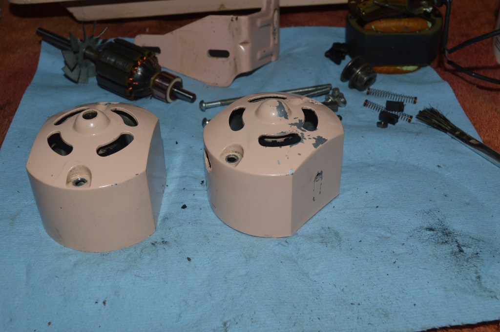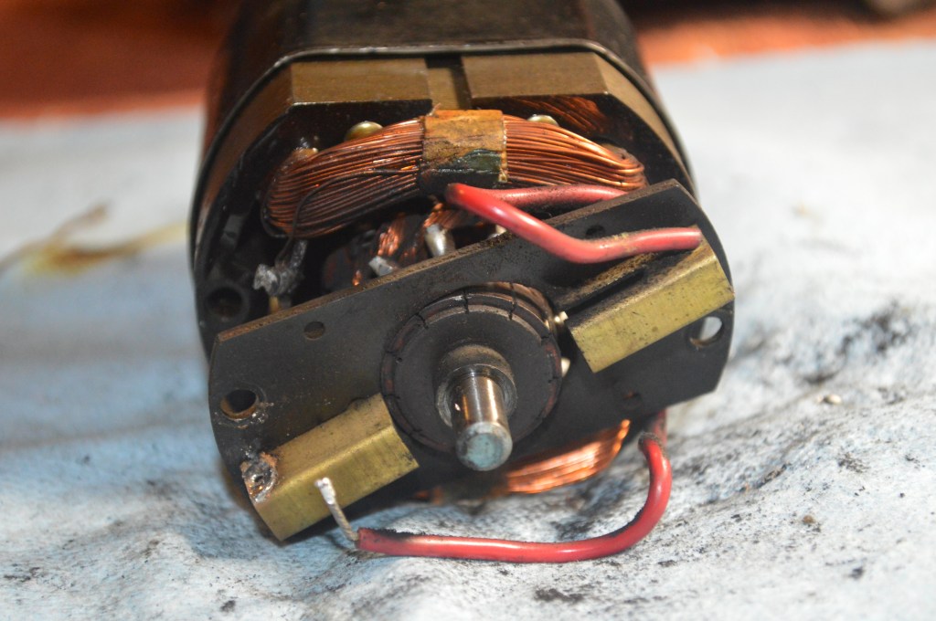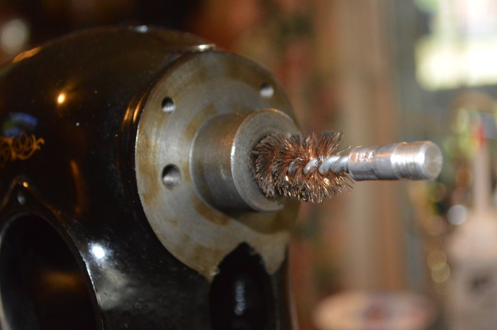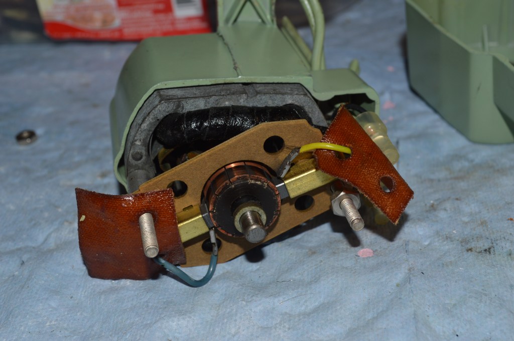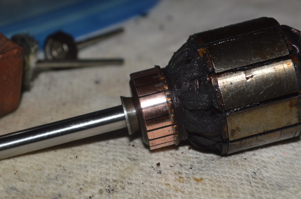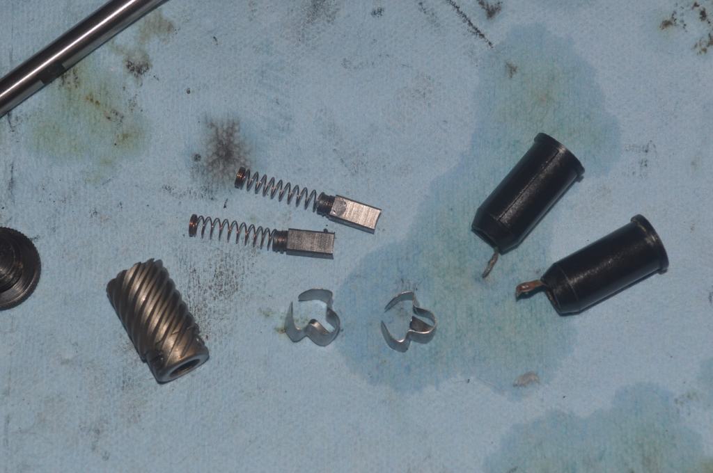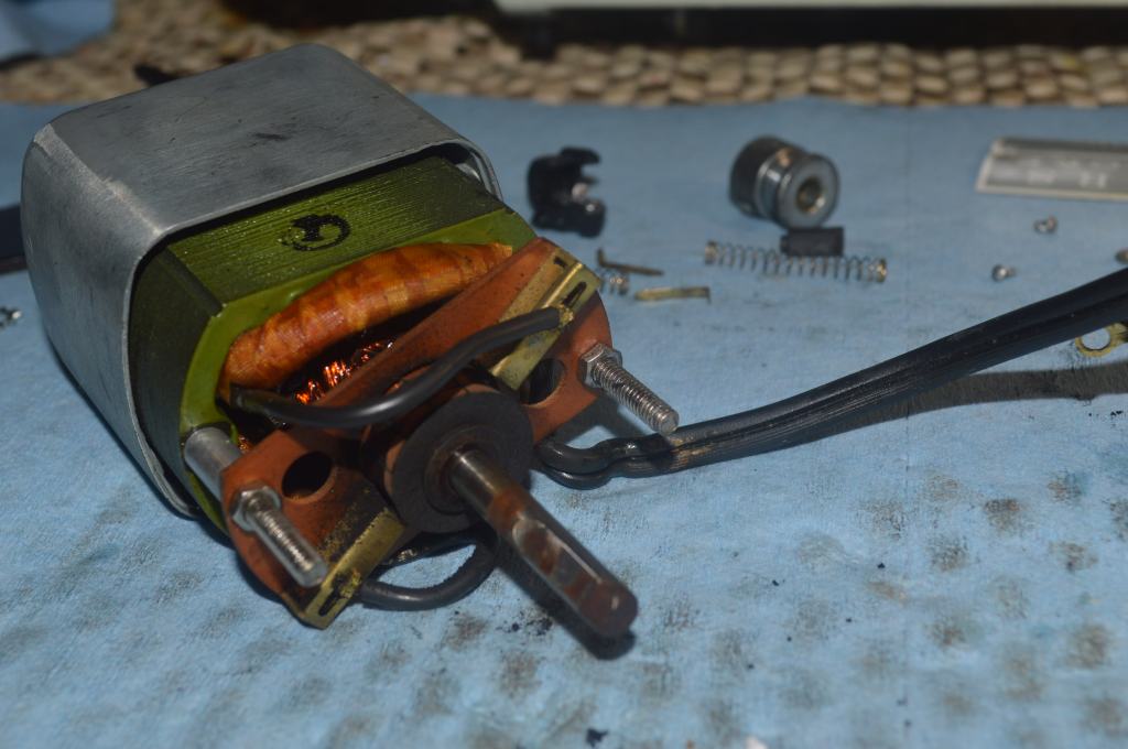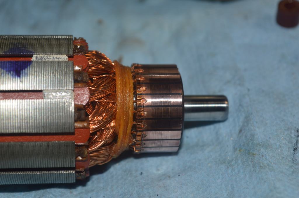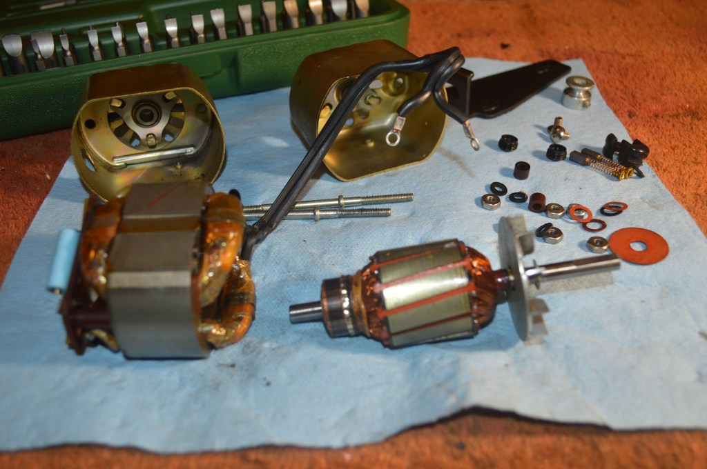 Before reassembly, the brushes are removed and cleaned, the armature and shafts are polished, the motor housings are cleaned on the inside and the oil wicks are recharged. The main wires are attached and soldered to the brush tubes. After reassembly, paint chips on the motor housing are corrected with paint match paint.