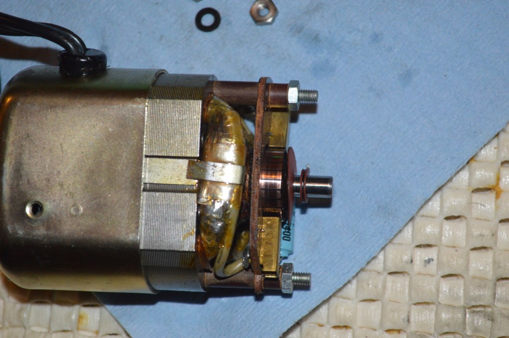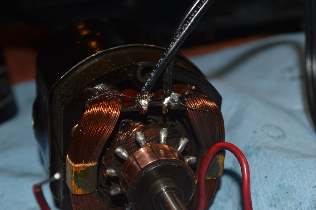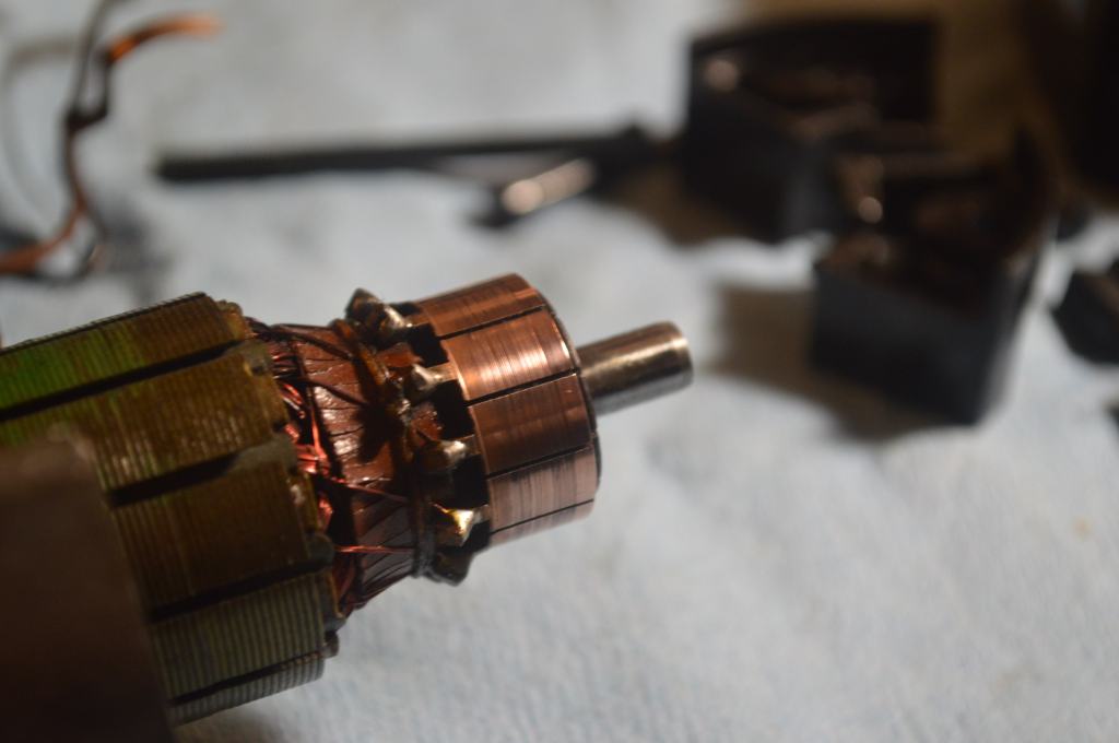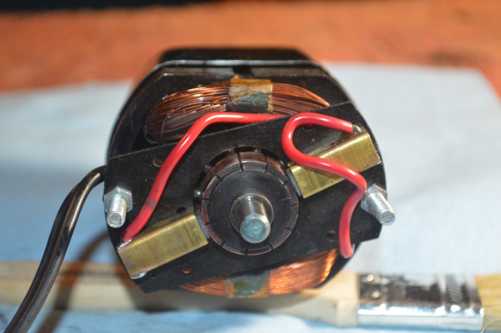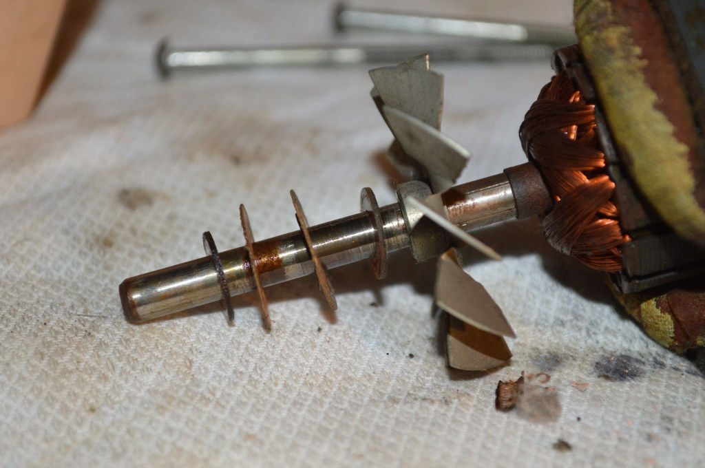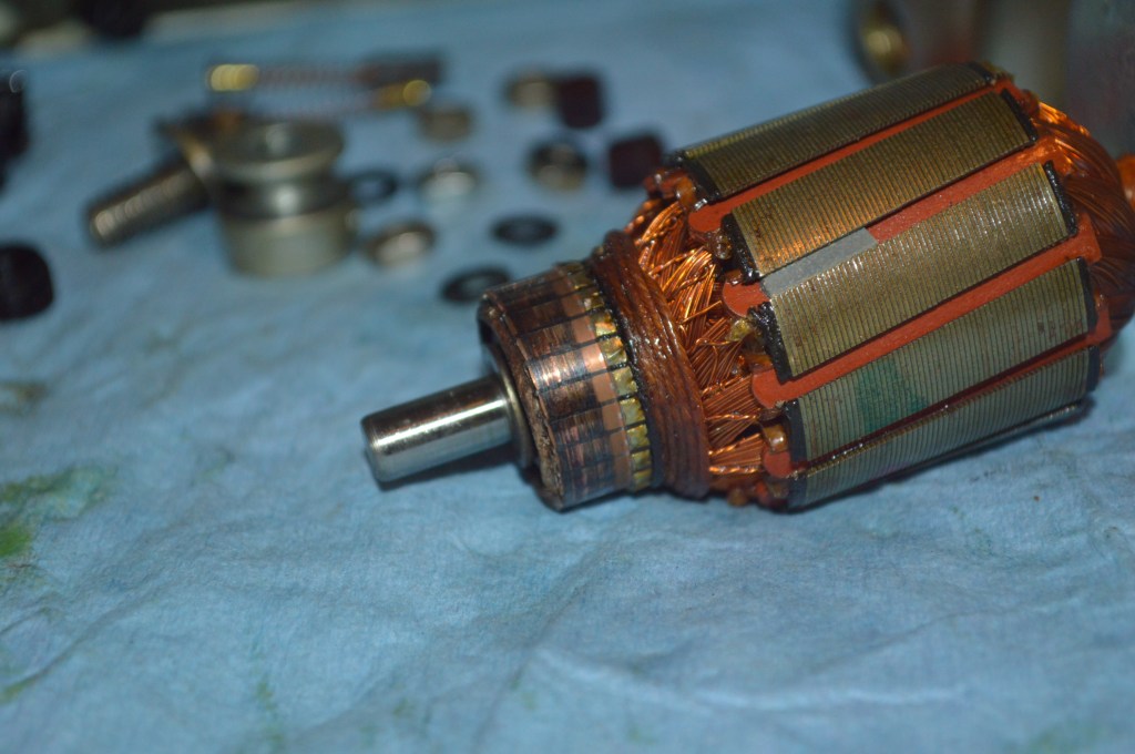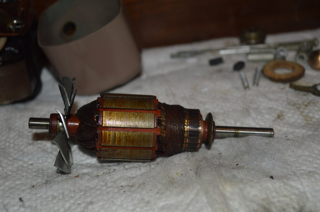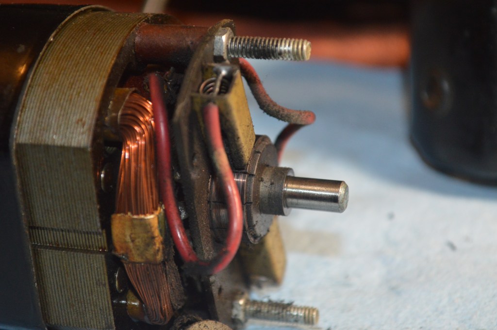 Before reassembly, the brushes are removed and cleaned, the armature and shafts are polished, the motor housings are cleaned on the inside and the oil wicks are recharged. The main wires are attached and soldered to the brush tubes. After reassembly, paint chips on the motor housing are corrected with paint match paint.
