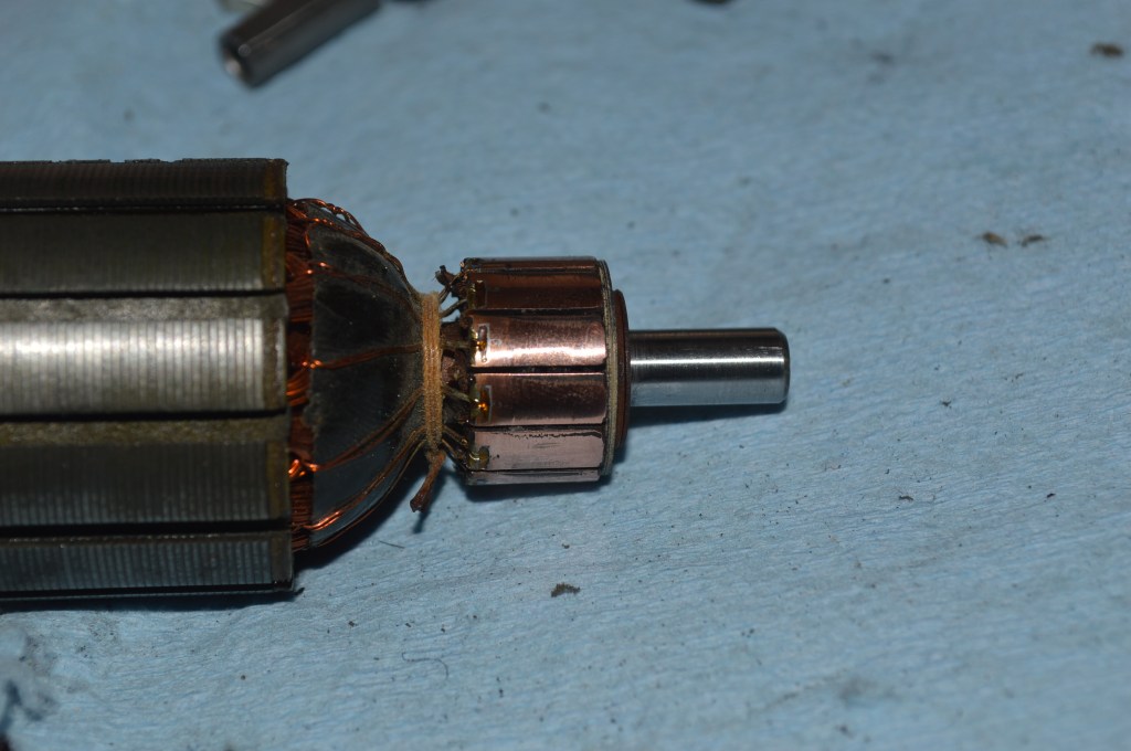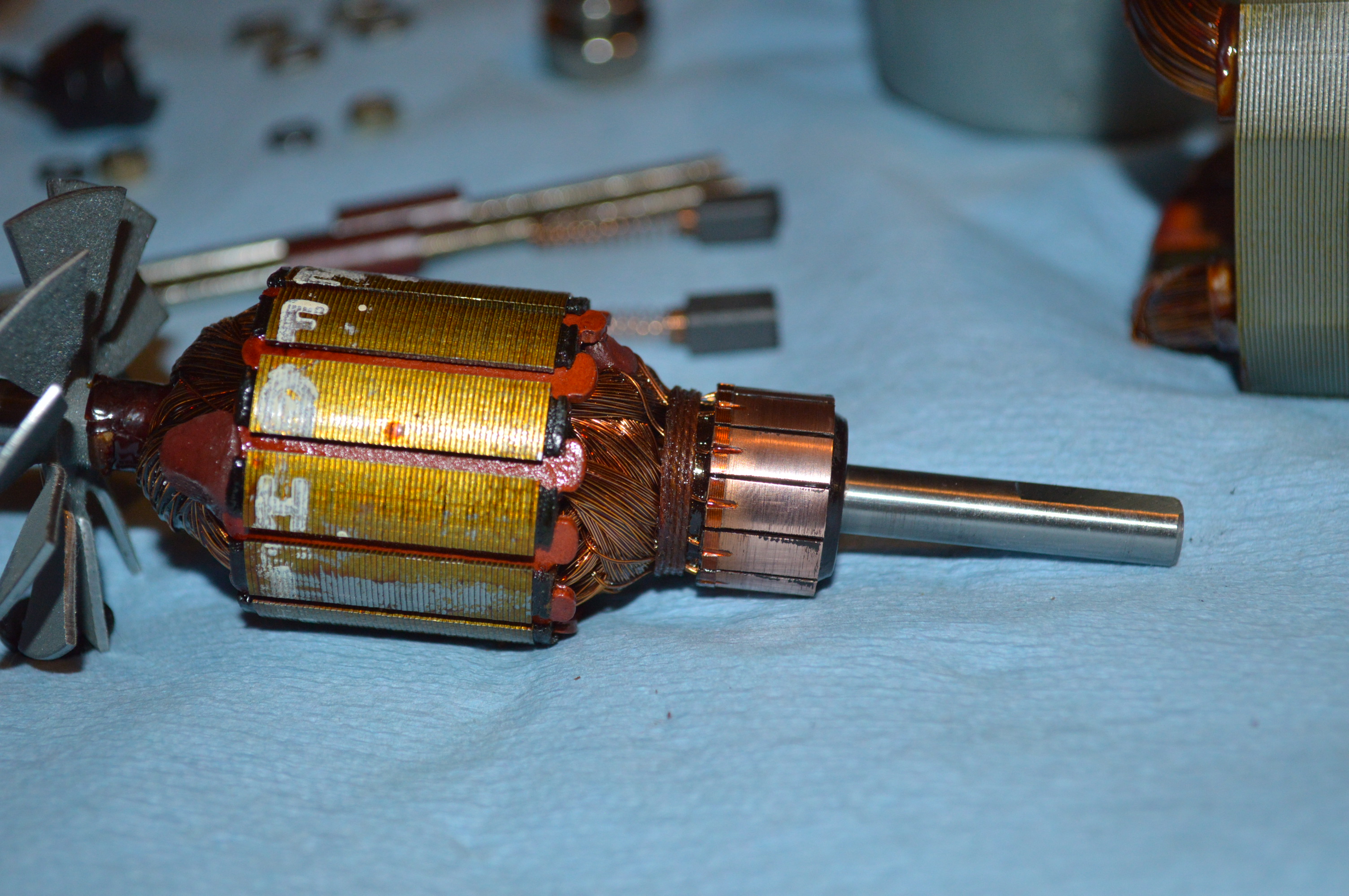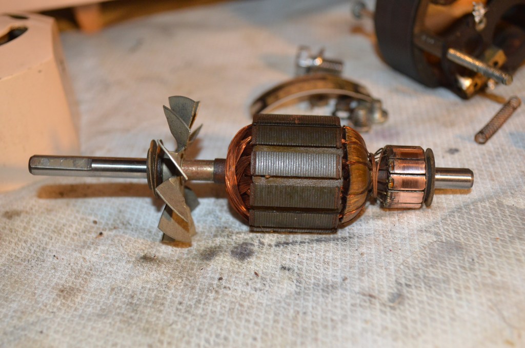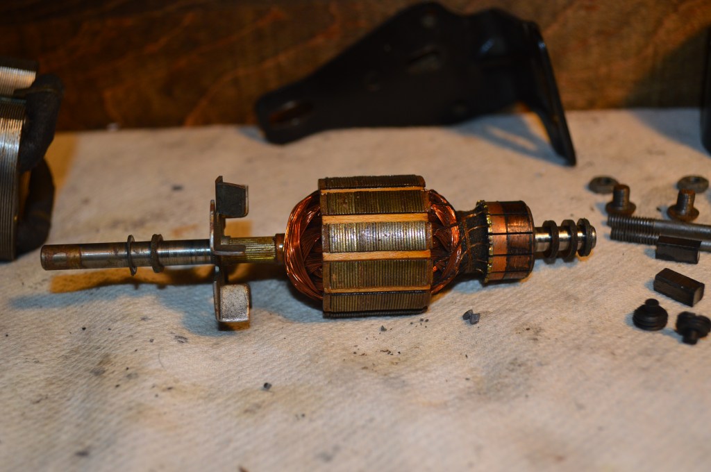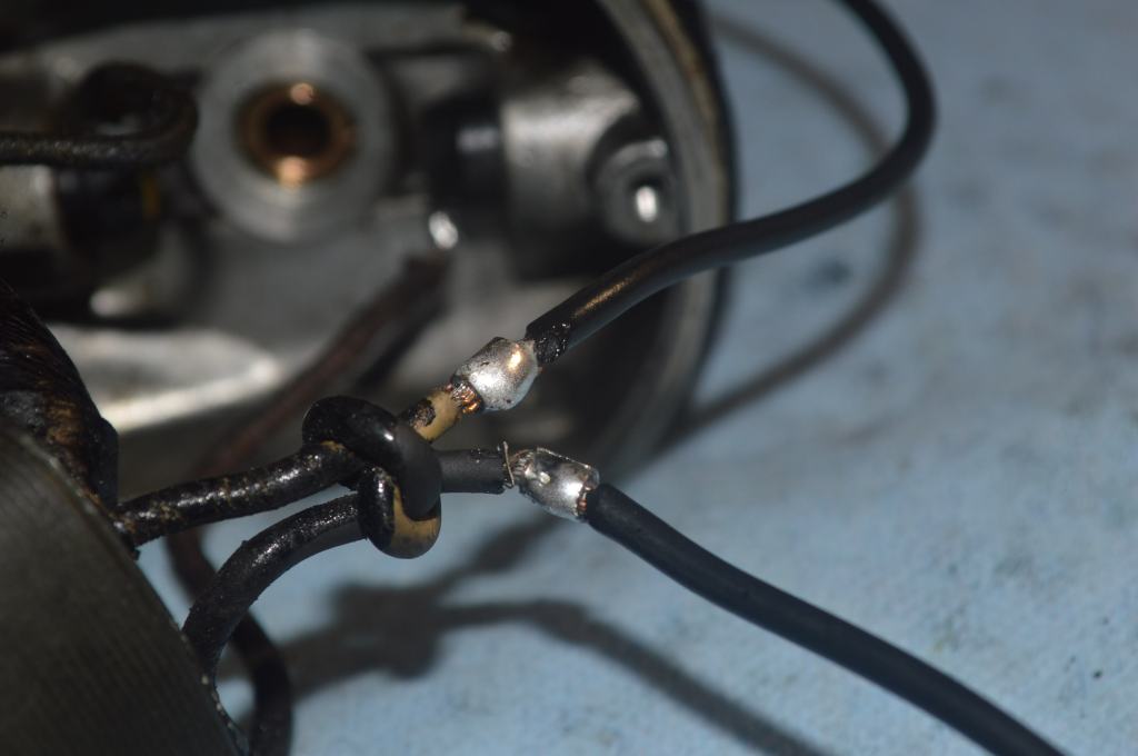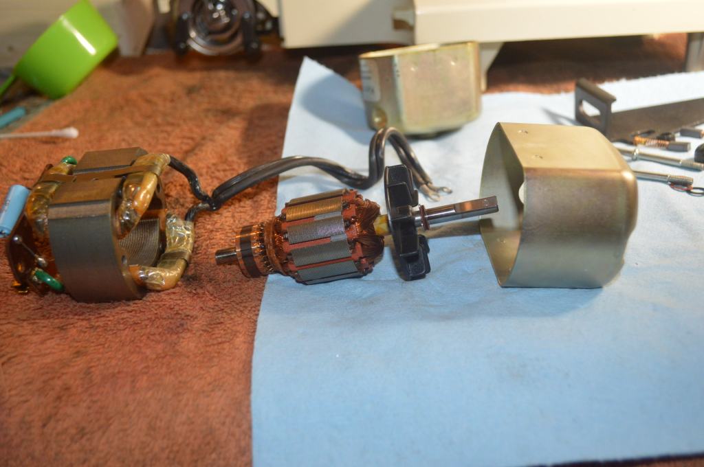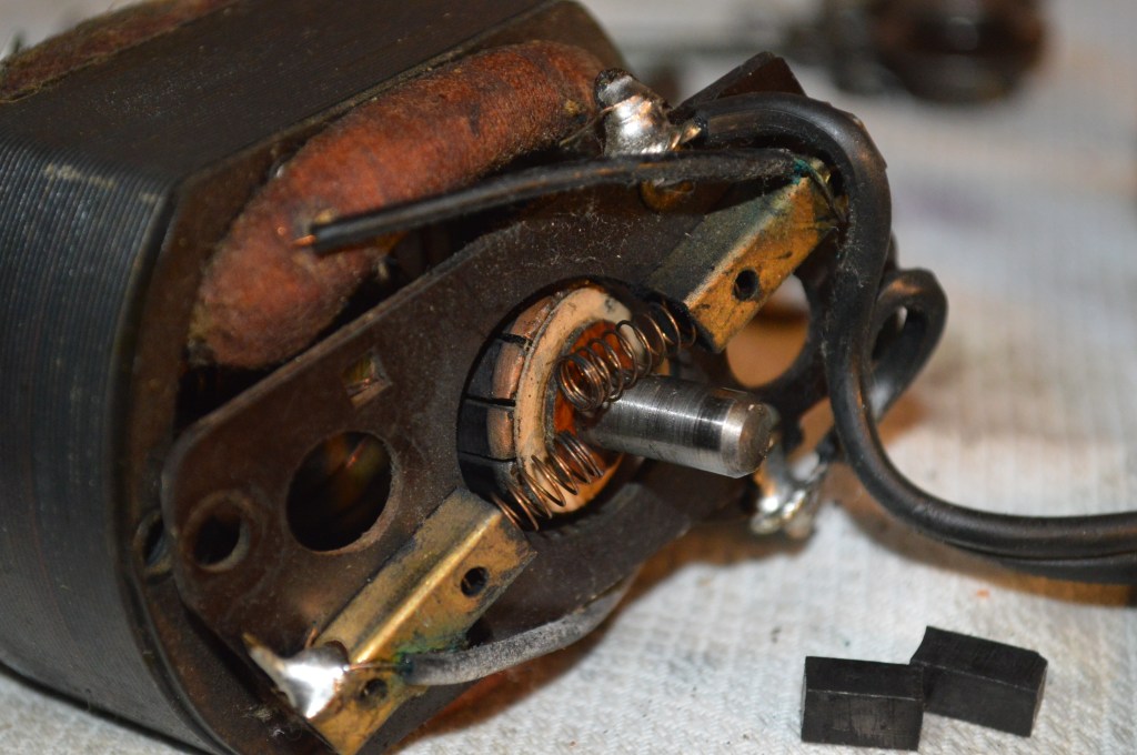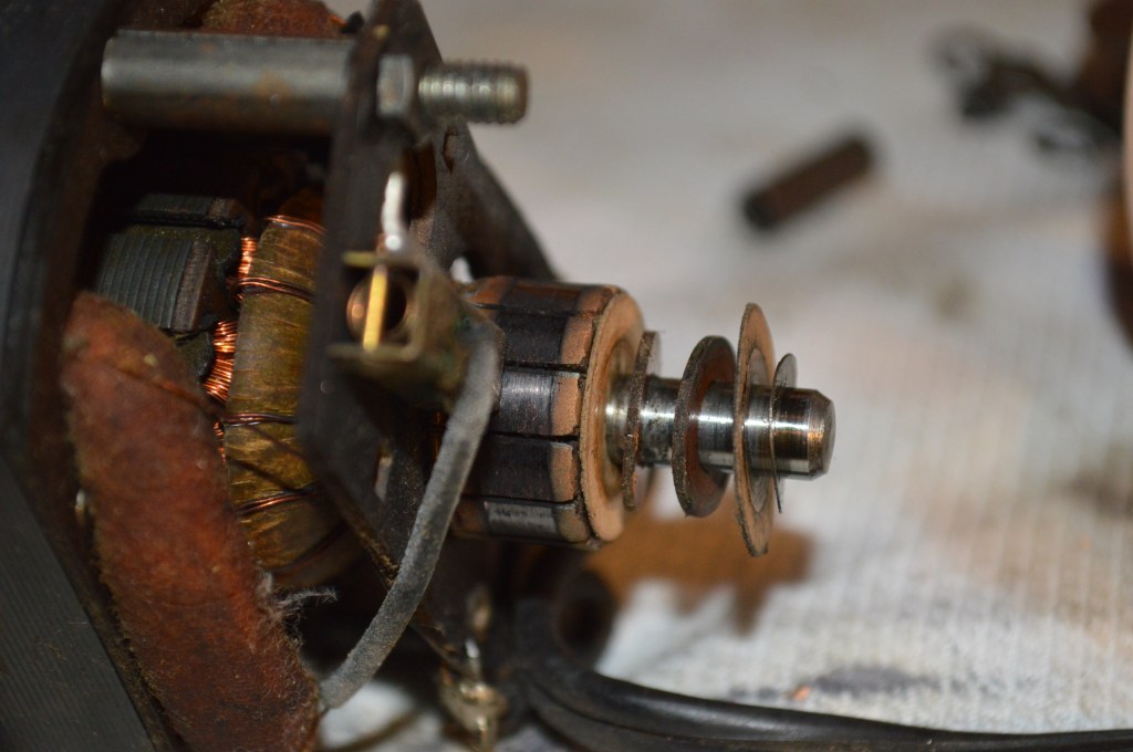 Before reassembly, the brushes are removed and cleaned, the armature and shafts are polished, the motor housings are cleaned on the inside and the oil wicks are recharged. The main wires are attached and soldered to the brush tubes. After reassembly, paint chips on the motor housing are corrected with paint match paint.