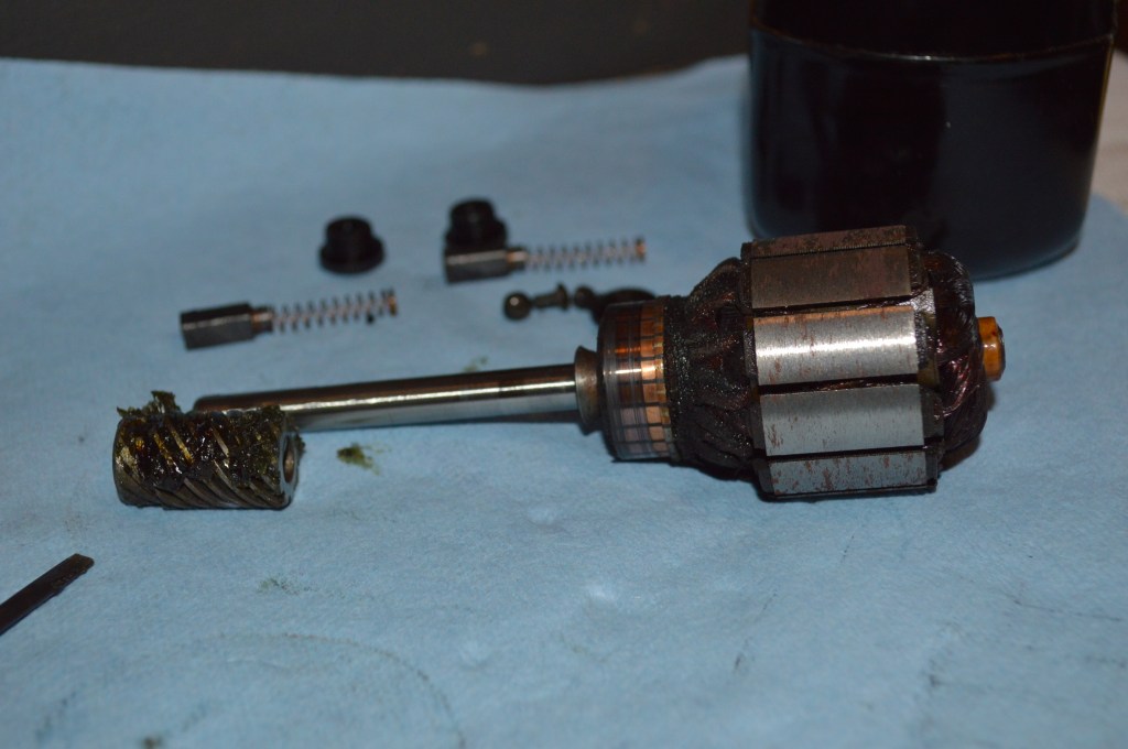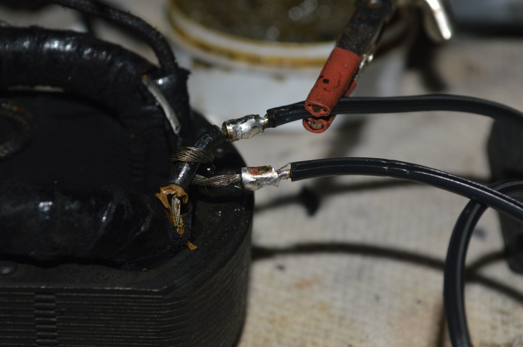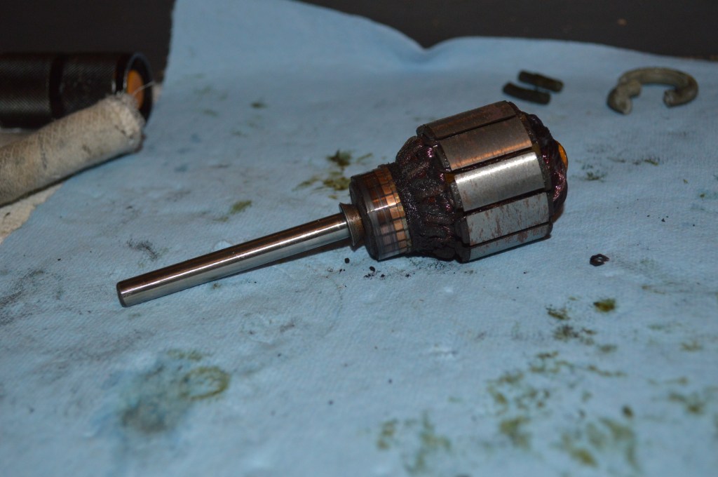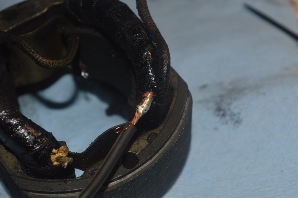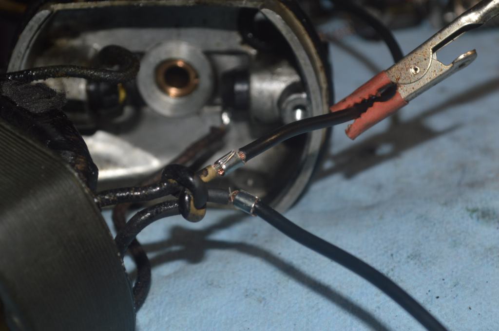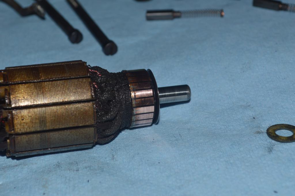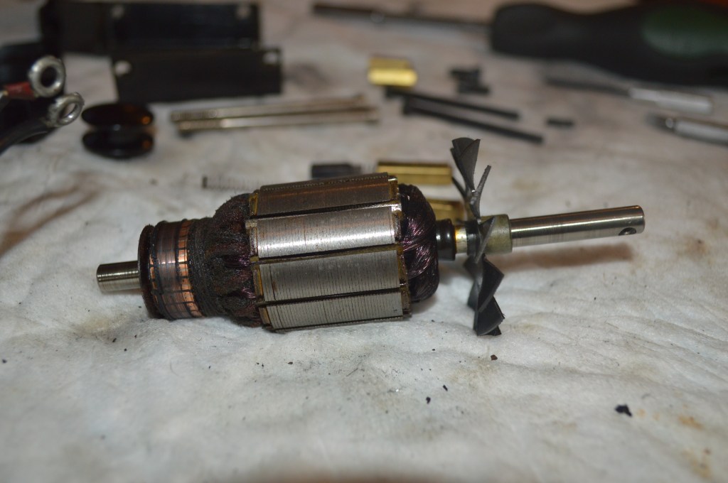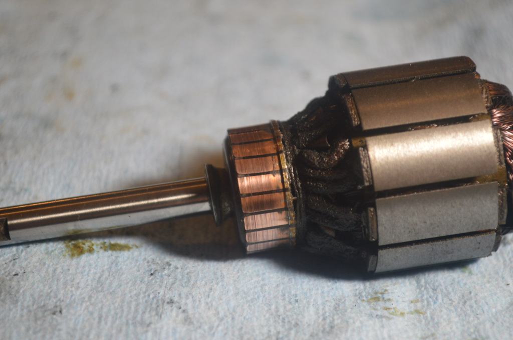 Before reassembly, the brushes are removed and cleaned, the armature and shafts are polished, the motor housings are cleaned on the inside and the oil wicks are recharged. The main wires are attached and soldered to the brush tubes. After reassembly, paint chips on the motor housing are corrected with paint match paint.