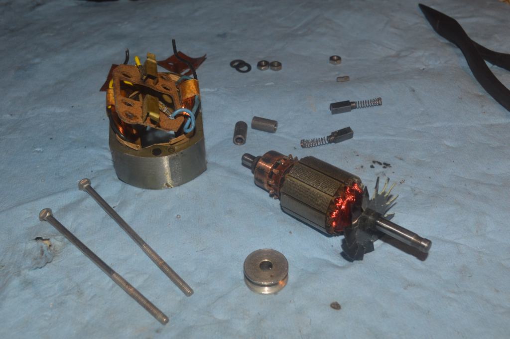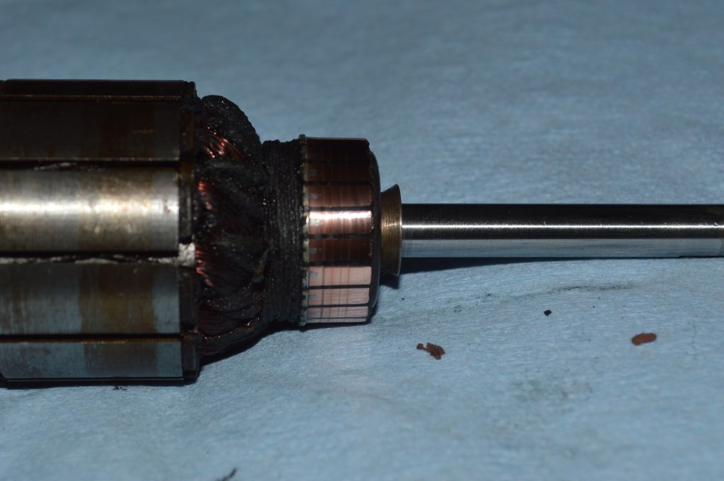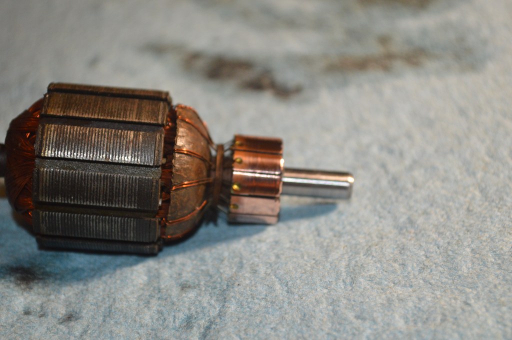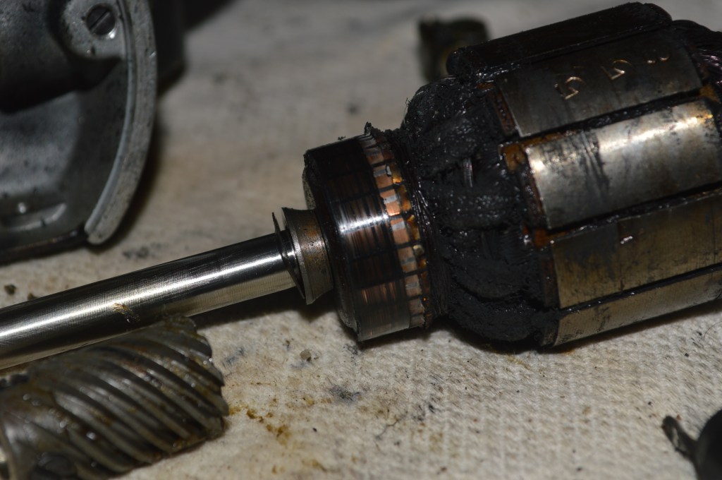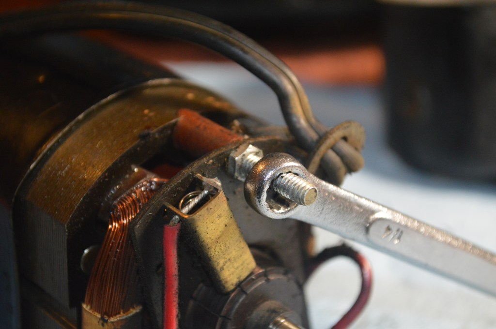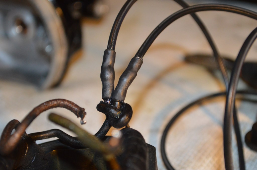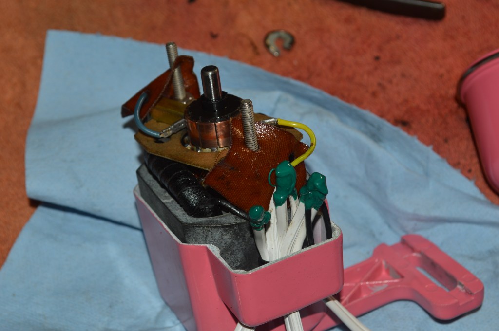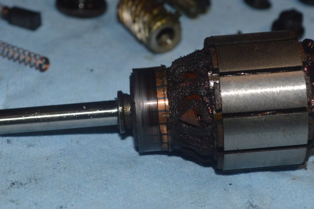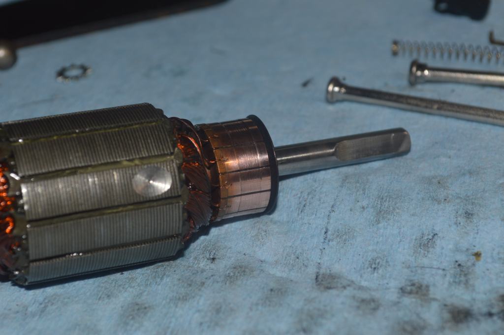 Before reassembly, the brushes are removed and cleaned, the armature and shafts are polished, the motor housings are cleaned on the inside and the oil wicks are recharged. The main wires are attached and soldered to the brush tubes. After reassembly, paint chips on the motor housing are corrected with paint match paint.
