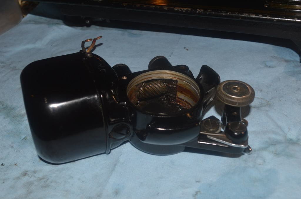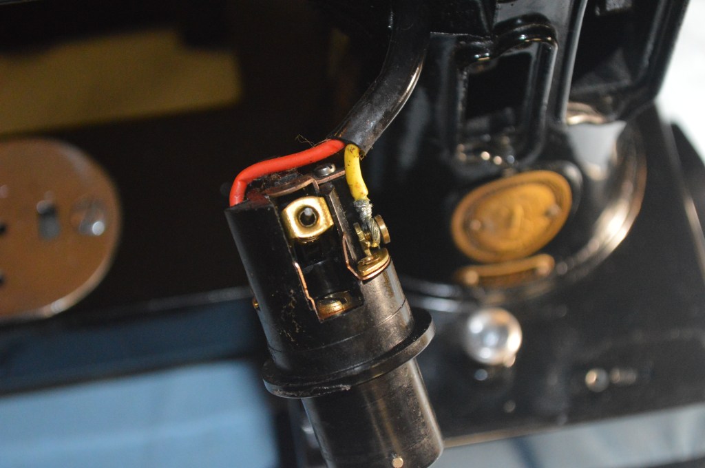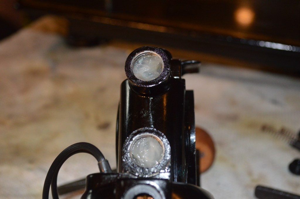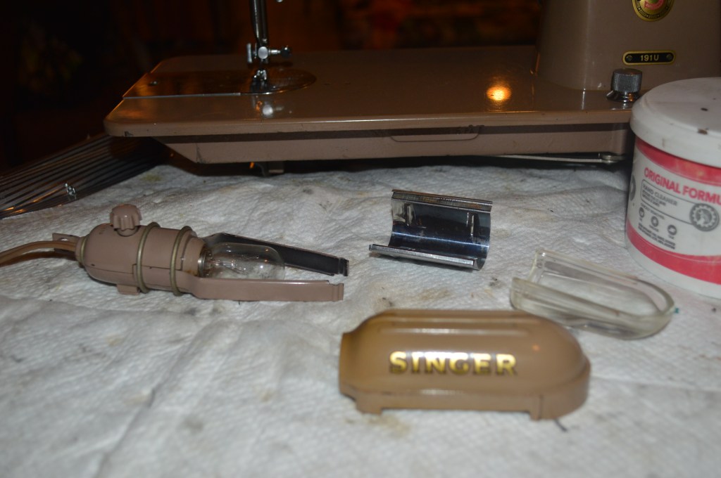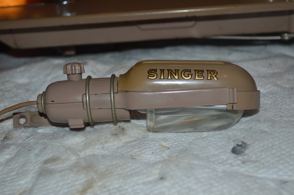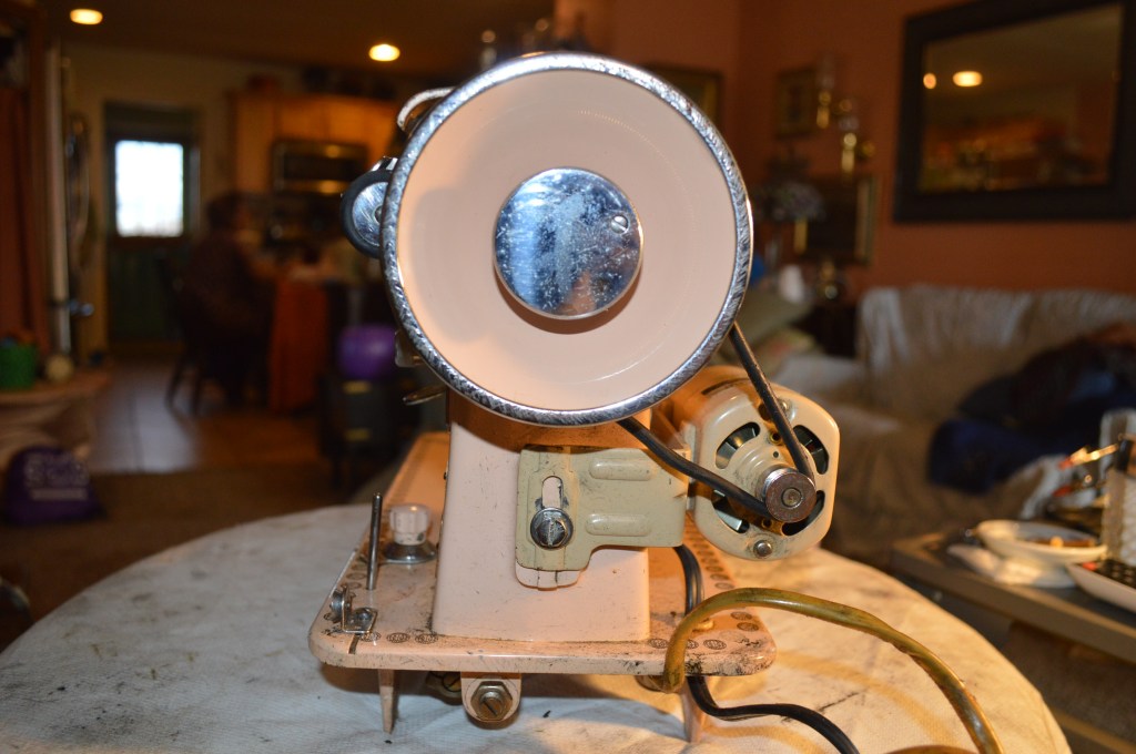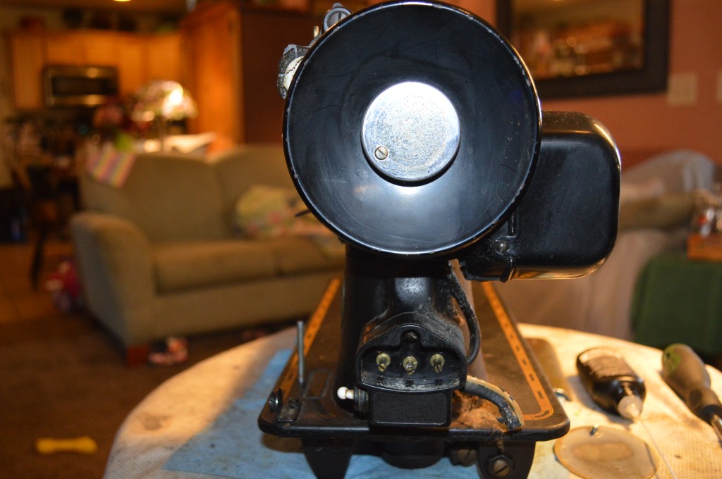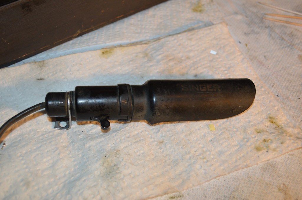 Next, the light fixture is restored. This machine has an aftermarket light attachment that is very likely the same (or slightly later) vintage as the machine. The wires need to be replaced, and I think I can improve the cosmetic appearance by polishing the light shroud.