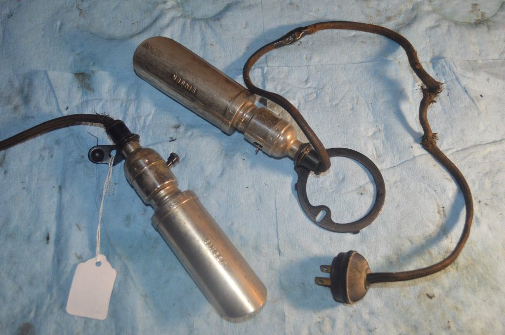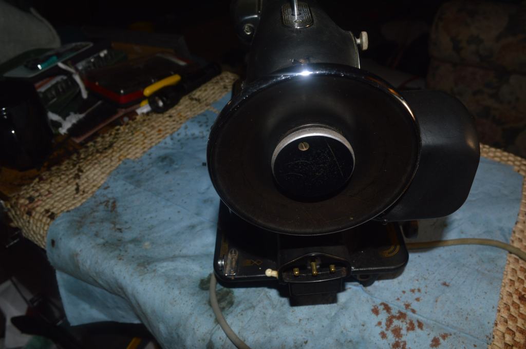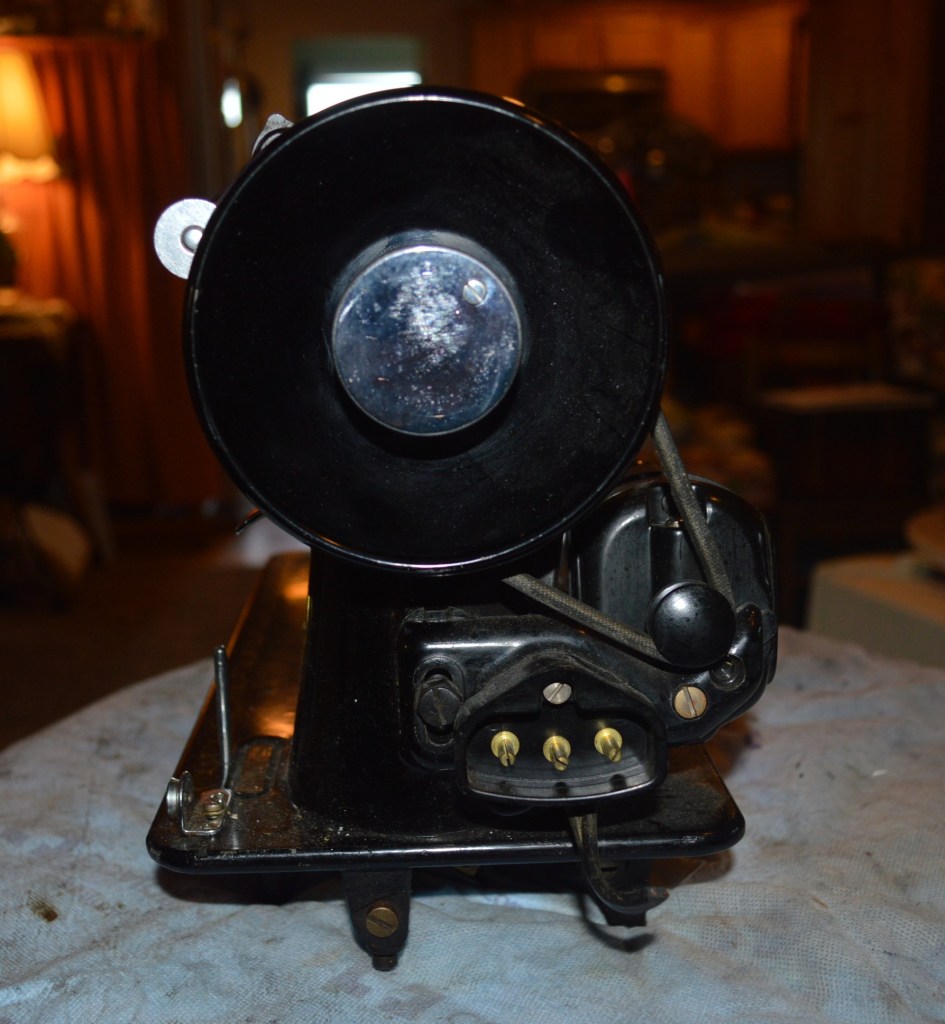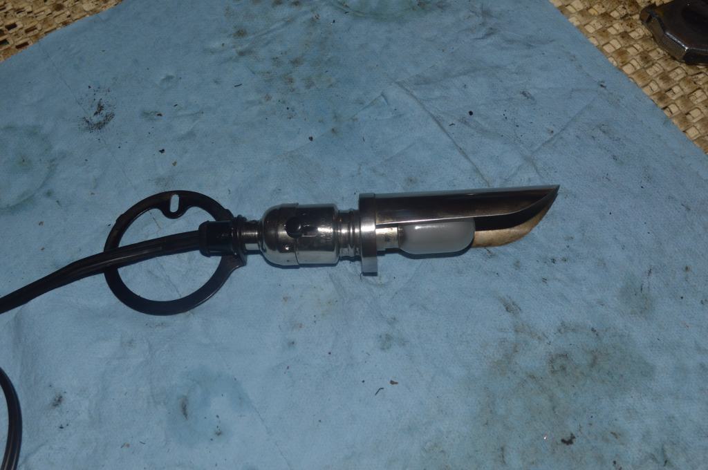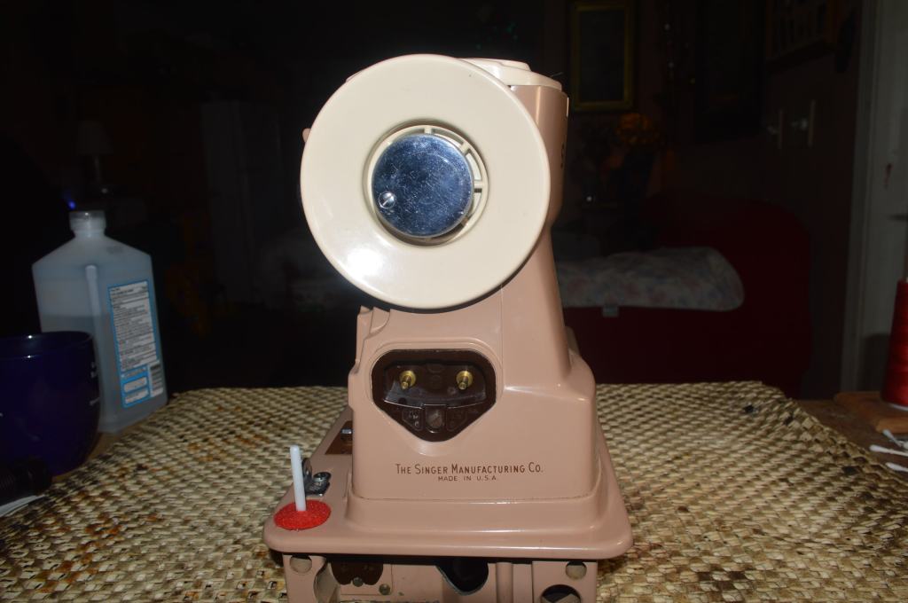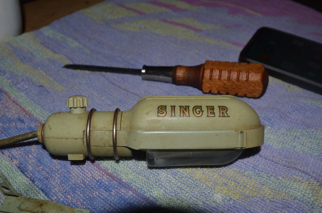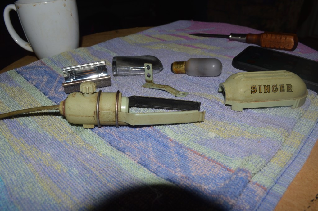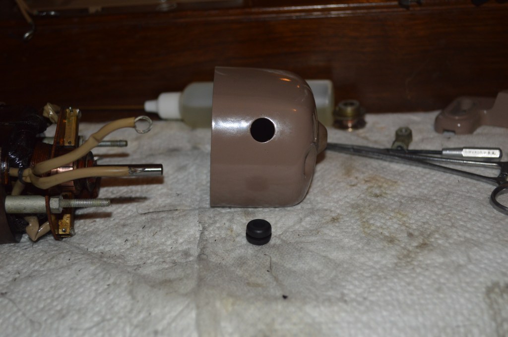 Next, the light fixture is restored. This machine has an aftermarket light attachment that is very likely the same (or slightly later) vintage as the machine. The wires need to be replaced, and I think I can improve the cosmetic appearance by polishing the light shroud.