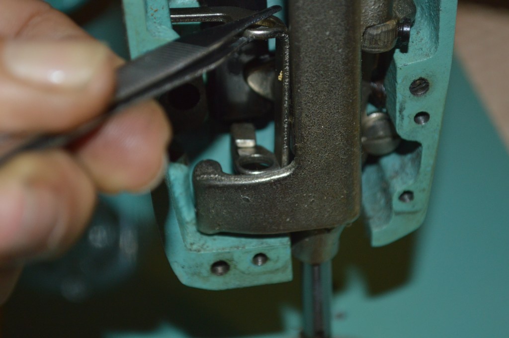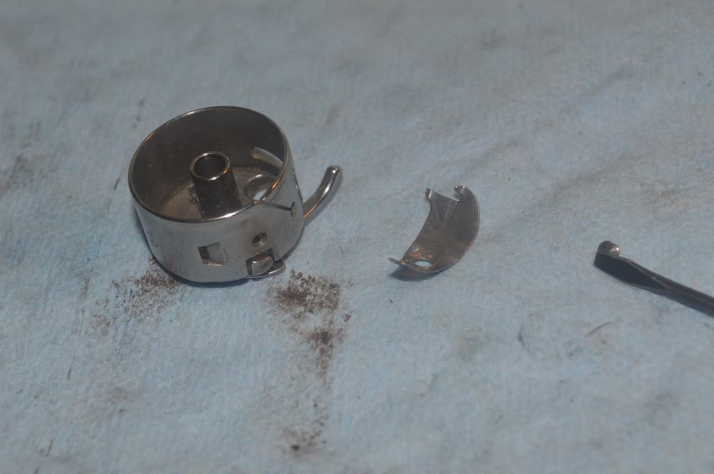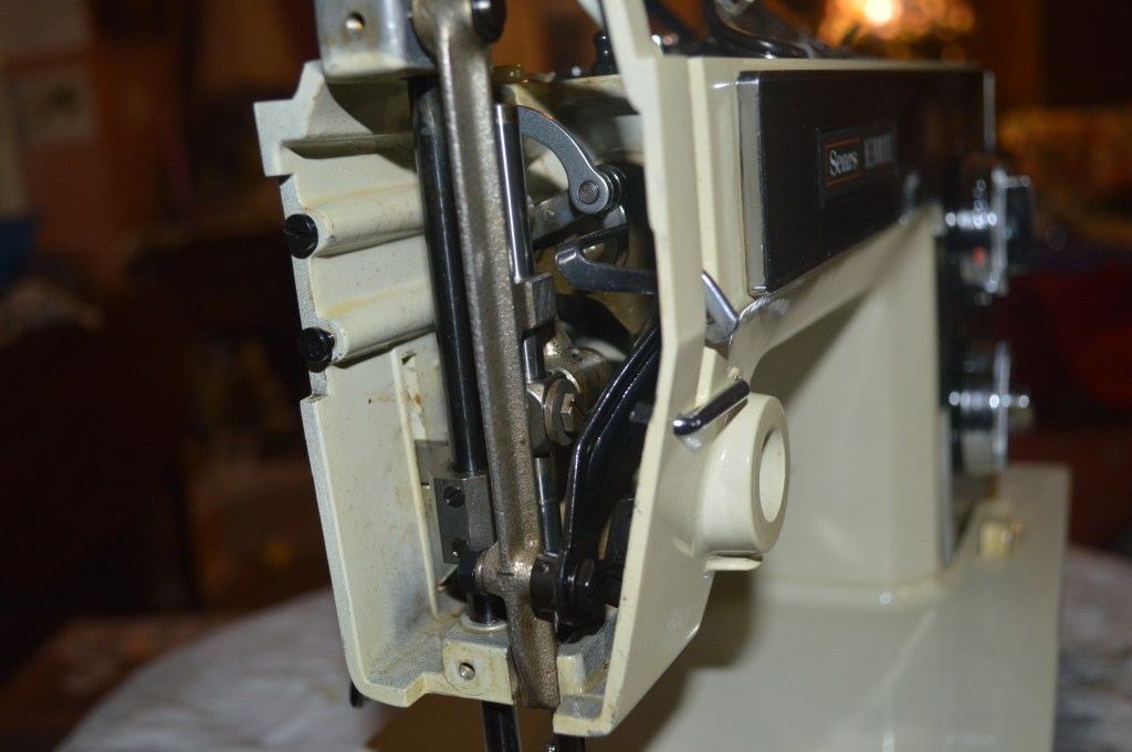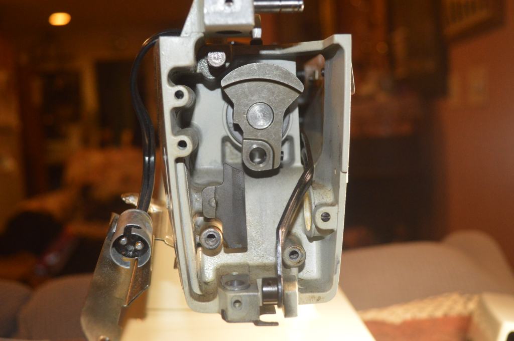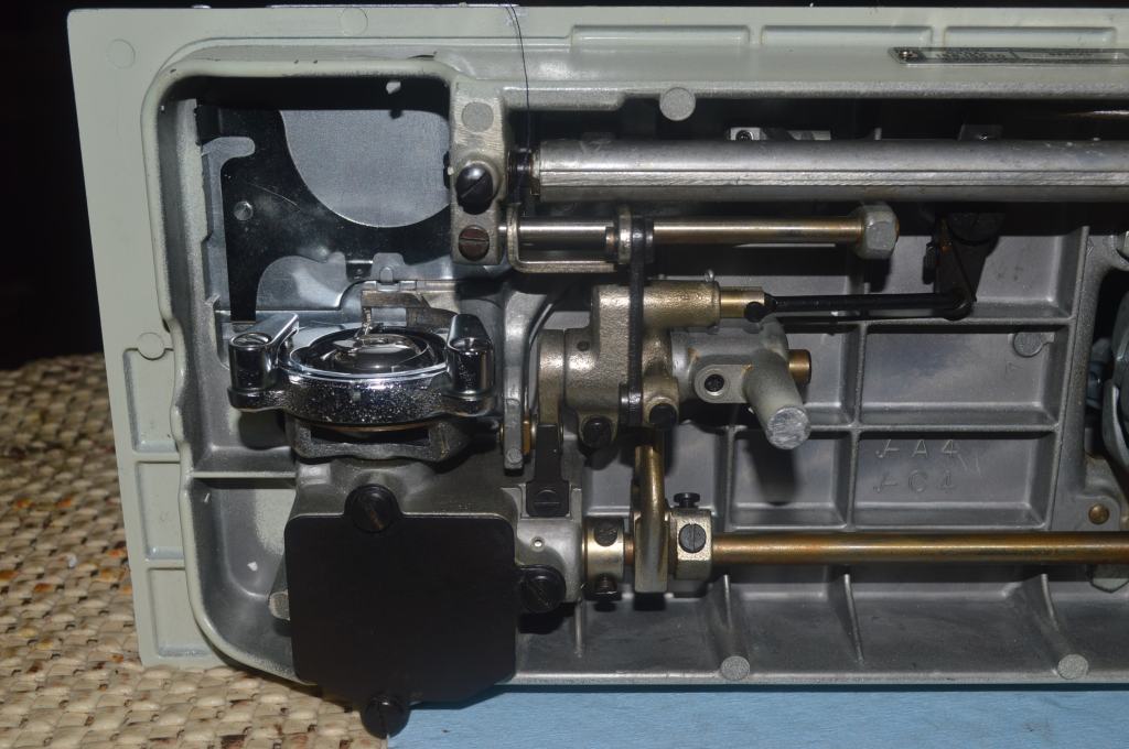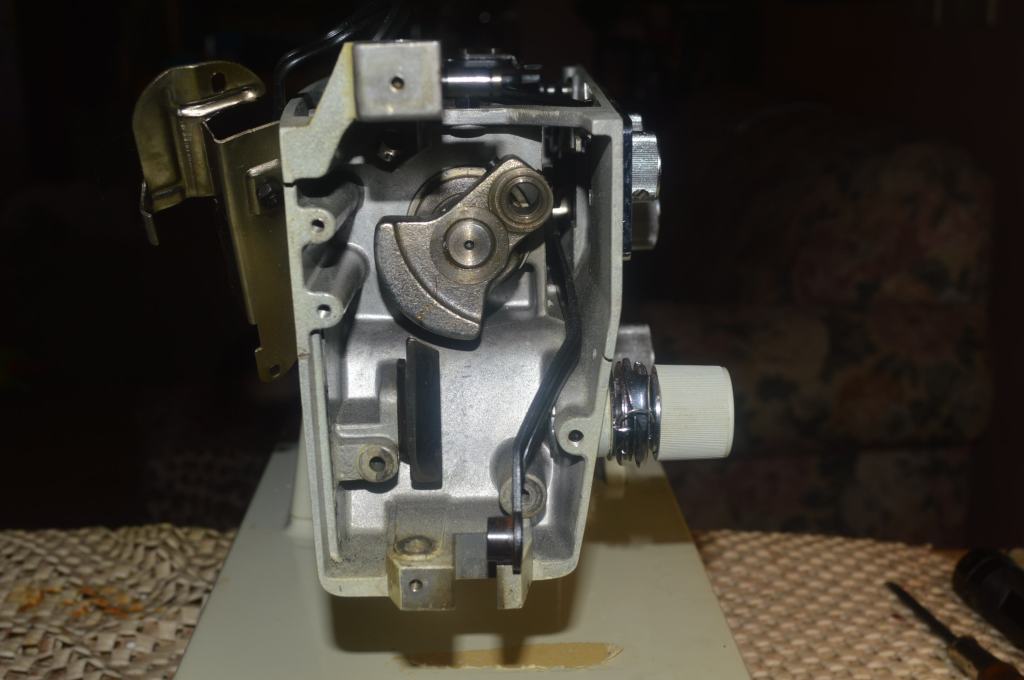 All of the assemblies in the sewing machine’s needle bar area are removed.