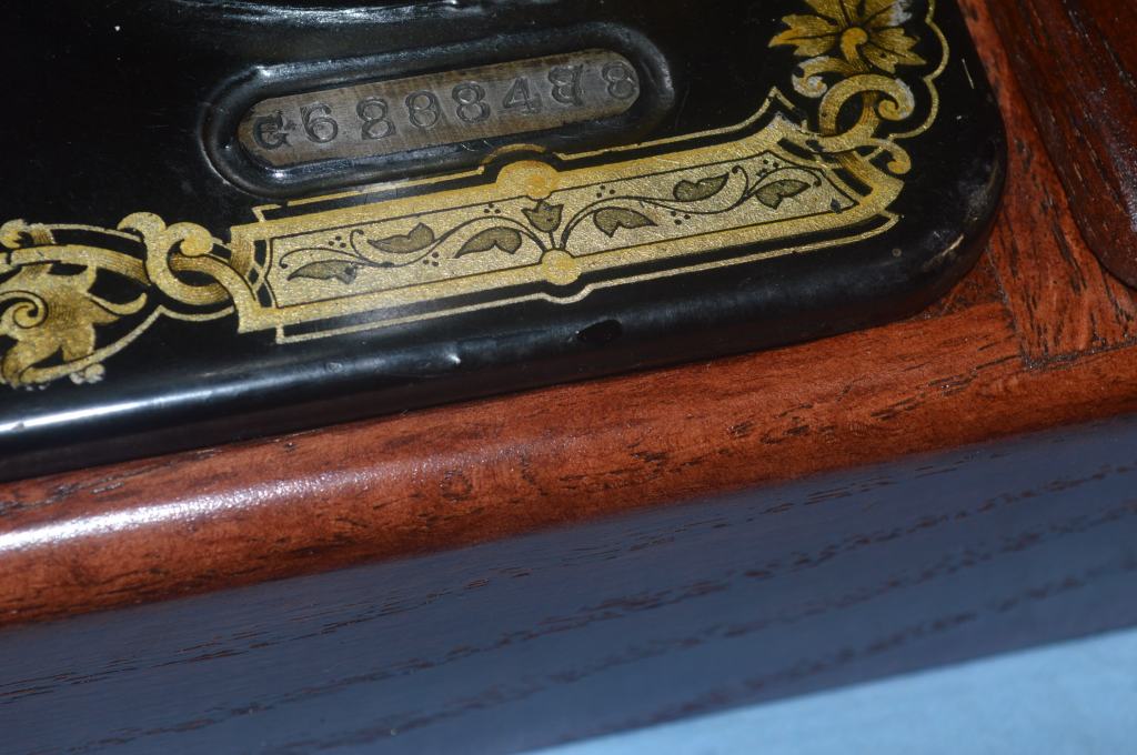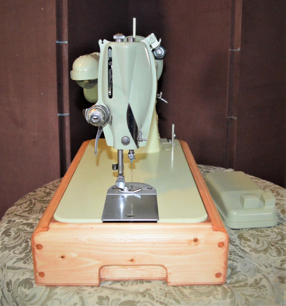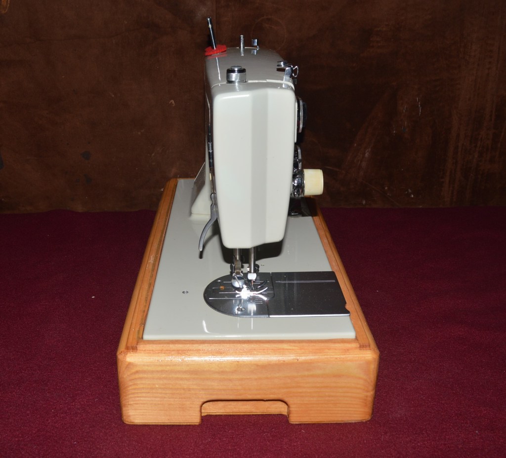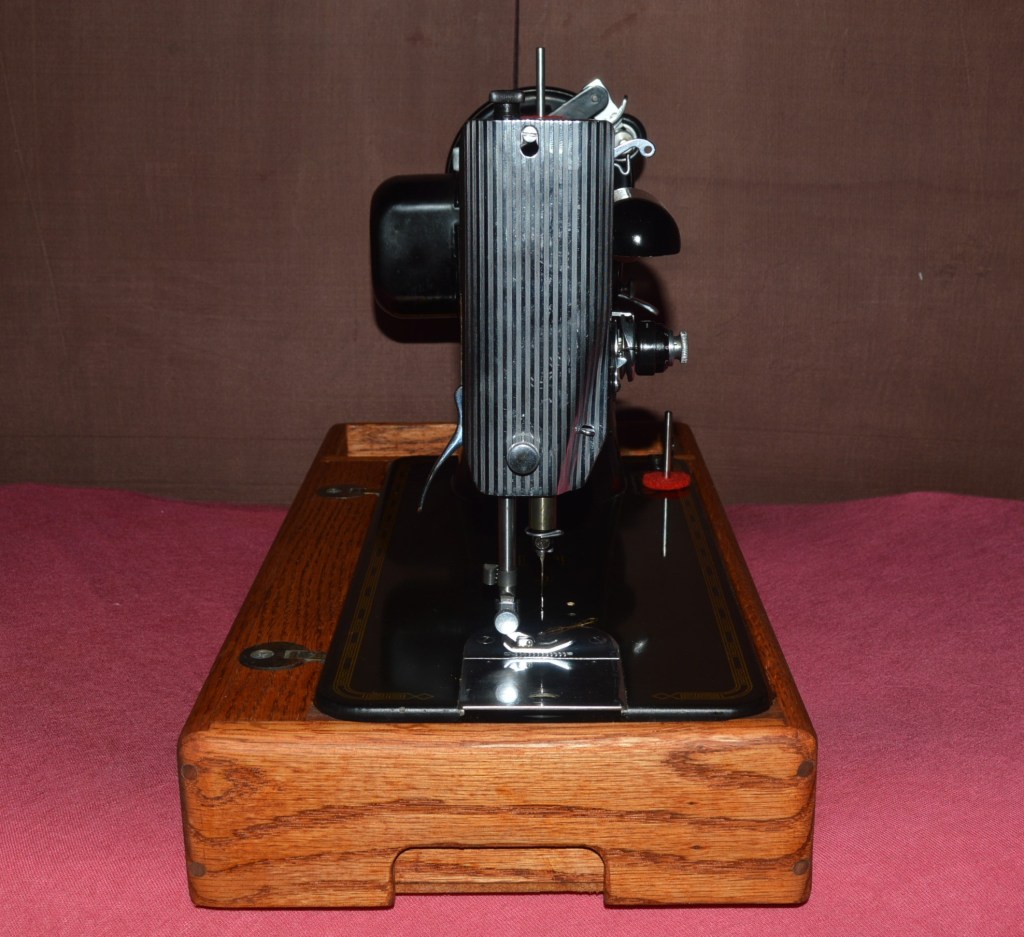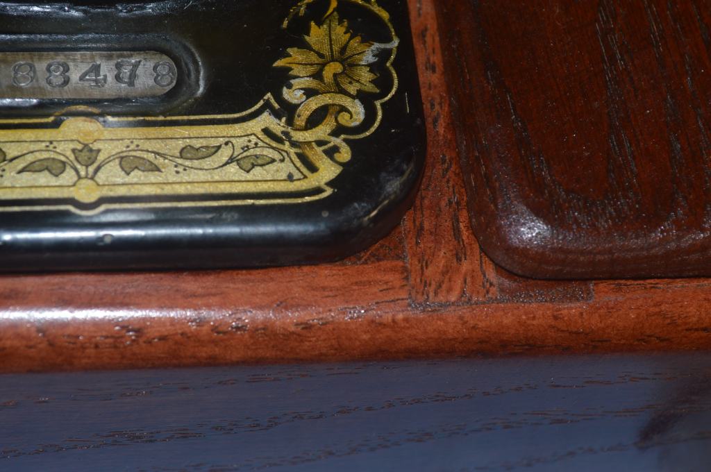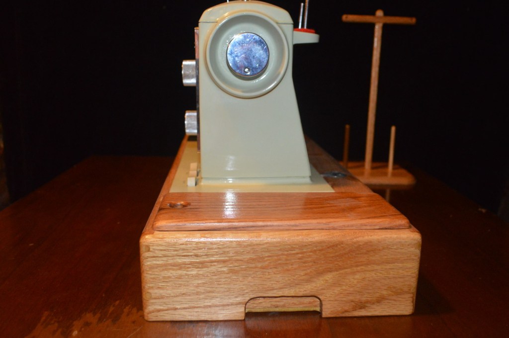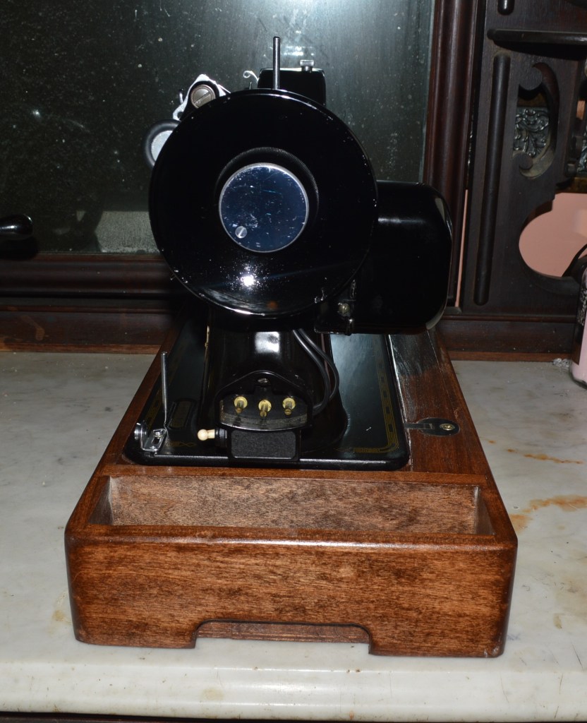So, that’s it! The paint repairs turned out very nicely, and are hardly noticeable unless you know where to look. The machine turns smoothly and there is no perceptable slip or play in the assemblies. The parts are completely clean and the adjustments are just right for this machine. Finally, the pictures below show the final outcome. The customer ordered a custom made base in a Mocha stain, and this is base the machine is set into. All in all I think it is a very nice package, and I hope the customer is not only pleased, but uses her “new” Gimbels “Regular” machine for many years to come!
