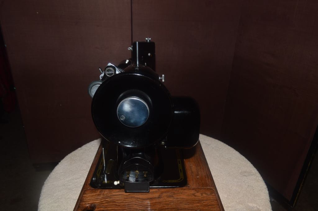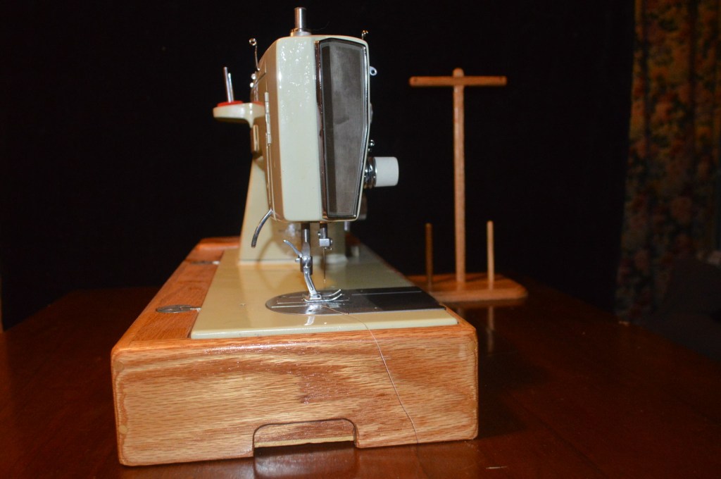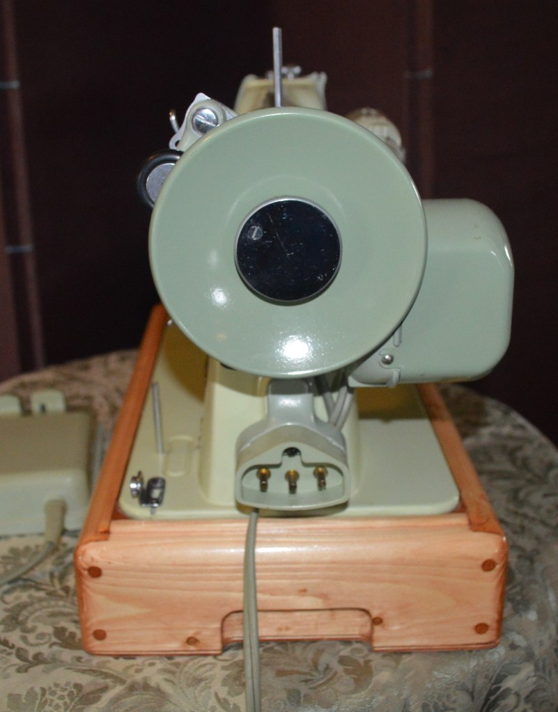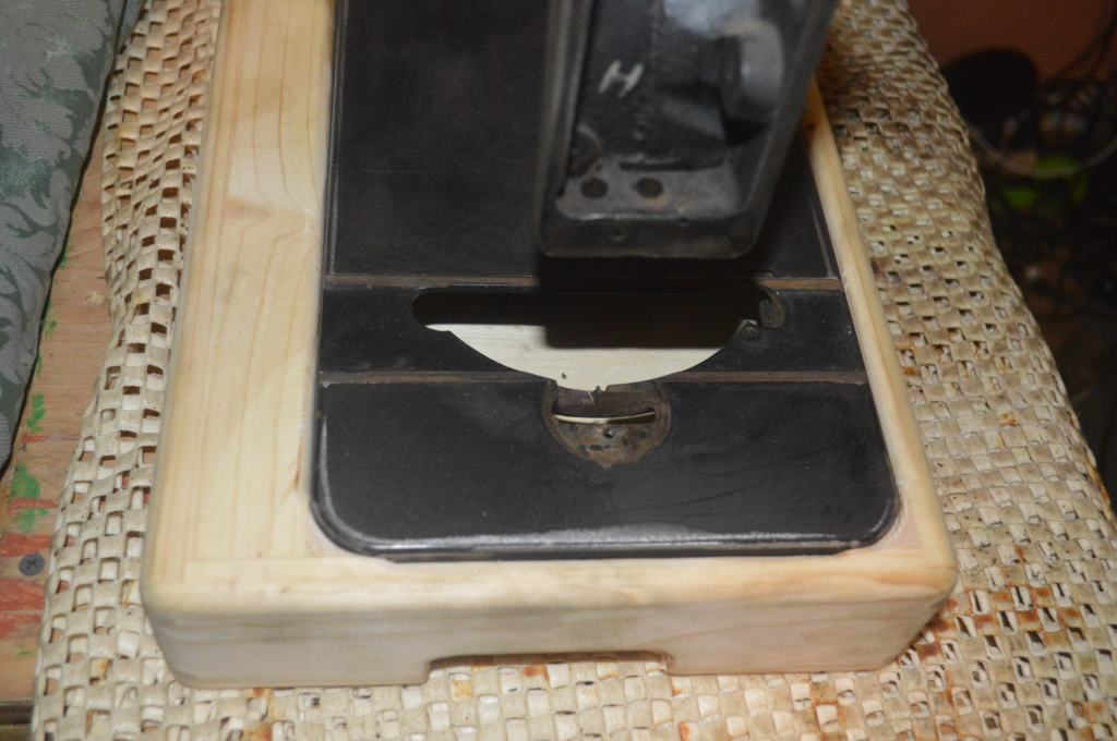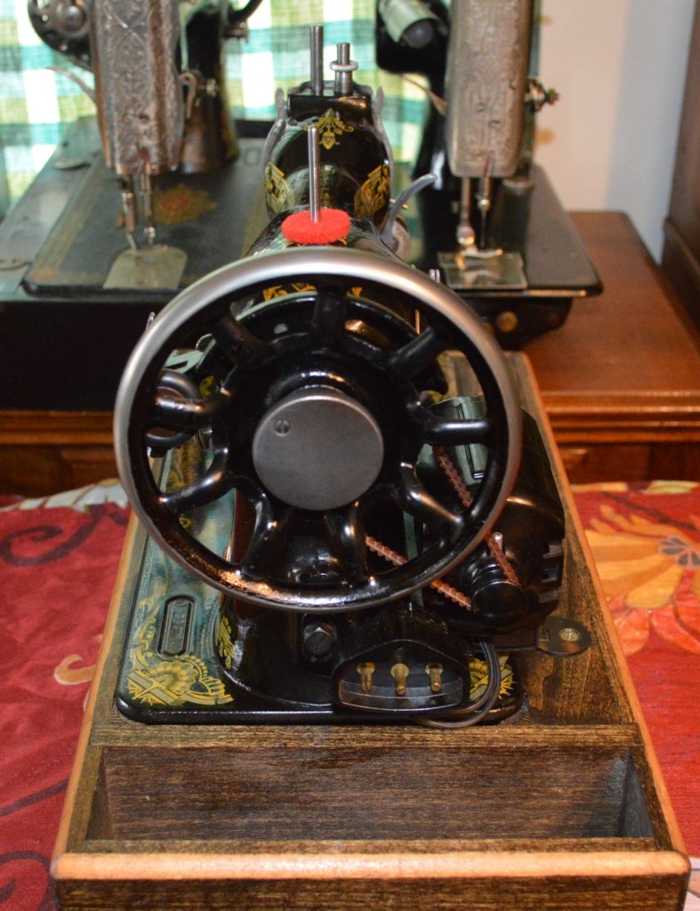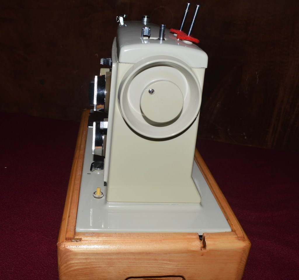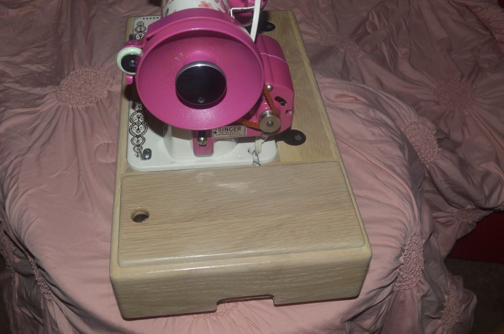 So, that’s it! The paint repairs turned out very nicely, and are hardly noticeable unless you know where to look. The machine turns smoothly and there is no perceptable slip or play in the assemblies. The parts are completely clean and the adjustments are just right for this machine. Finally, the pictures below show the final outcome. The customer ordered a custom made base in a Mocha stain, and this is base the machine is set into. All in all I think it is a very nice package, and I hope the customer is not only pleased, but uses her “new” Gimbels “Regular” machine for many years to come!