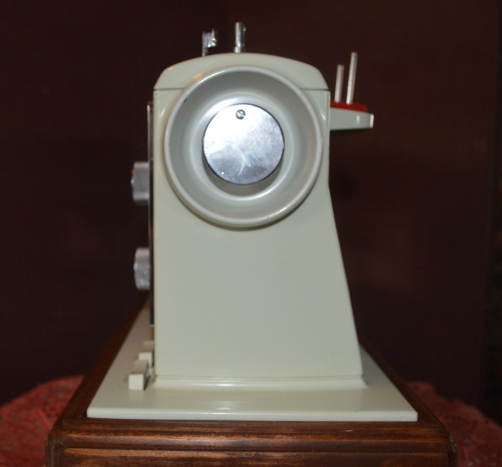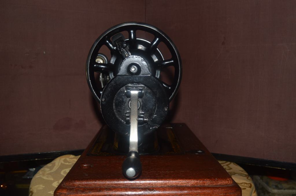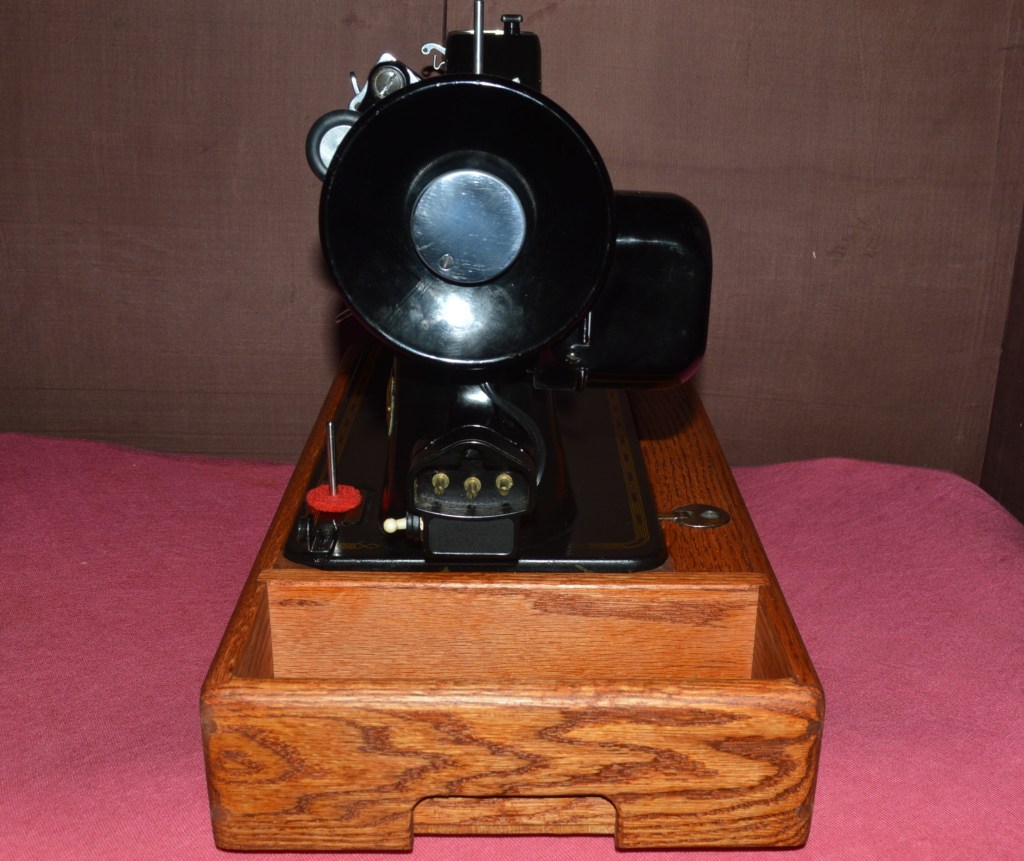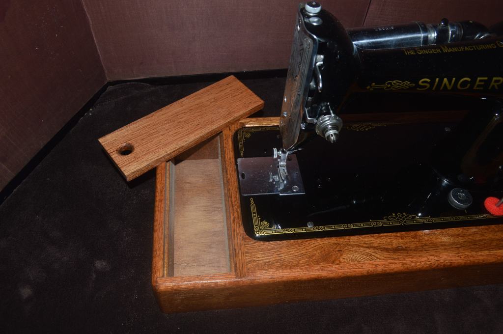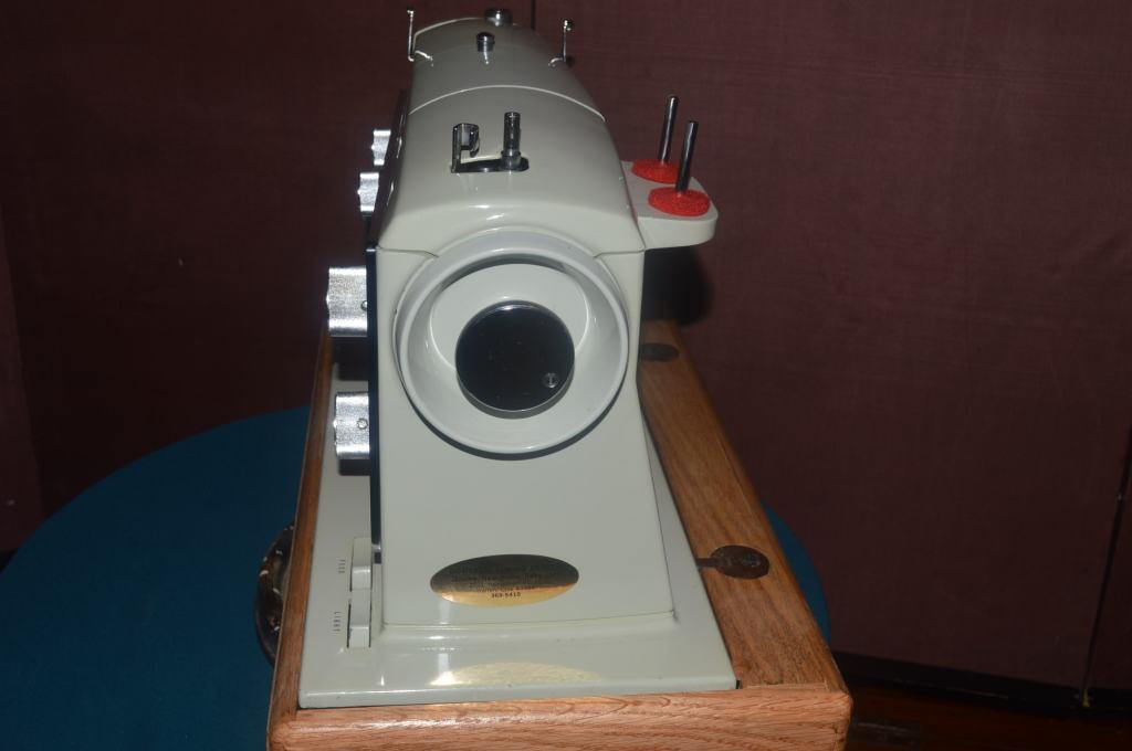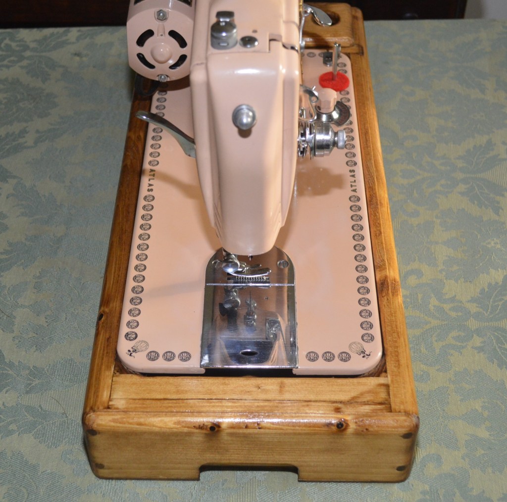 So, that’s it! The paint repairs turned out very nicely, and are hardly noticeable unless you know where to look. The machine turns smoothly and there is no perceptable slip or play in the assemblies. The parts are completely clean and the adjustments are just right for this machine. Finally, the pictures below show the final outcome. The customer ordered a custom made base in a Mocha stain, and this is base the machine is set into. All in all I think it is a very nice package, and I hope the customer is not only pleased, but uses her “new” Gimbels “Regular” machine for many years to come!