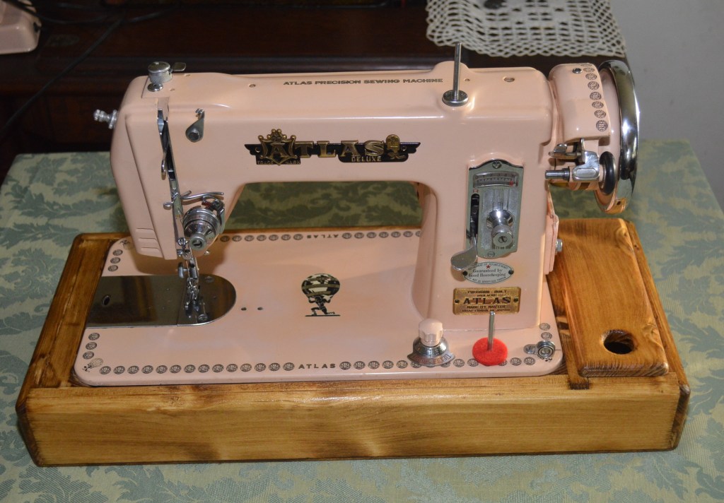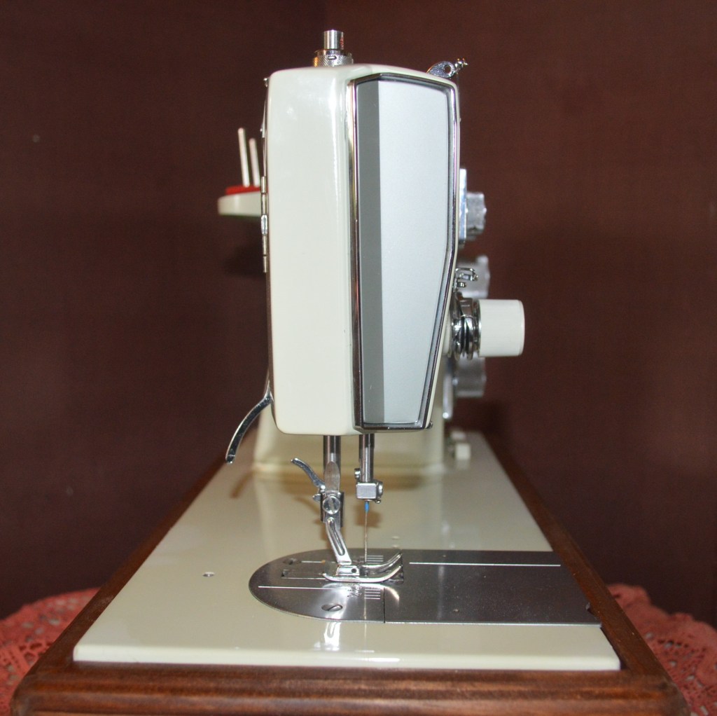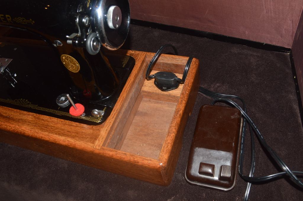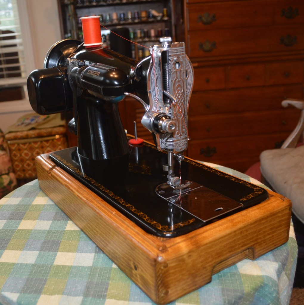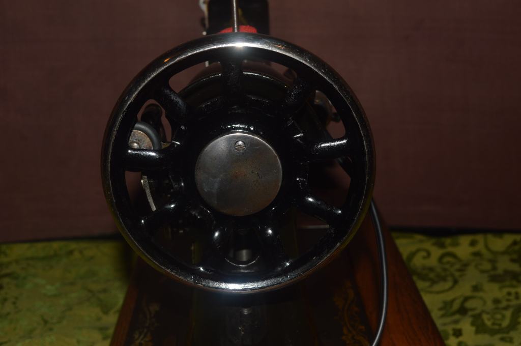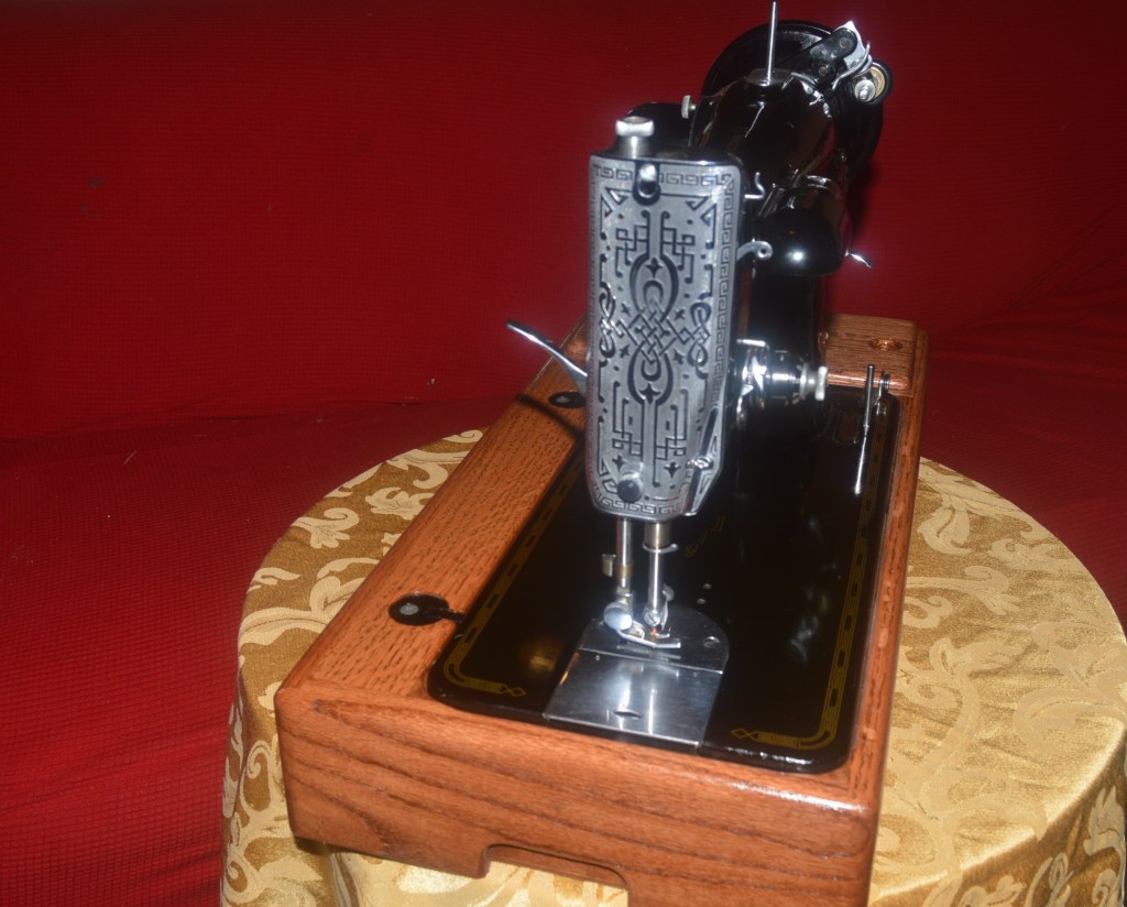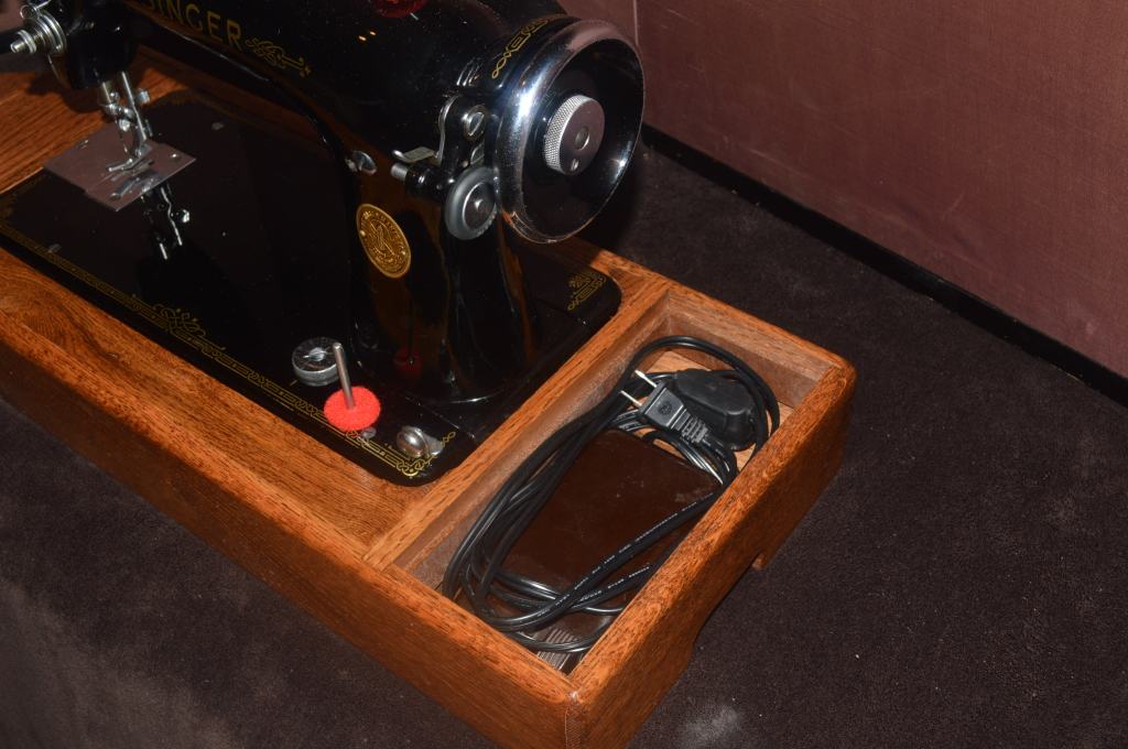 So, that’s it! The paint repairs turned out very nicely, and are hardly noticeable unless you know where to look. The machine turns smoothly and there is no perceptable slip or play in the assemblies. The parts are completely clean and the adjustments are just right for this machine. Finally, the pictures below show the final outcome. The customer ordered a custom made base in a Mocha stain, and this is base the machine is set into. All in all I think it is a very nice package, and I hope the customer is not only pleased, but uses her “new” Gimbels “Regular” machine for many years to come!