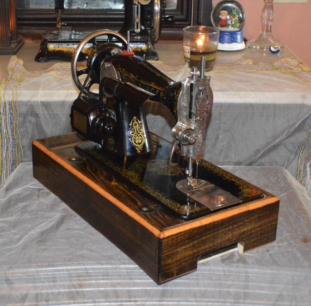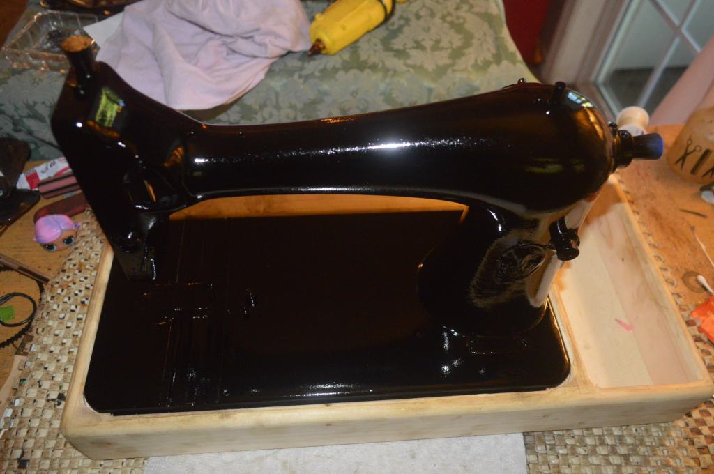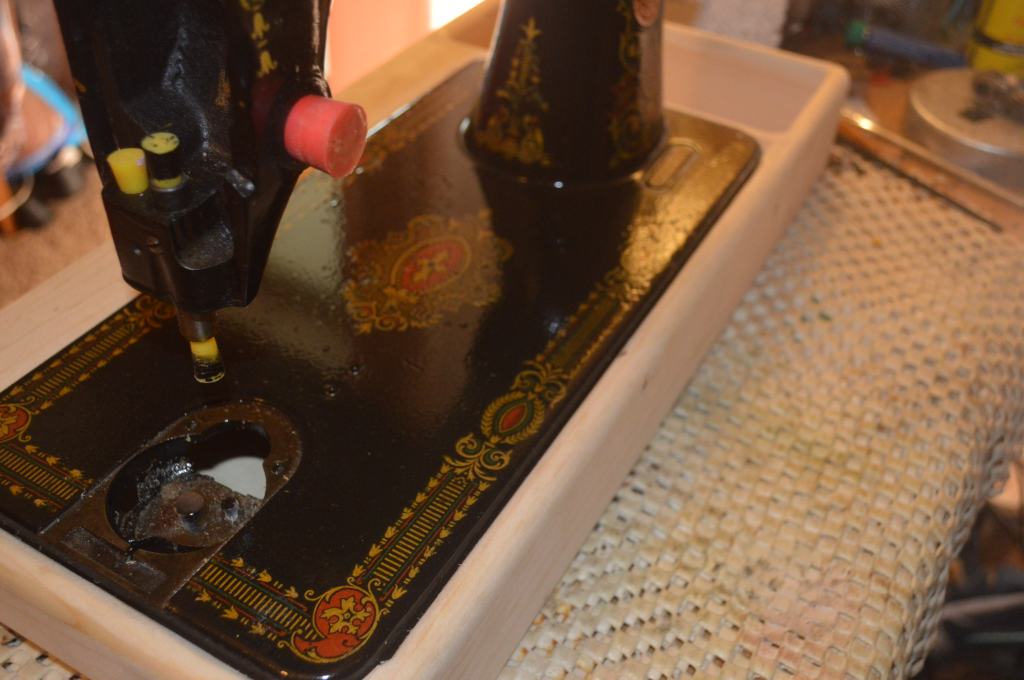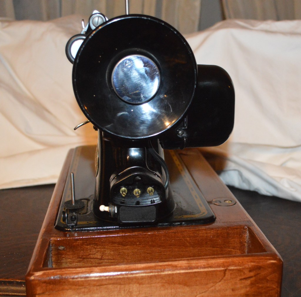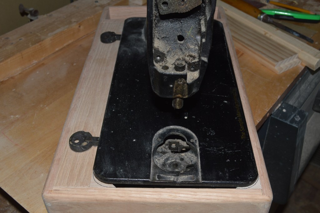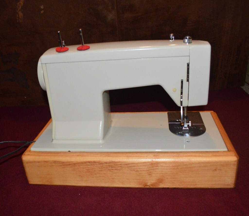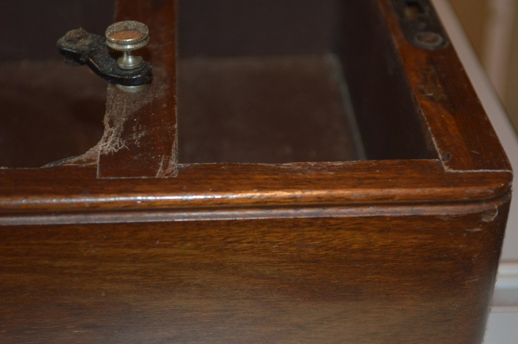 So, that’s it! The paint repairs turned out very nicely, and are hardly noticeable unless you know where to look. The machine turns smoothly and there is no perceptable slip or play in the assemblies. The parts are completely clean and the adjustments are just right for this machine. Finally, the pictures below show the final outcome. The customer ordered a custom made base in a Mocha stain, and this is base the machine is set into. All in all I think it is a very nice package, and I hope the customer is not only pleased, but uses her “new” Gimbels “Regular” machine for many years to come!
