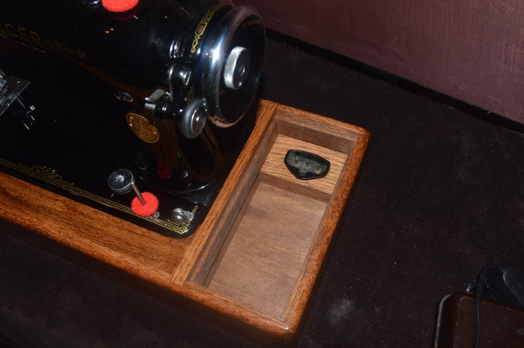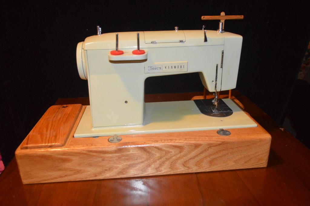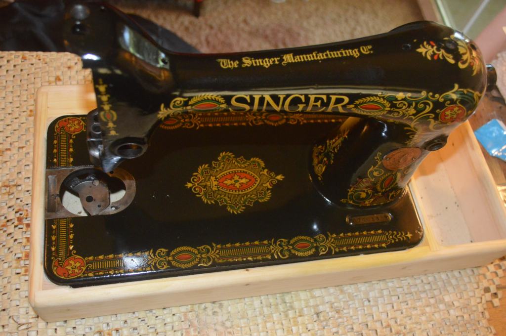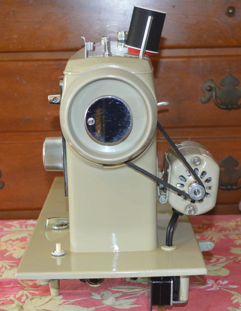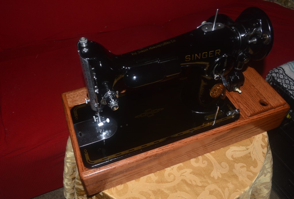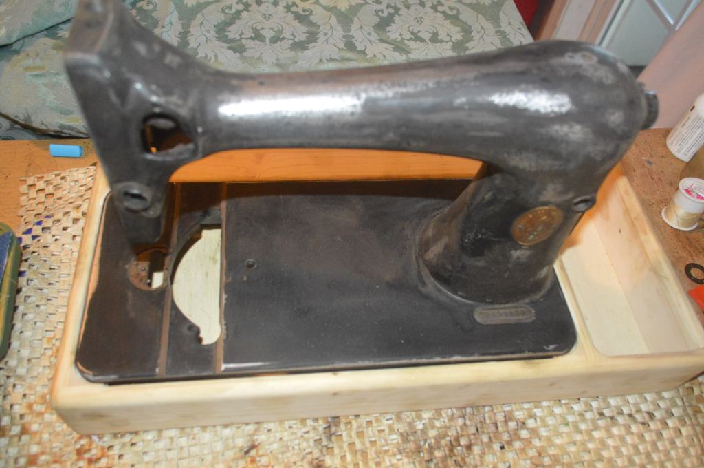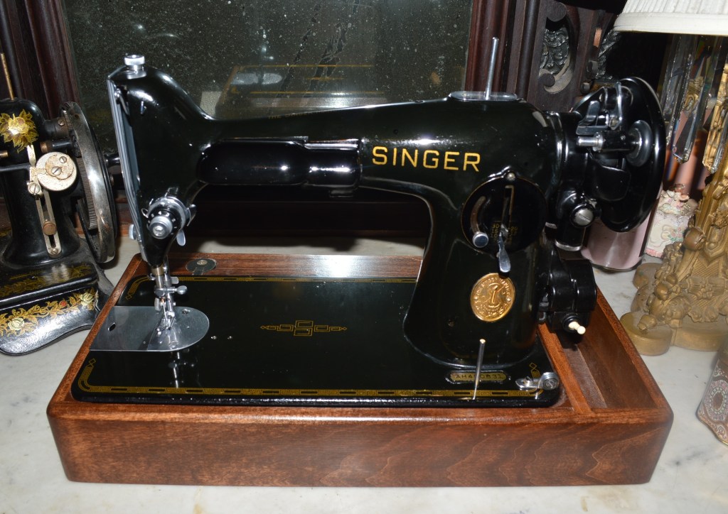 So, that’s it! The paint repairs turned out very nicely, and are hardly noticeable unless you know where to look. The machine turns smoothly and there is no perceptable slip or play in the assemblies. The parts are completely clean and the adjustments are just right for this machine. Finally, the pictures below show the final outcome. The customer ordered a custom made base in a Mocha stain, and this is base the machine is set into. All in all I think it is a very nice package, and I hope the customer is not only pleased, but uses her “new” Gimbels “Regular” machine for many years to come!