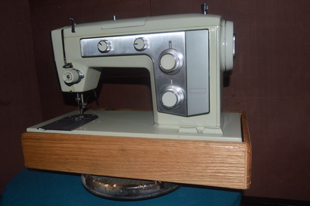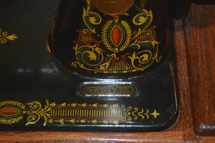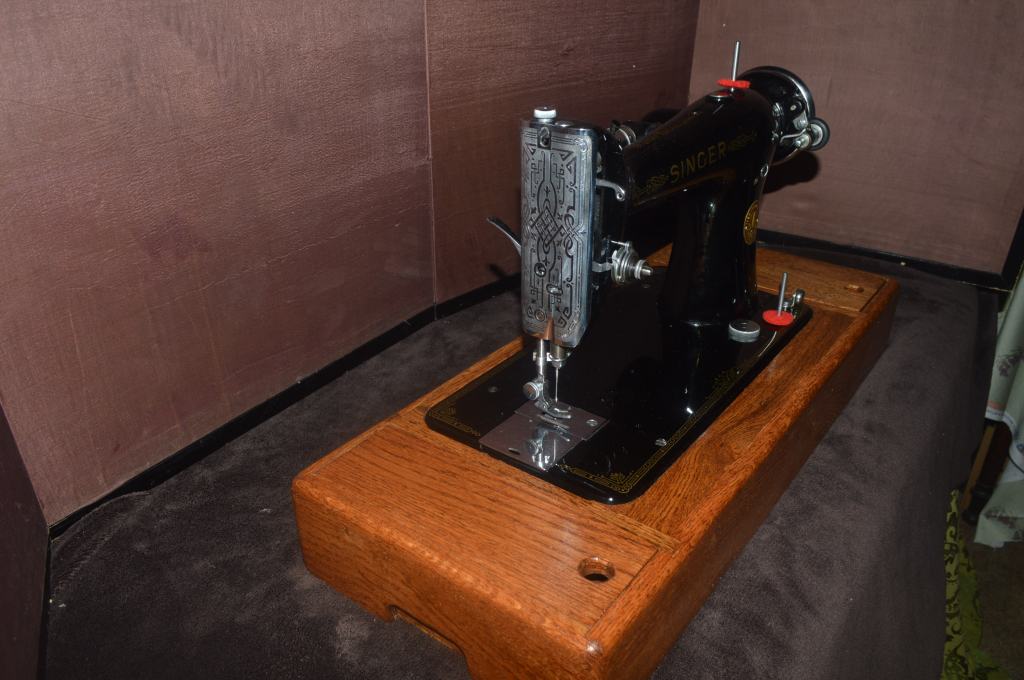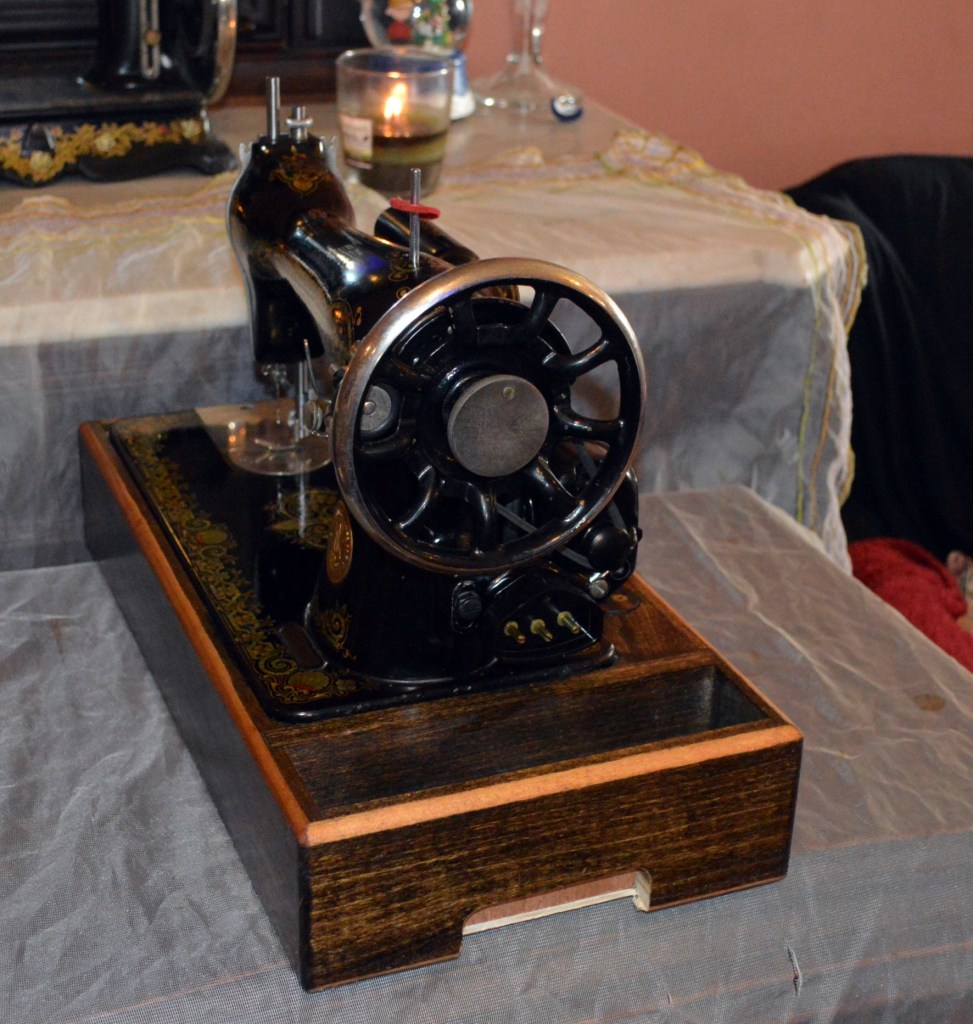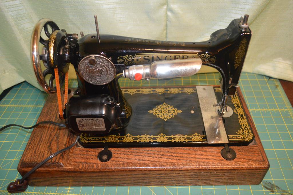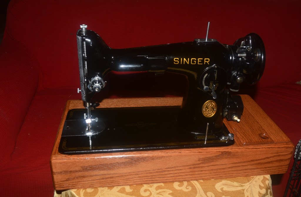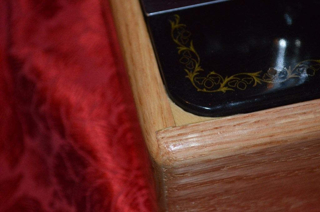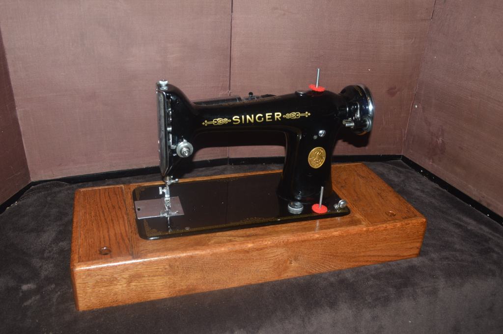 So, that’s it! The paint repairs turned out very nicely, and are hardly noticeable unless you know where to look. The machine turns smoothly and there is no perceptable slip or play in the assemblies. The parts are completely clean and the adjustments are just right for this machine. Finally, the pictures below show the final outcome. The customer ordered a custom made base in a Mocha stain, and this is base the machine is set into. All in all I think it is a very nice package, and I hope the customer is not only pleased, but uses her “new” Gimbels “Regular” machine for many years to come!