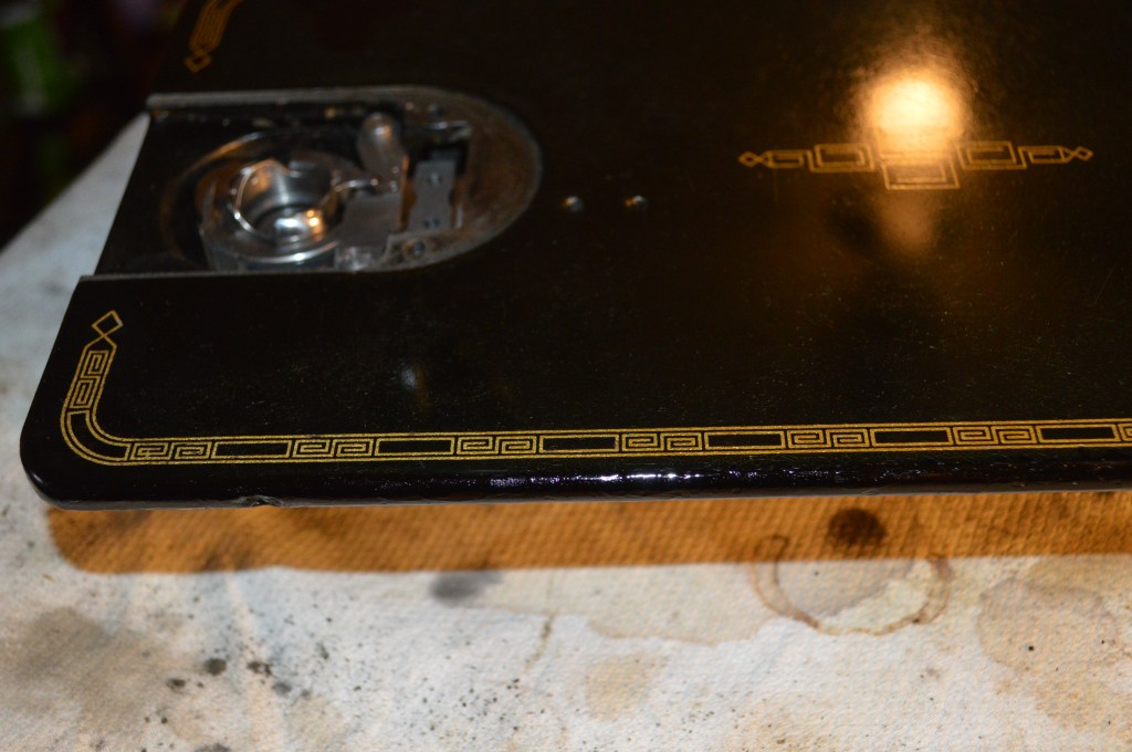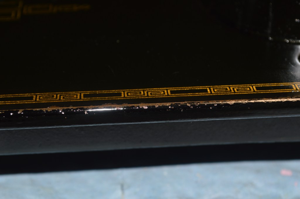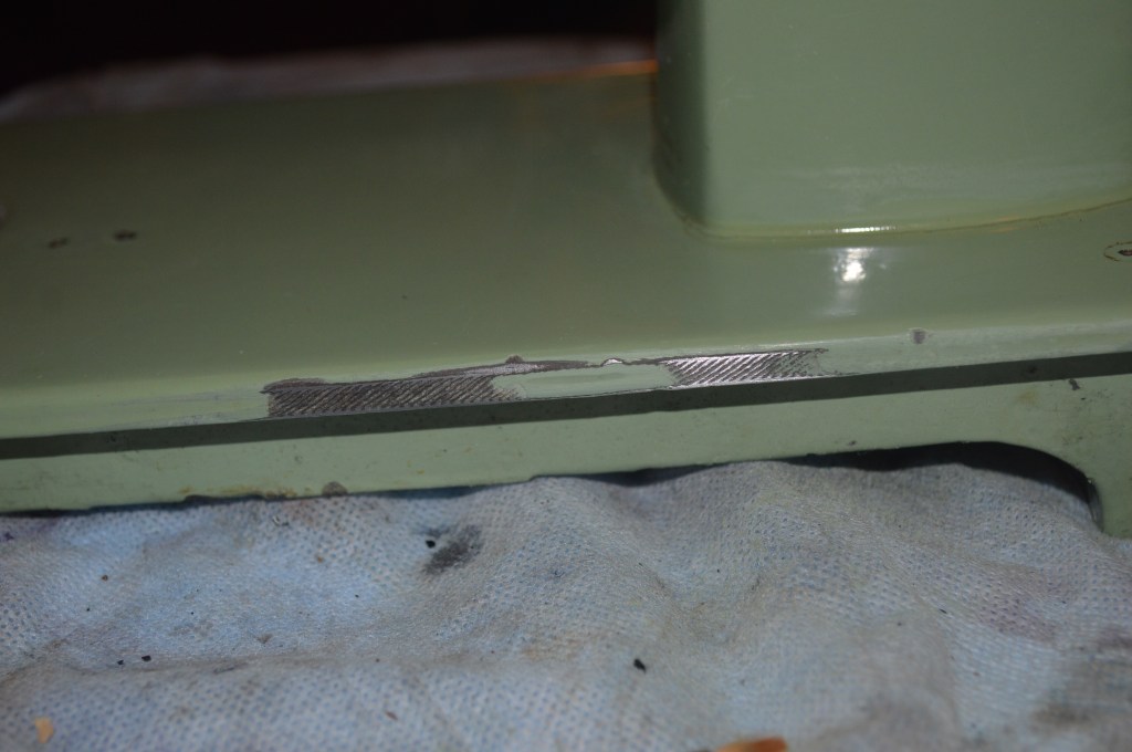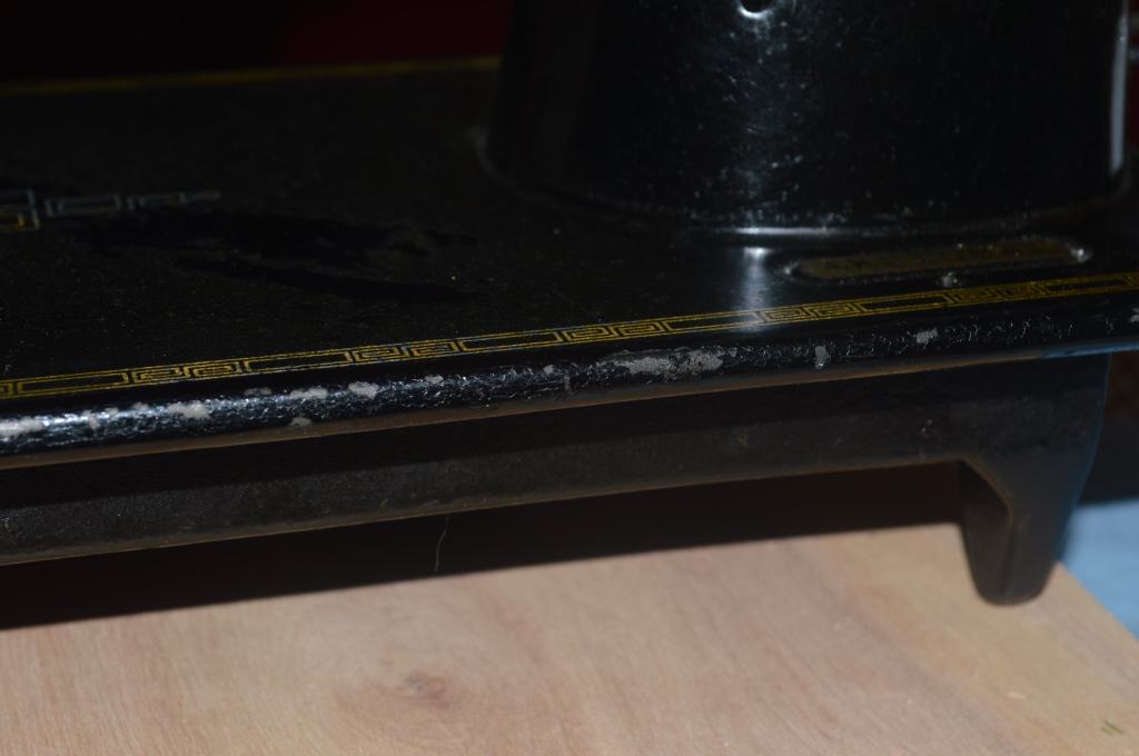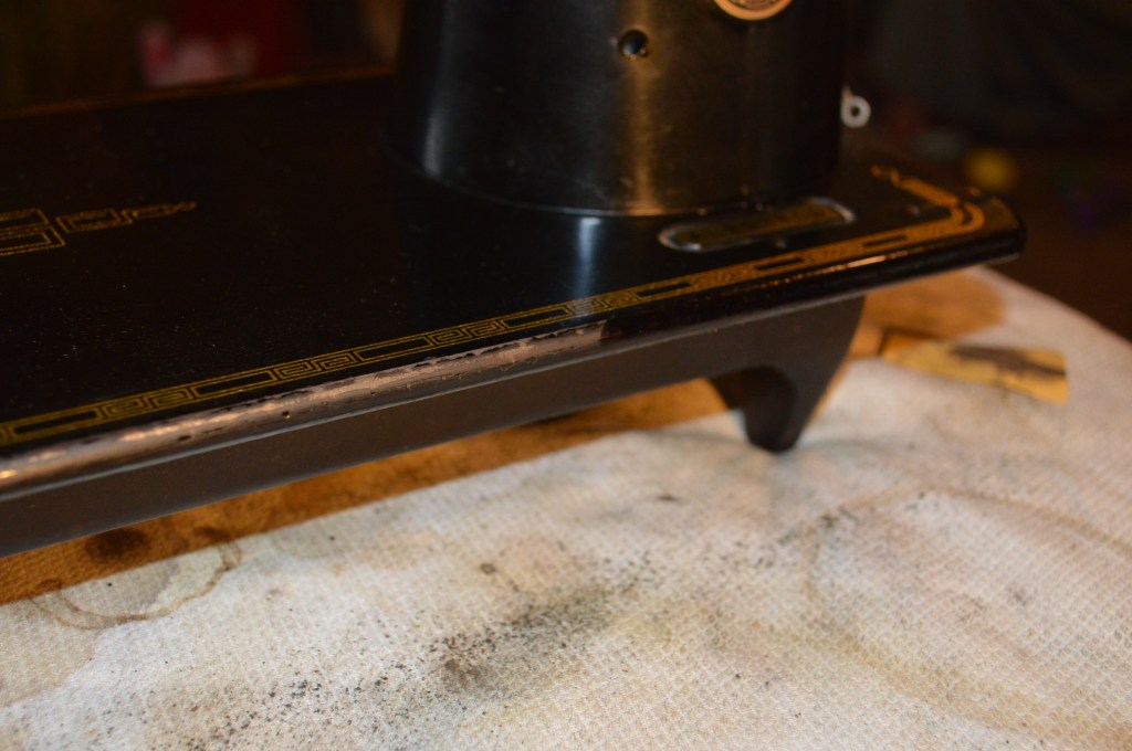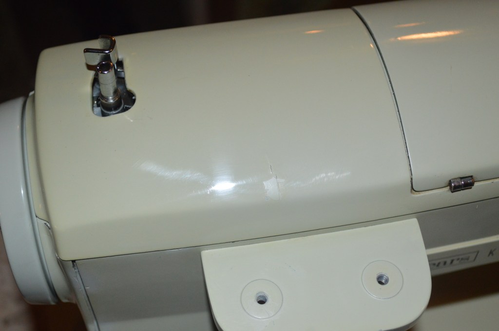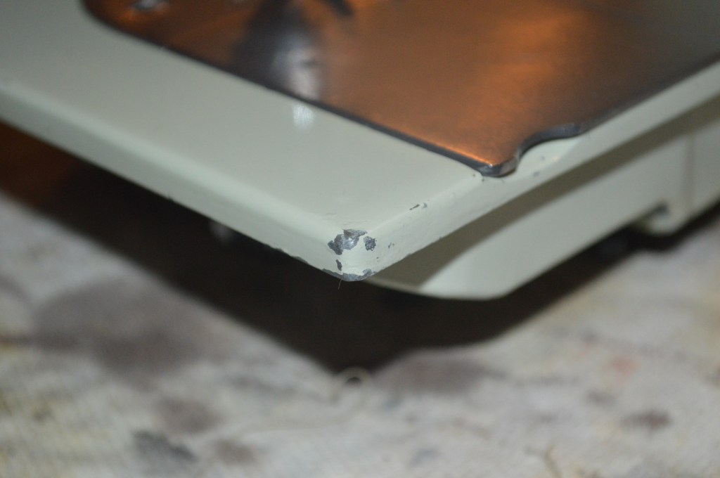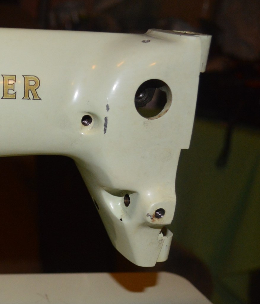 The scars on the sewing machine arm are too big to get a nearly invisible repair. Fortunately, the location is such that they are not “in your face” when seated in front of the machine. Paint matching will effectively make them far less obvious. The chips on the bed are another story.