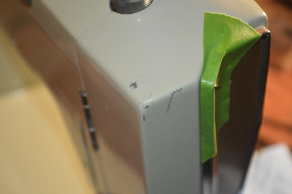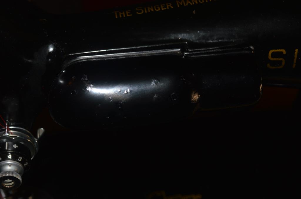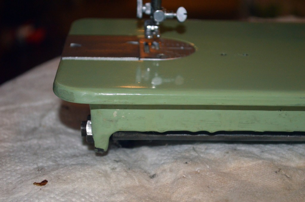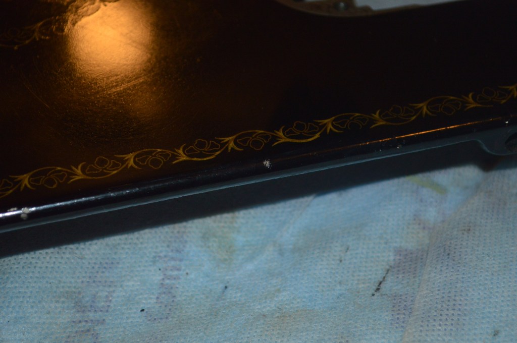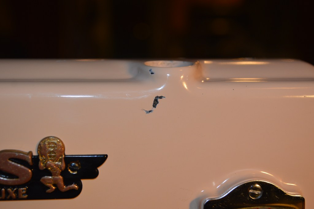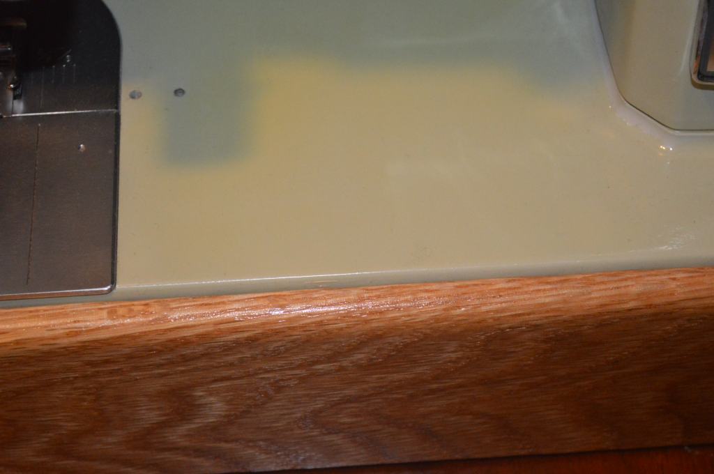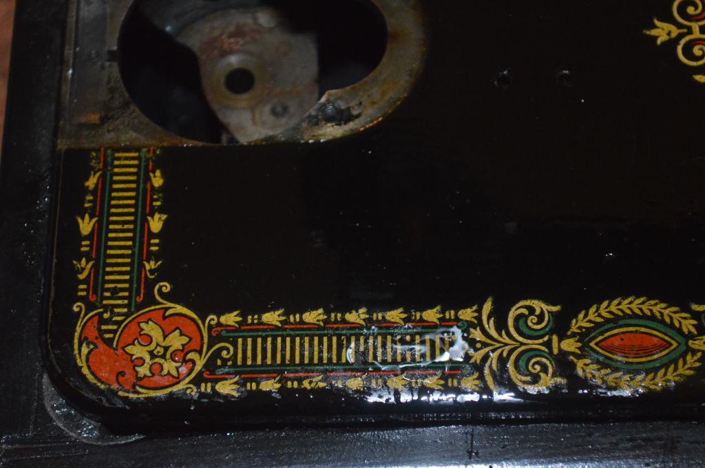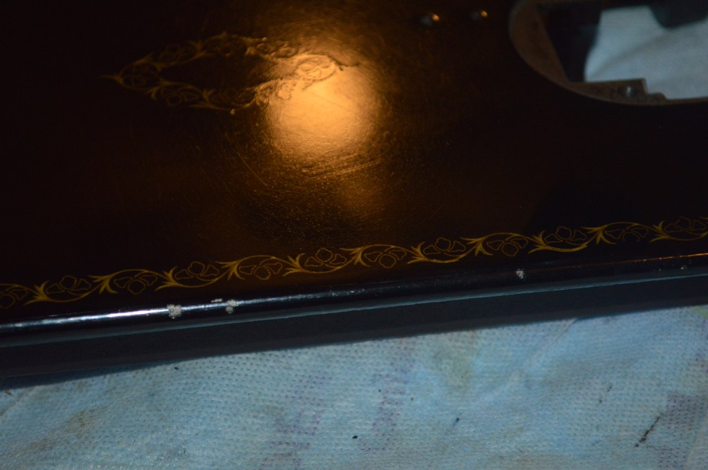 The scars on the sewing machine arm are too big to get a nearly invisible repair. Fortunately, the location is such that they are not “in your face” when seated in front of the machine. Paint matching will effectively make them far less obvious. The chips on the bed are another story.