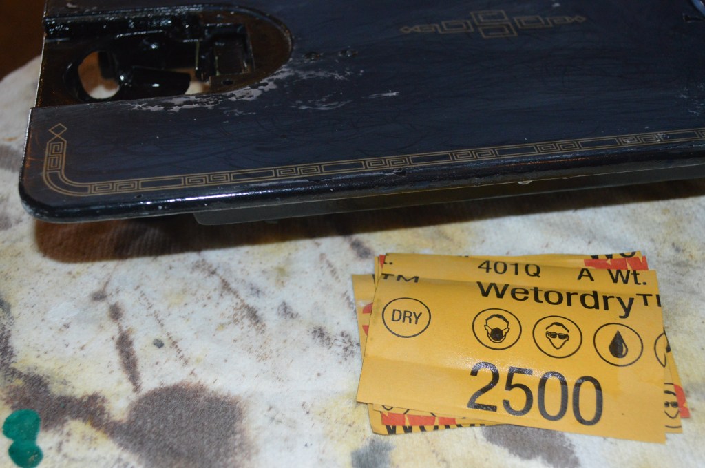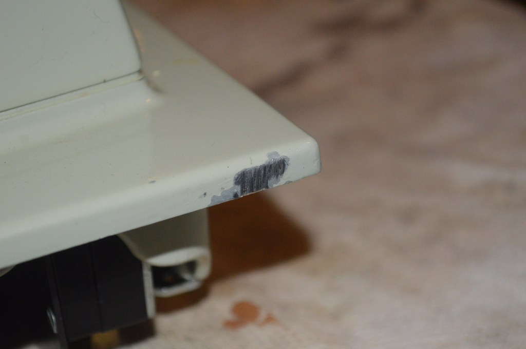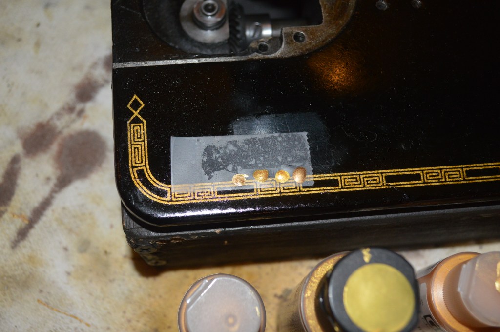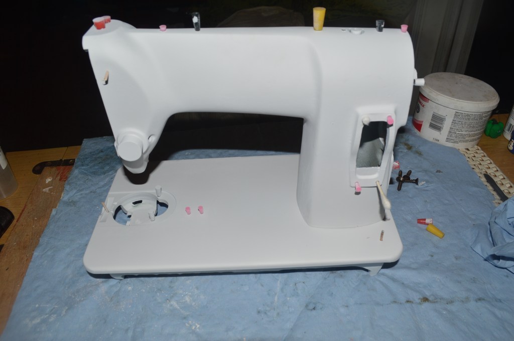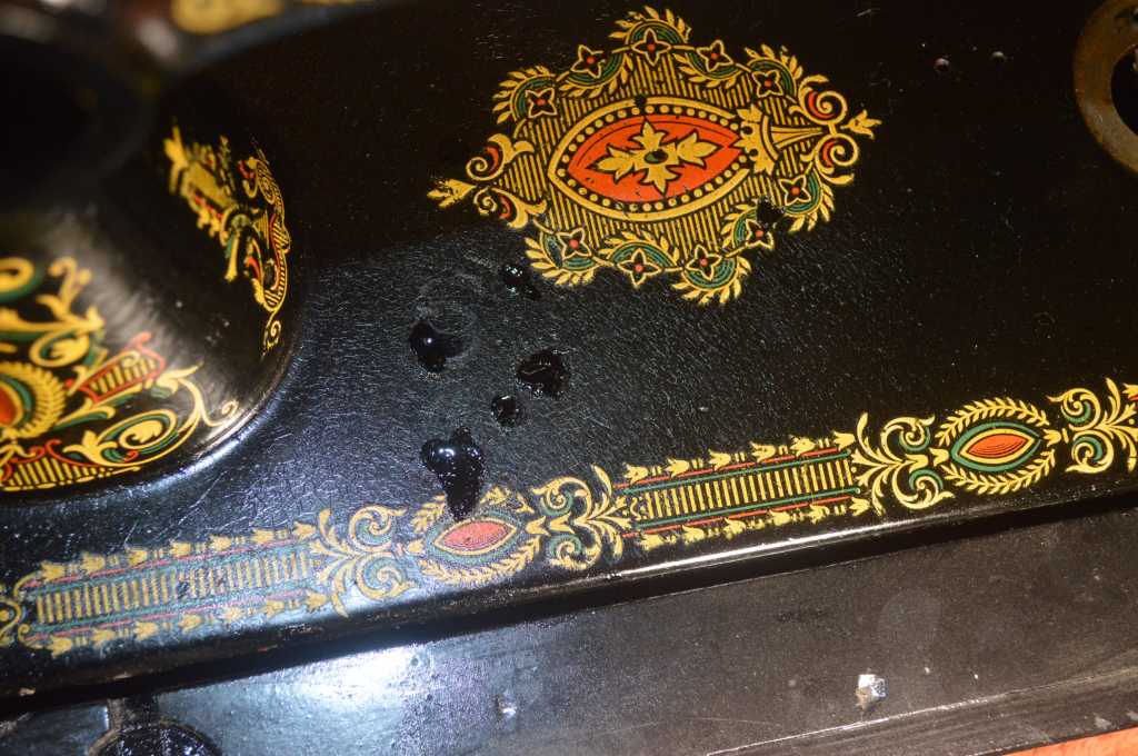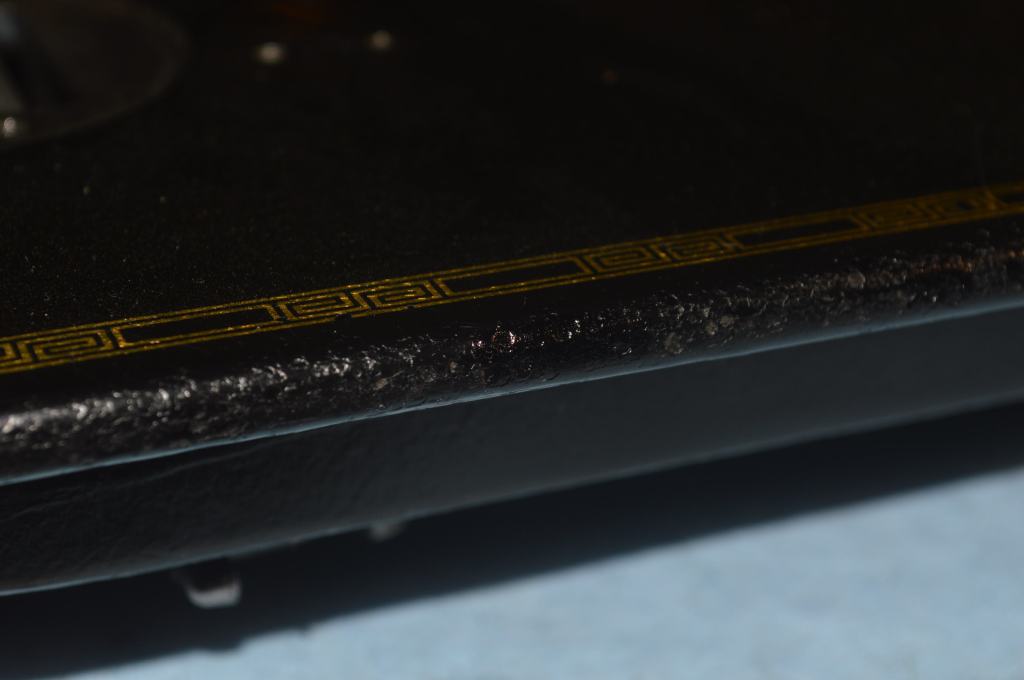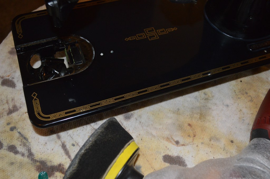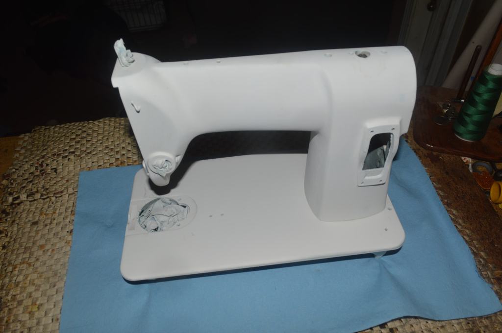 The scars on the sewing machine arm are too big to get a nearly invisible repair. Fortunately, the location is such that they are not “in your face” when seated in front of the machine. Paint matching will effectively make them far less obvious. The chips on the bed are another story.