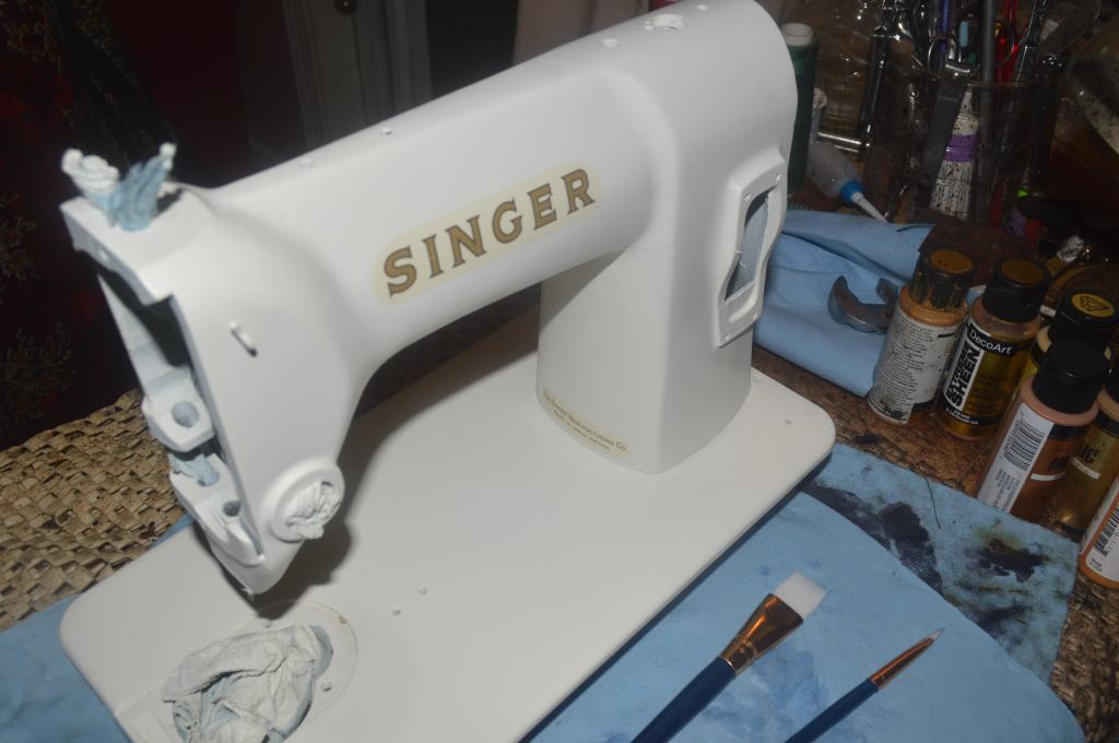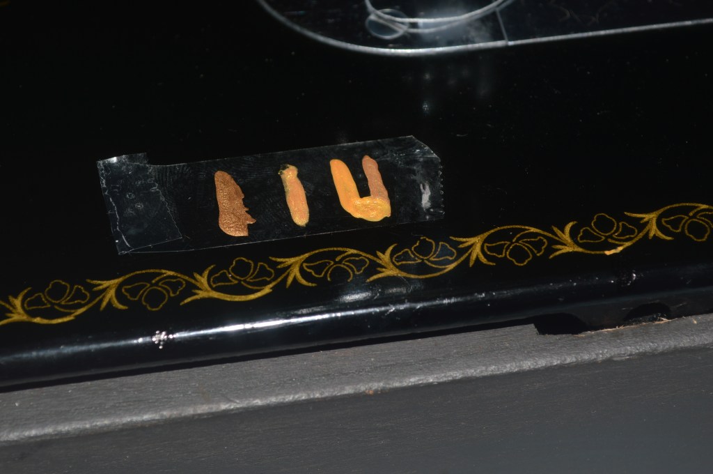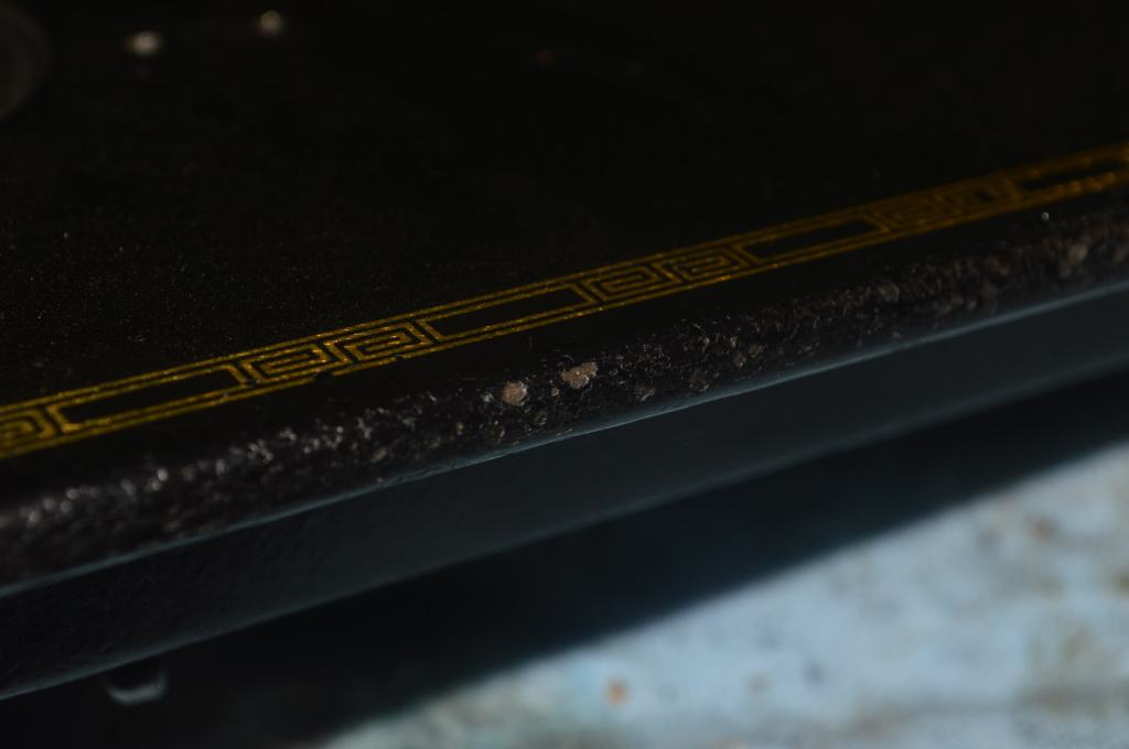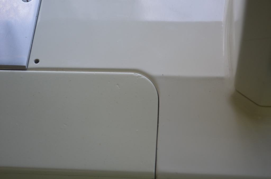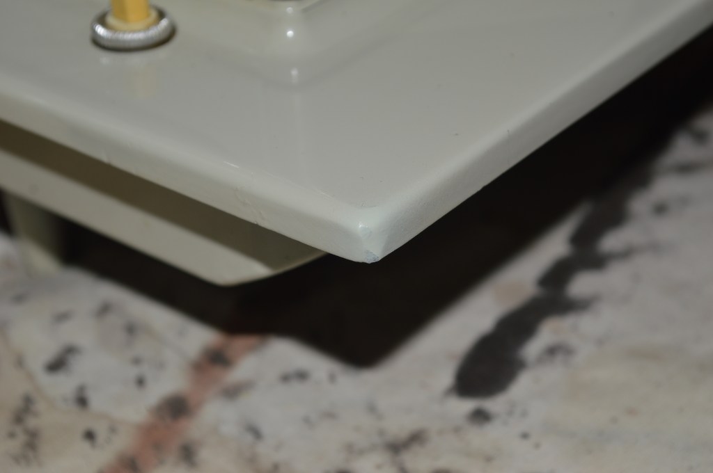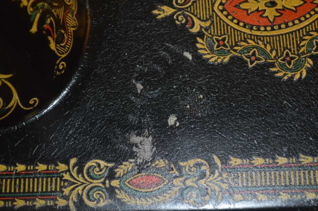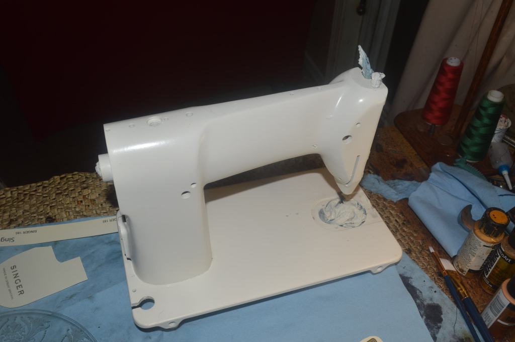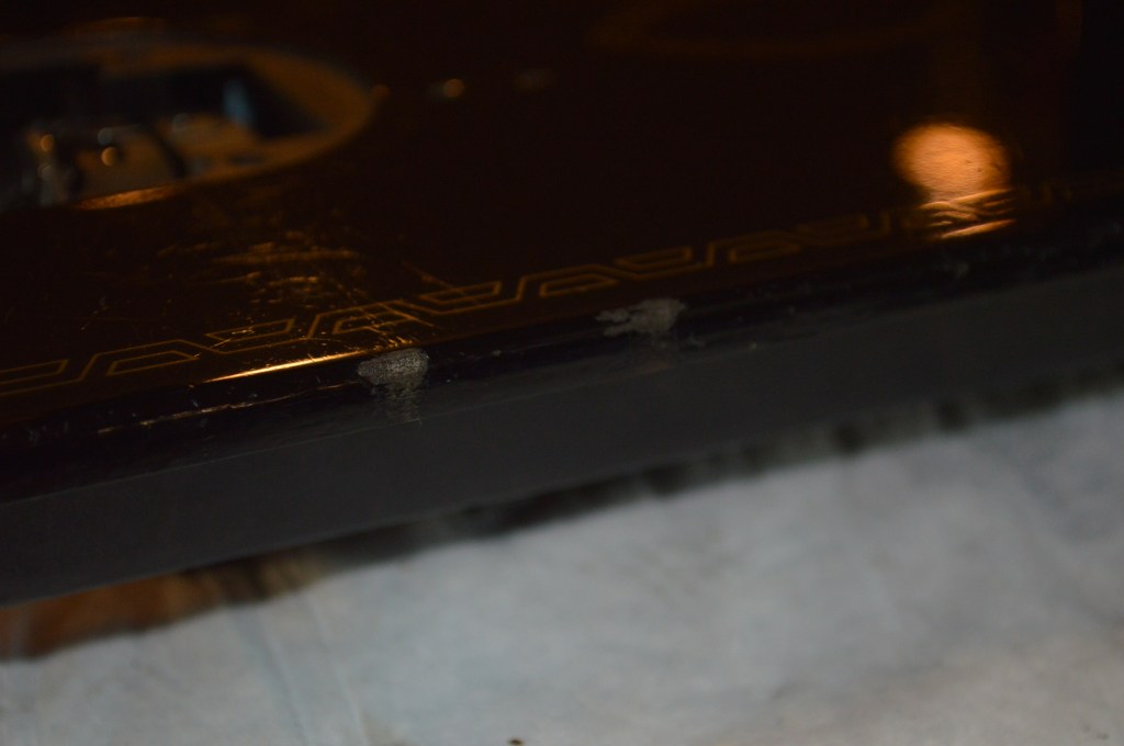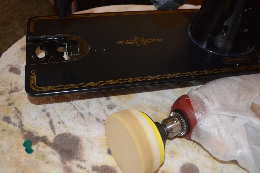 The scars on the sewing machine arm are too big to get a nearly invisible repair. Fortunately, the location is such that they are not “in your face” when seated in front of the machine. Paint matching will effectively make them far less obvious. The chips on the bed are another story.