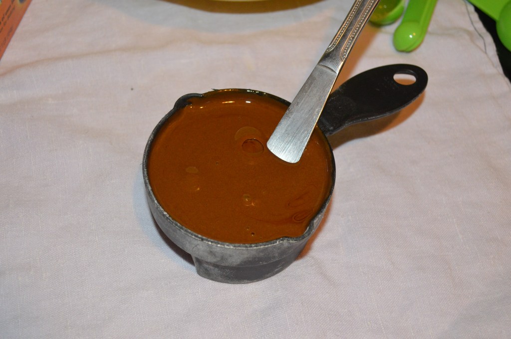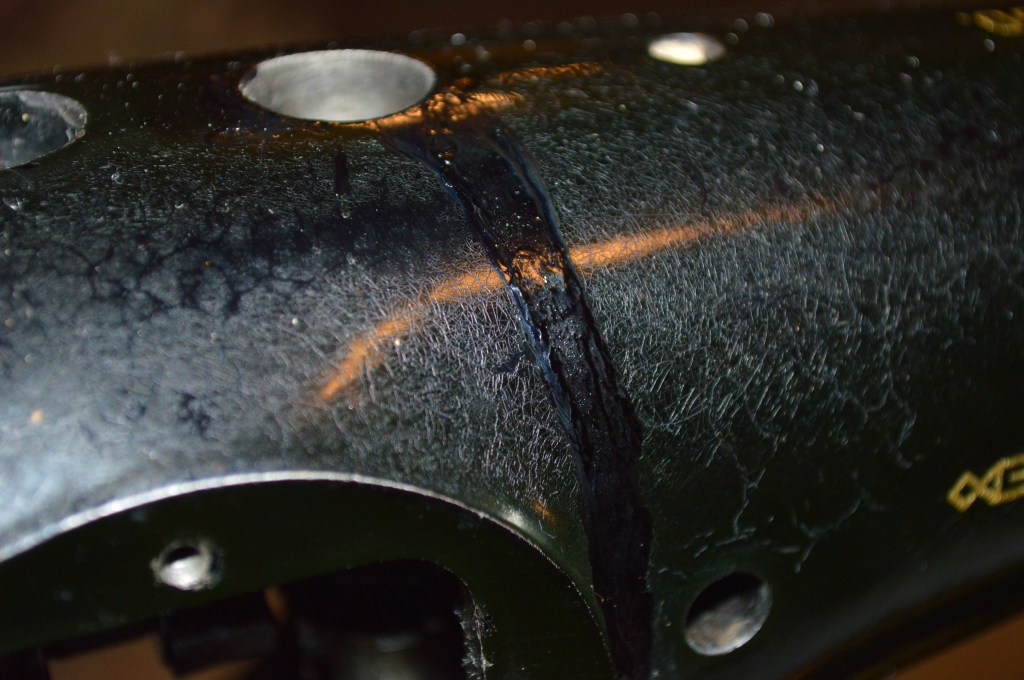 It can’t be filled, so paint is applied in two coats to the borders and then feathered as best I can to hide the repair.