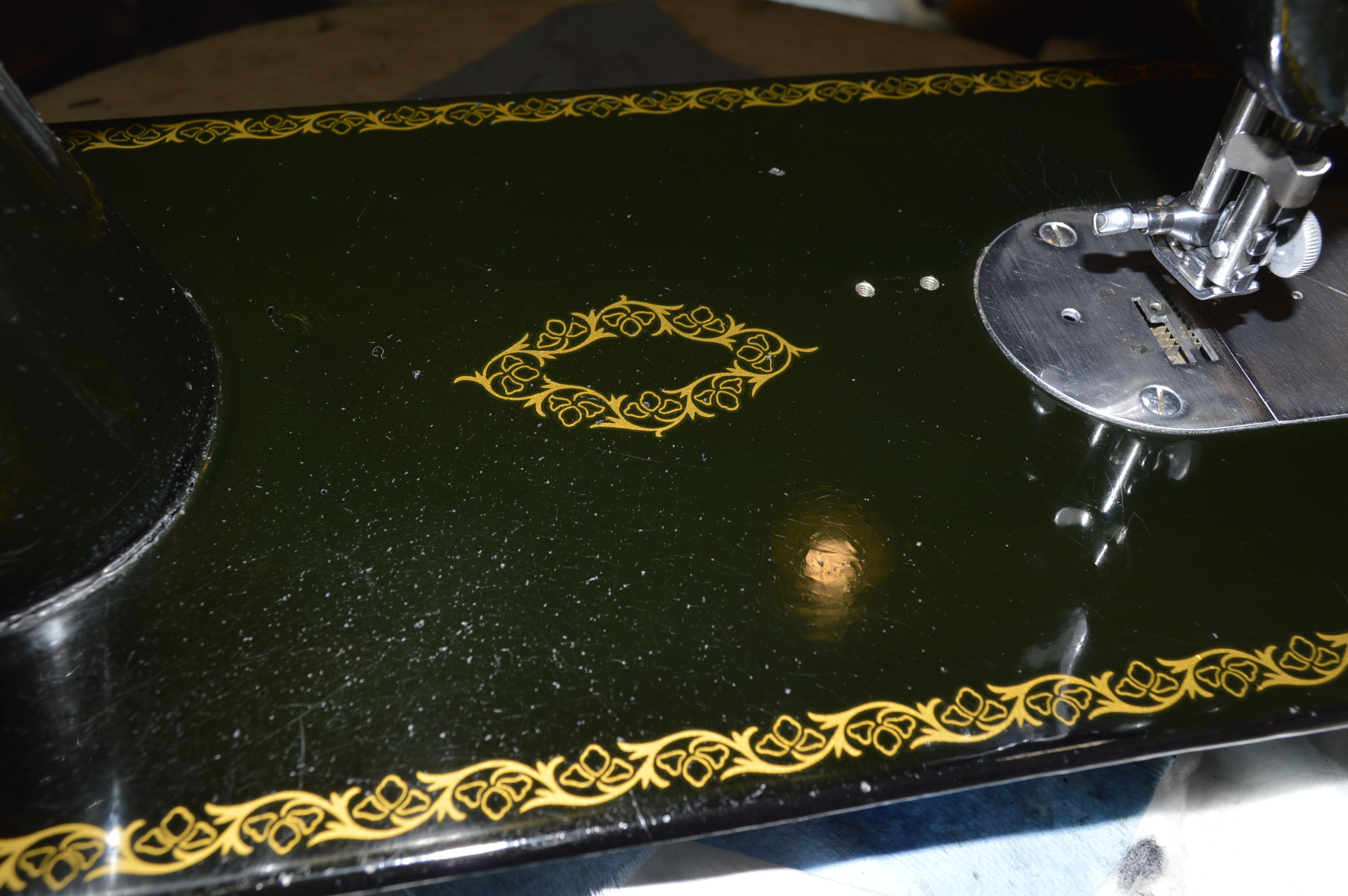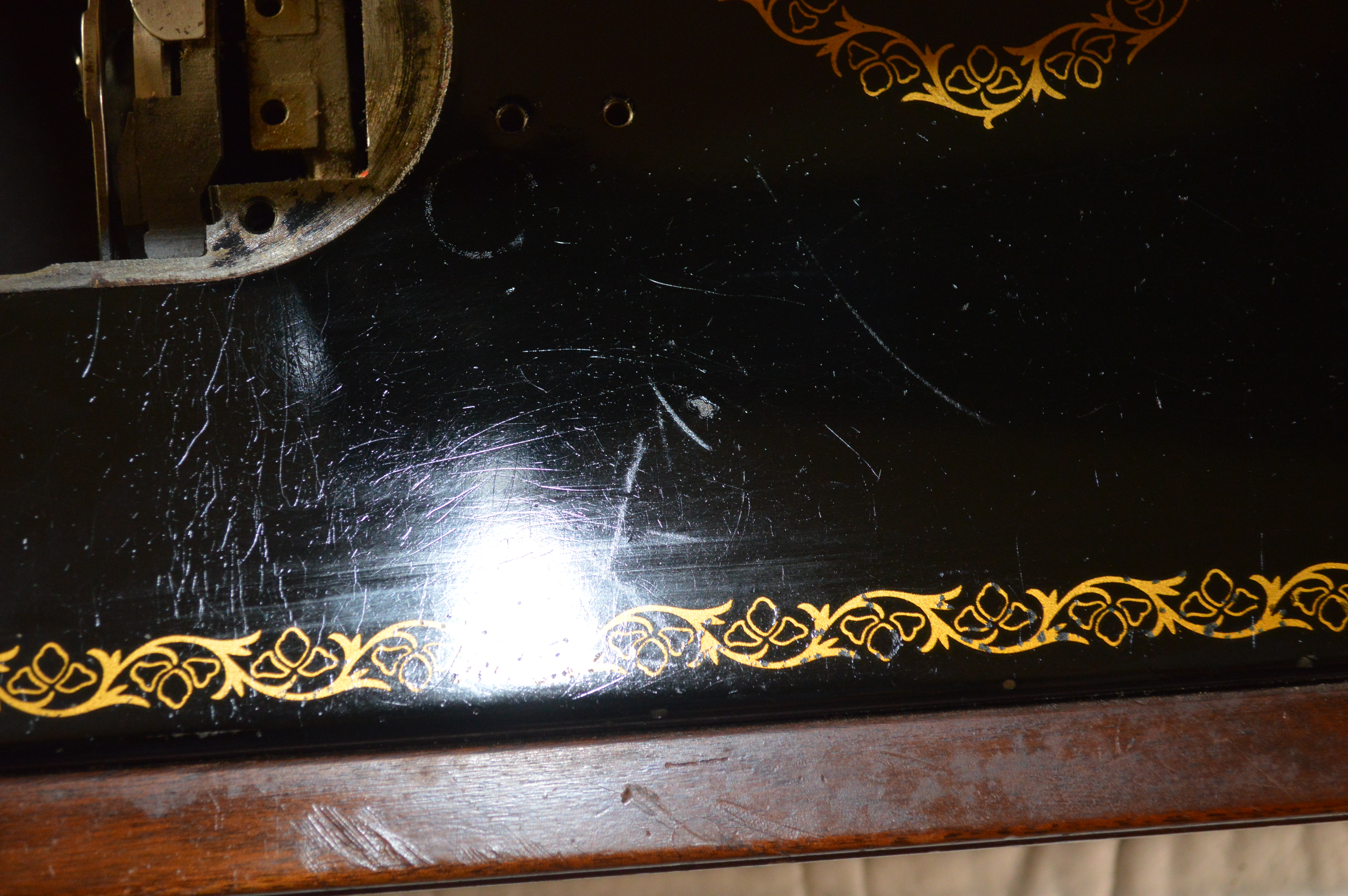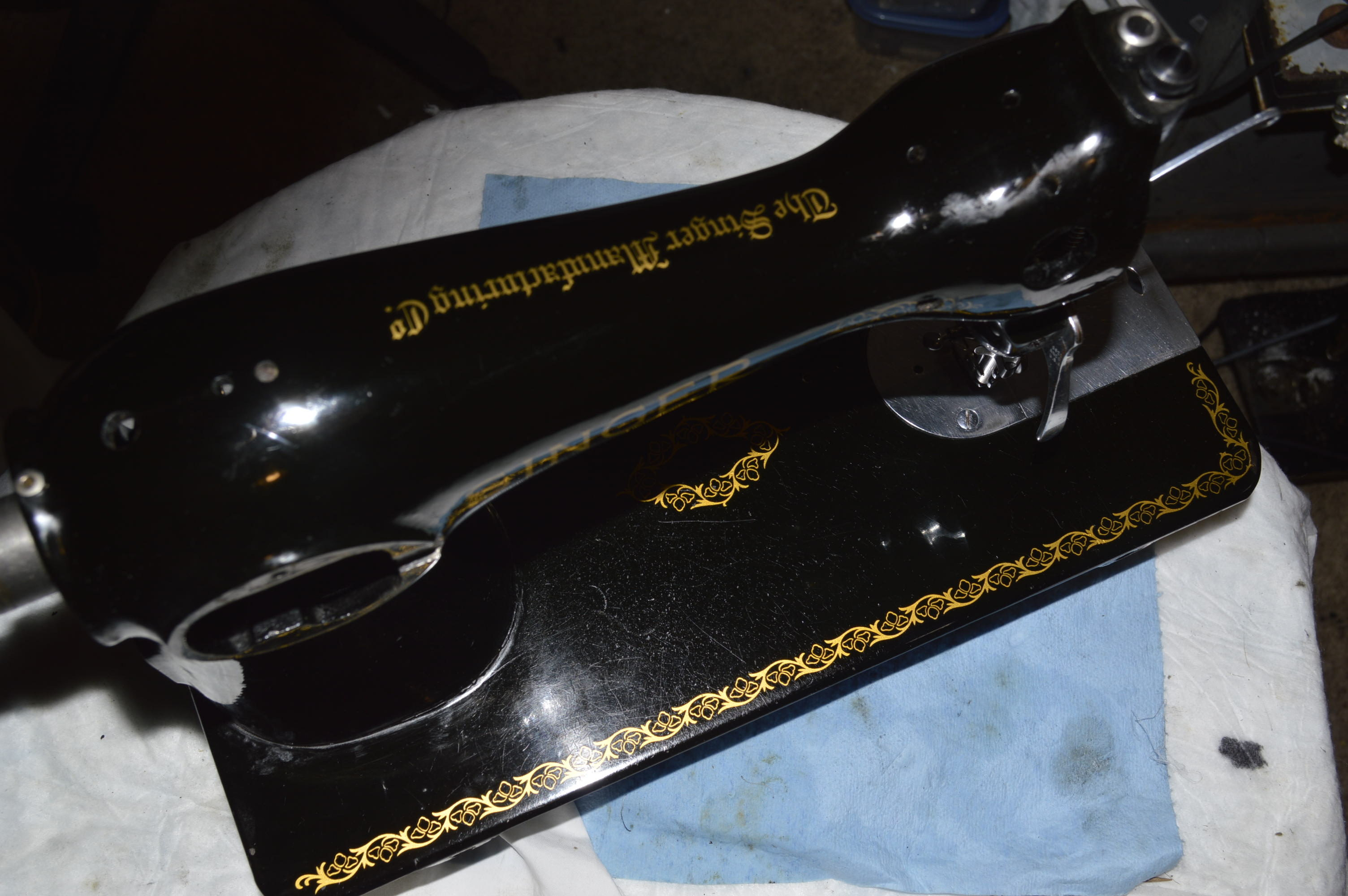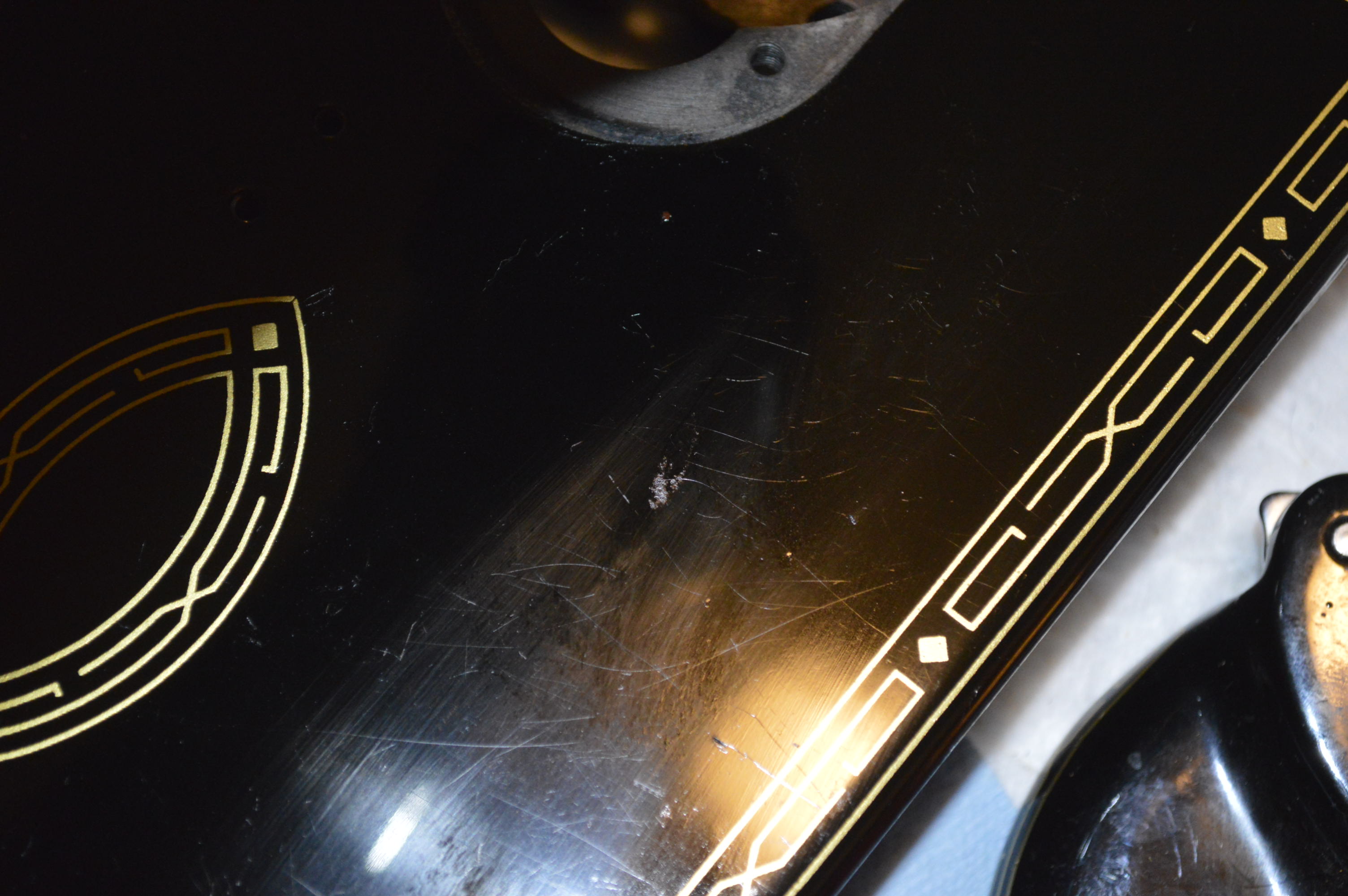 What I want you to focus on in these pictures is the green hue… see it? I took these pictures without the camera flash while I was shining a flashlight on the painted finish. This green hue is the shellac coating Singer applied over the black japanned finish. It is invisible in normal light unless you look very closely for it. This shellac coating is what protects the lacquer finish, and more importantly, the decals from damage. Loss of the shellac coating is normal wear and tear, and it is a good indicator of how the machine was used. Not surprisingly, machines in excellent condition will show an even green hue over the complete body of the machine. Otherwise, looking at the machine in normal light, it is pretty darn black.