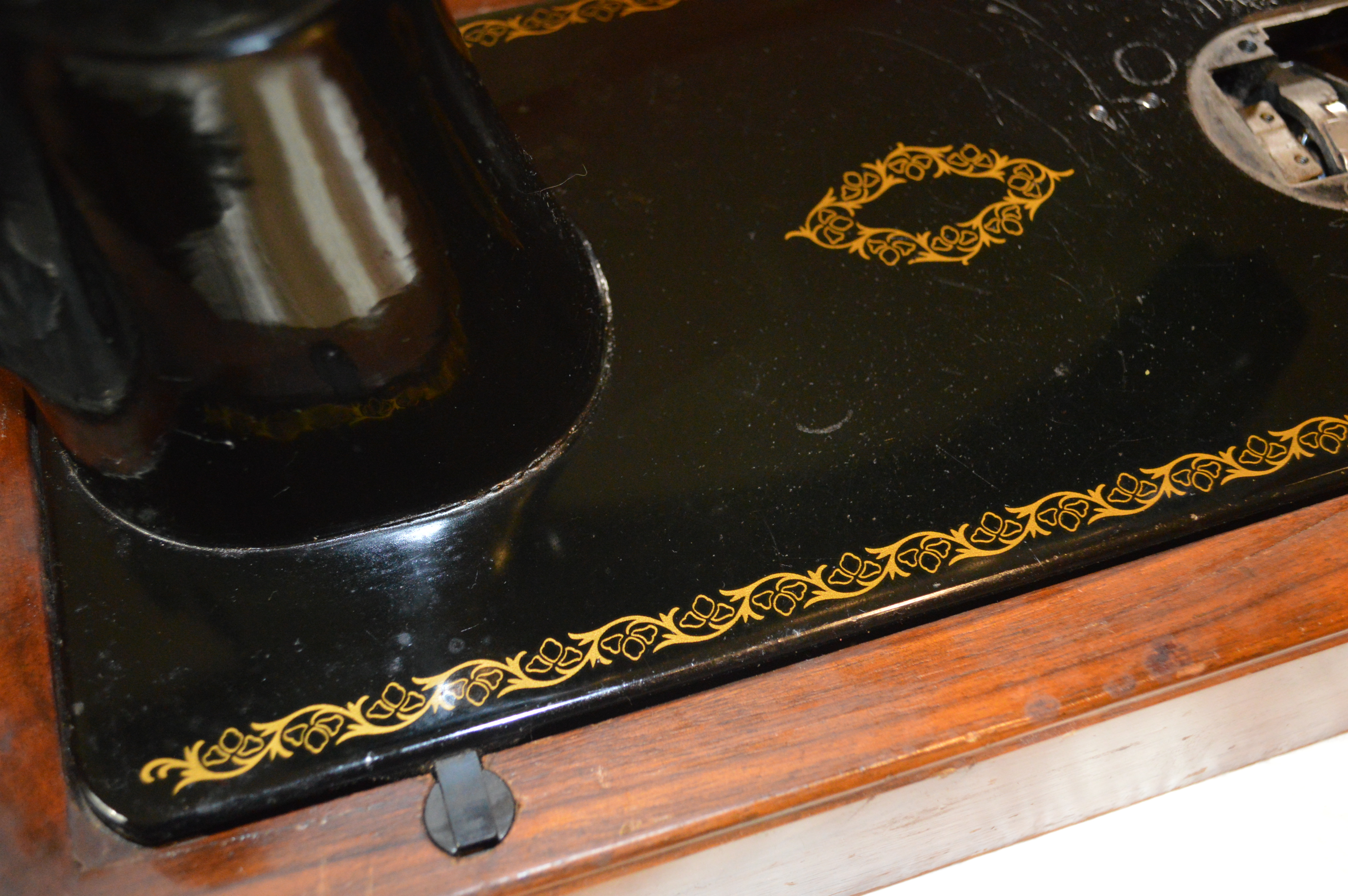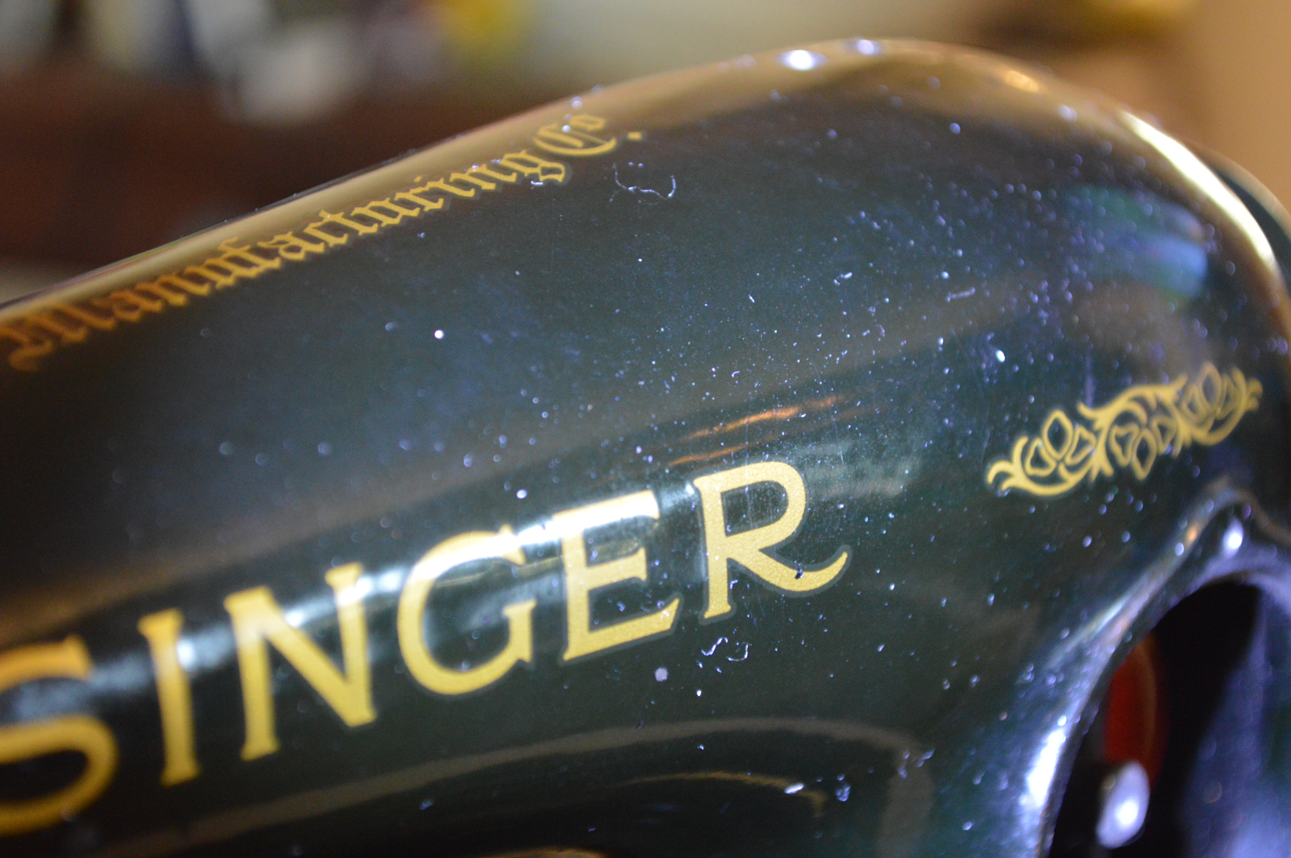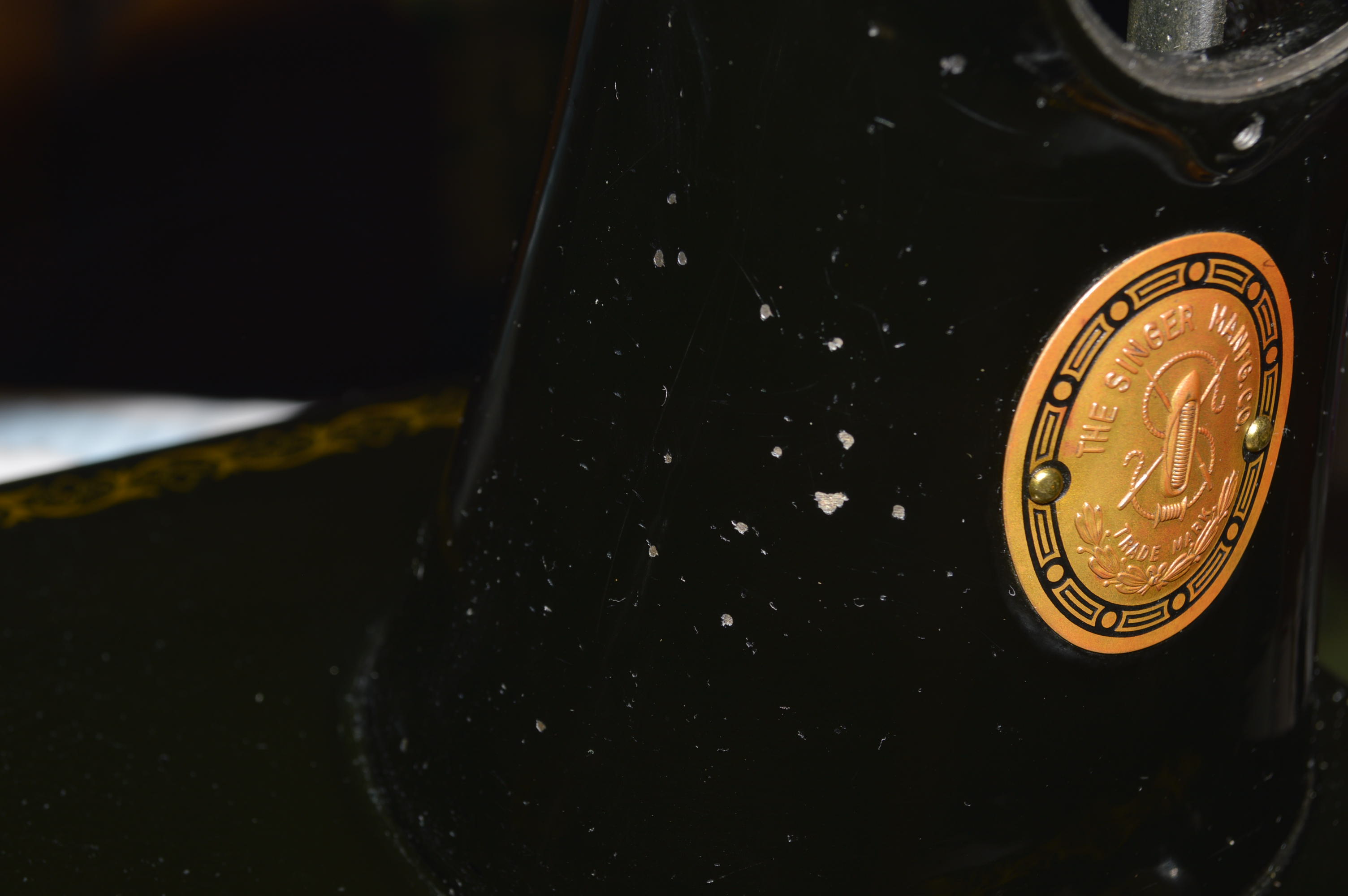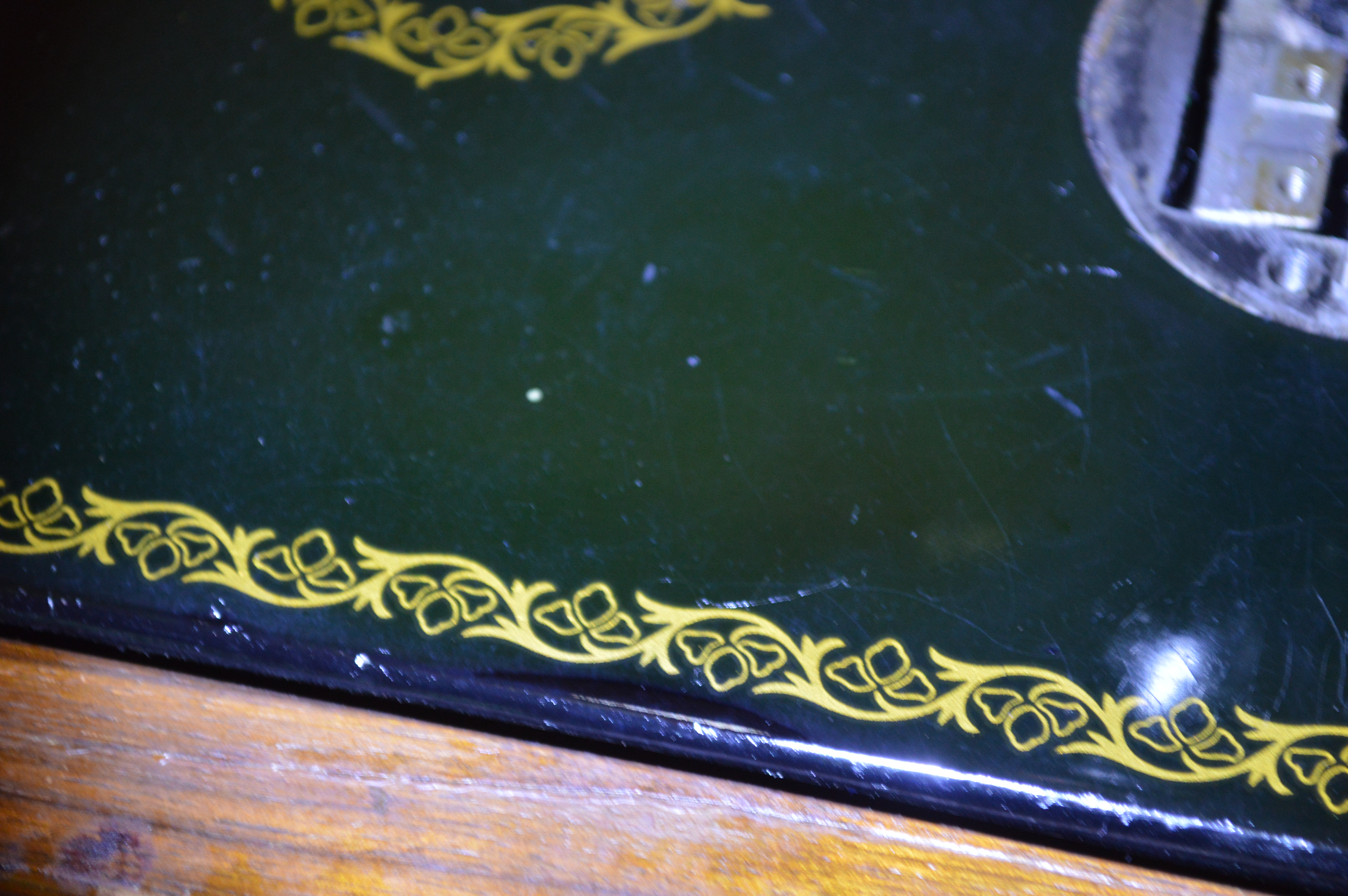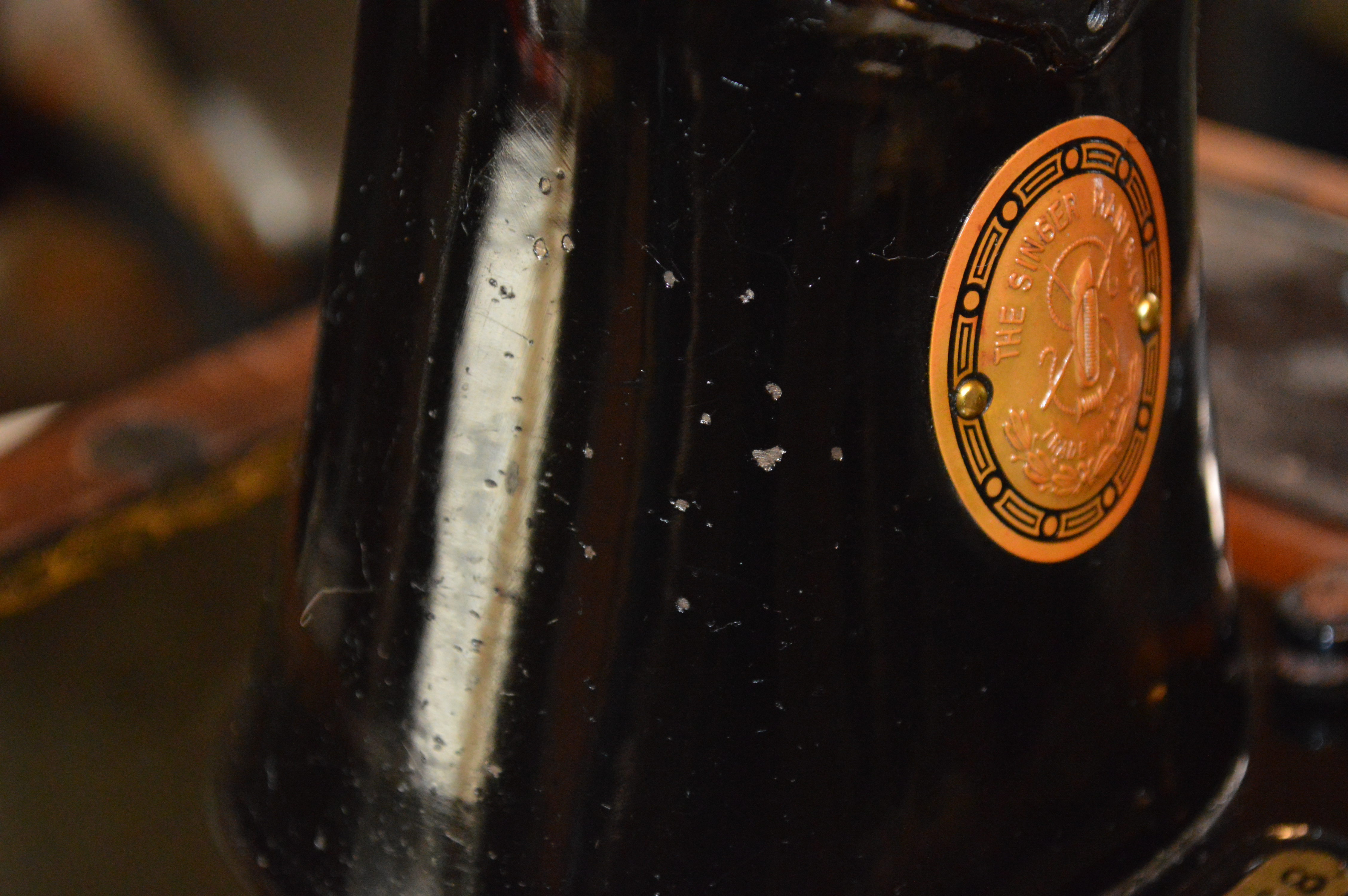 What I want you to focus on in these pictures is the green hue… see it? I took these pictures without the camera flash while I was shining a flashlight on the painted finish. This green hue is the shellac coating Singer applied over the black japanned finish. It is invisible in normal light unless you look very closely for it. This shellac coating is what protects the lacquer finish, and more importantly, the decals from damage. Loss of the shellac coating is normal wear and tear, and it is a good indicator of how the machine was used. Not surprisingly, machines in excellent condition will show an even green hue over the complete body of the machine. Otherwise, looking at the machine in normal light, it is pretty darn black.