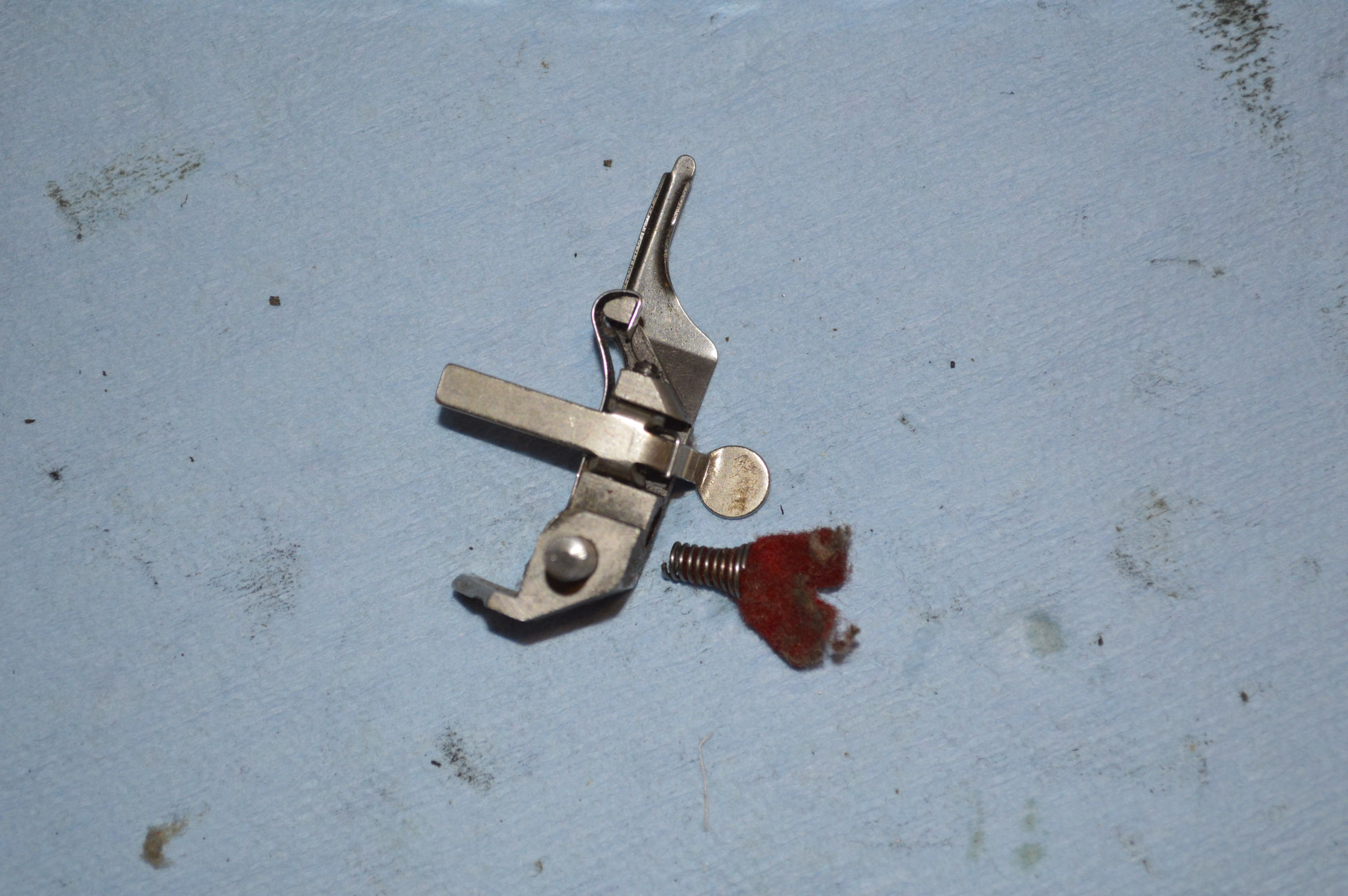 The small leaf spring performs the same task as the tension discs in the top tension mechanism. It is adjusted with a small screw to regulate the clamping force, or “drag” on the bobbin thread. If you look closely, you will see corrosion on the bobbin case, and crud on the leaf spring… all of it is directly in the thread path. Often overlooked, this is a very important part of servicing a sewing machine. After a soft bristle steel wire wheel, it is good as new.