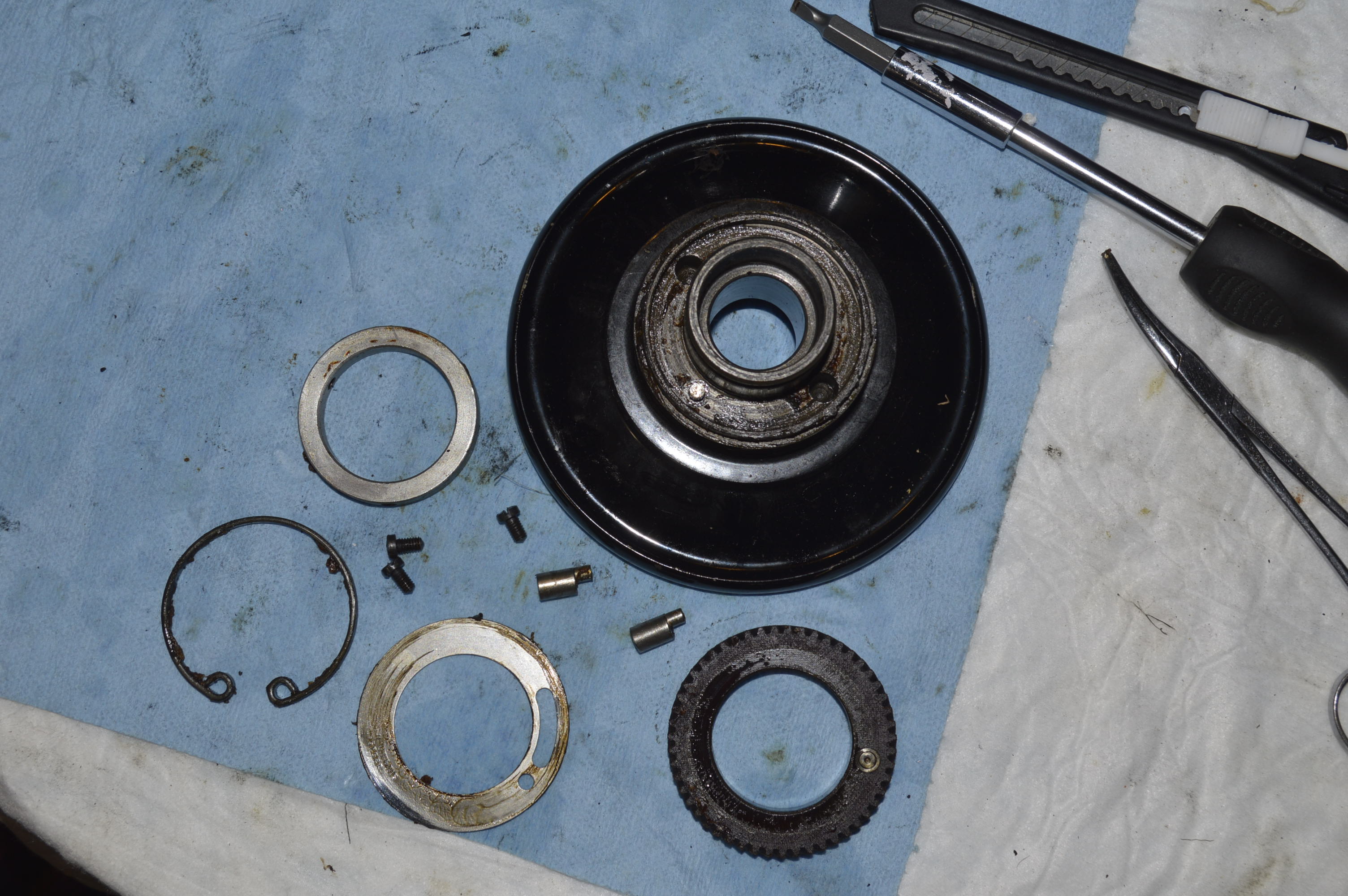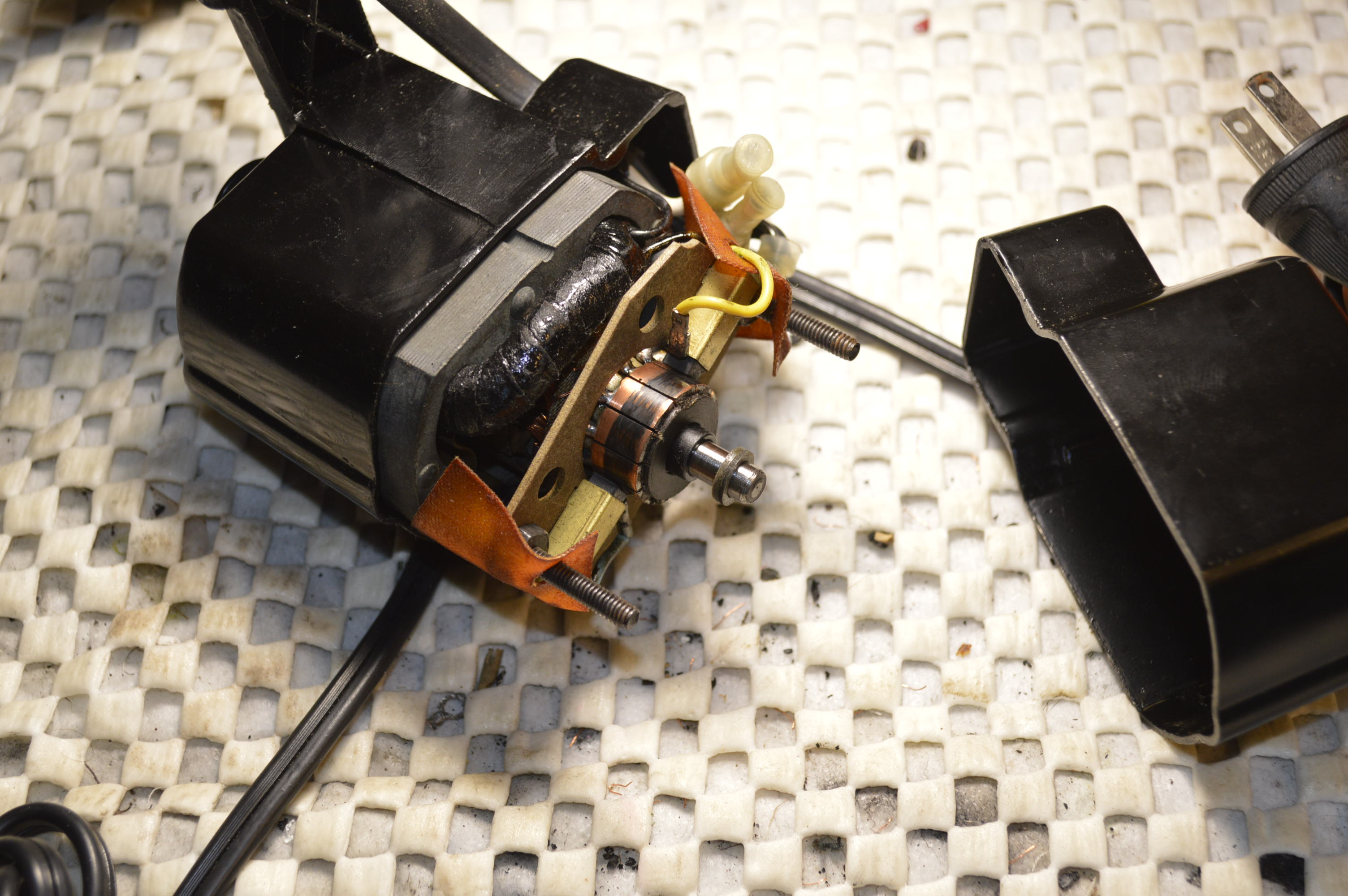 I disassembled the motor and was expecting that the normal motor servicing would be adequate… boy was I wrong! The motor was in pretty bad shape and the motor housing was cracked. Normally, I would replace the motor at this point, but then we wouldn’t learn anything! The motor bits after disassembly looks like this: