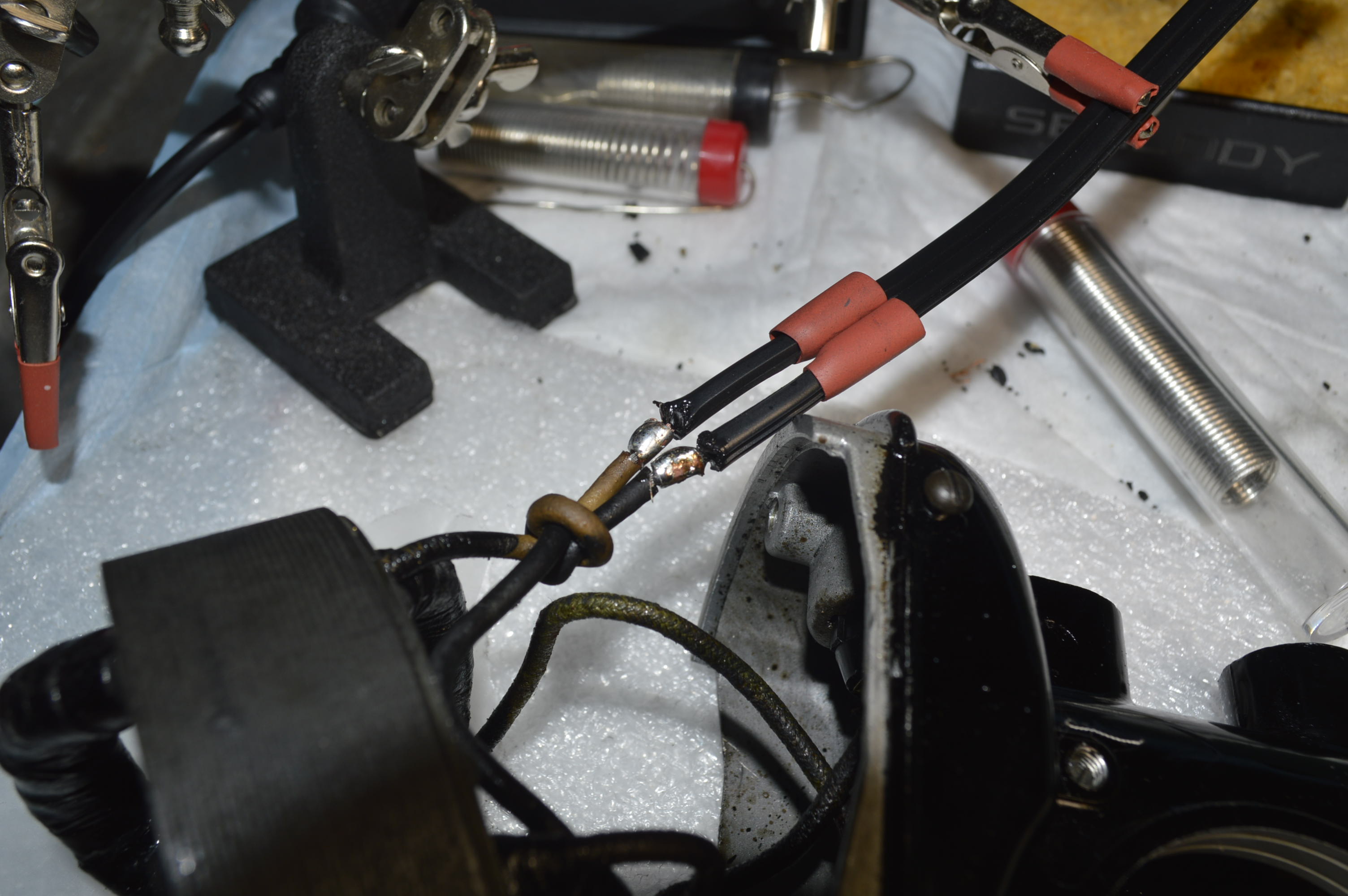 The coil is clean and the wires are stripped back and ready for the new wire. Note the white, black, and red tubes in the plastic bag? That is shrink tubing. We MUST use this, electrical tape won’t work here.