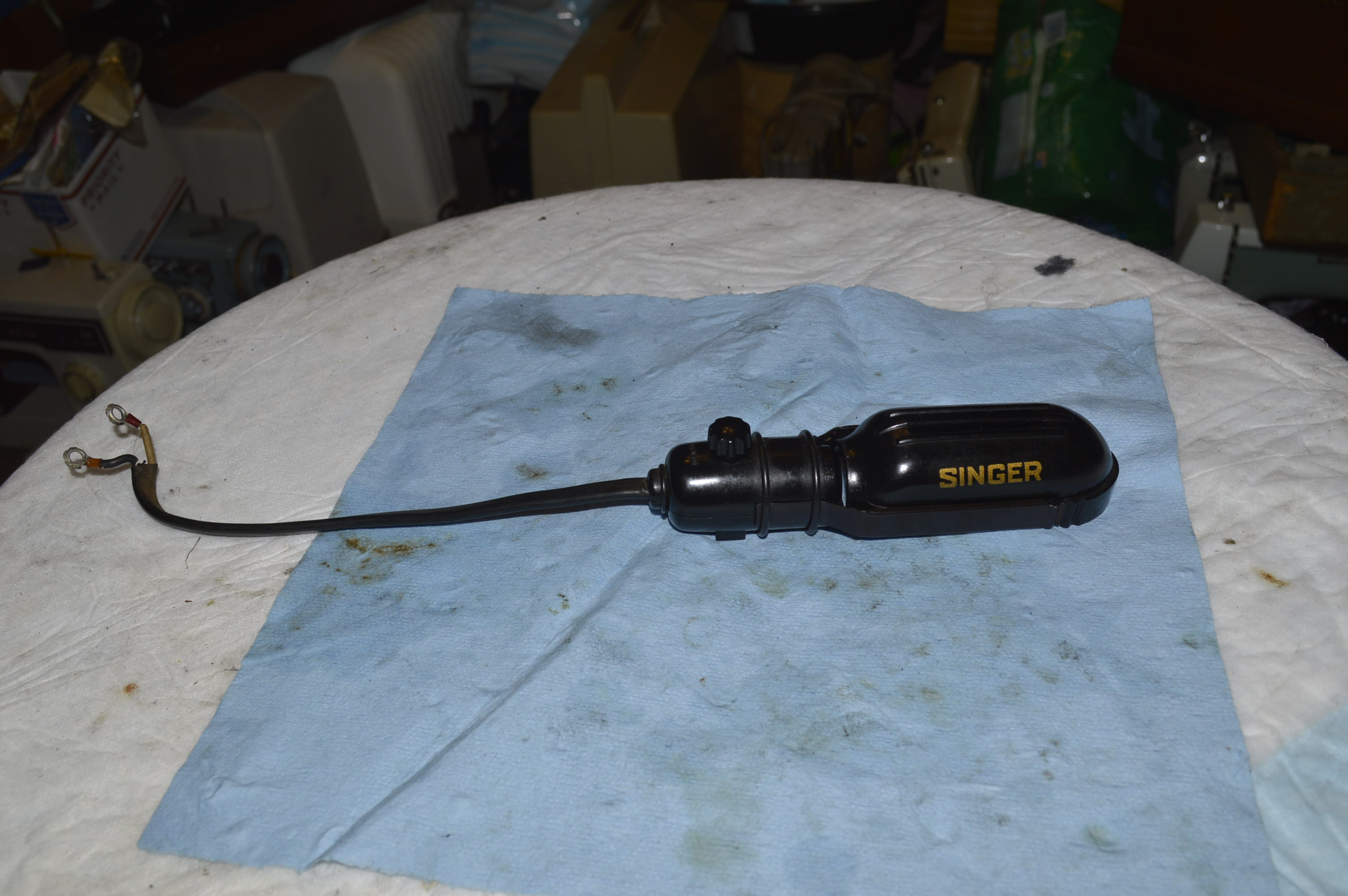 When installing the light it is very important to make sure the wire is routed properly. Hemastats or fine needle nose pliers is your friend and will help pulling the wire around and thru all of the tight places. Remember, the wire wraps around the FRONT of the vertical gear shaft, then between the stitch length arm and the rocker arm, and out thru the small hole in the bottom of the back of the machine. In other words, this wire is in close proximity to parts that are moving very fast when the machine is running, and contact with any moving part and this wire will end badly. I have tried to show the routing of the wire in the pictures.