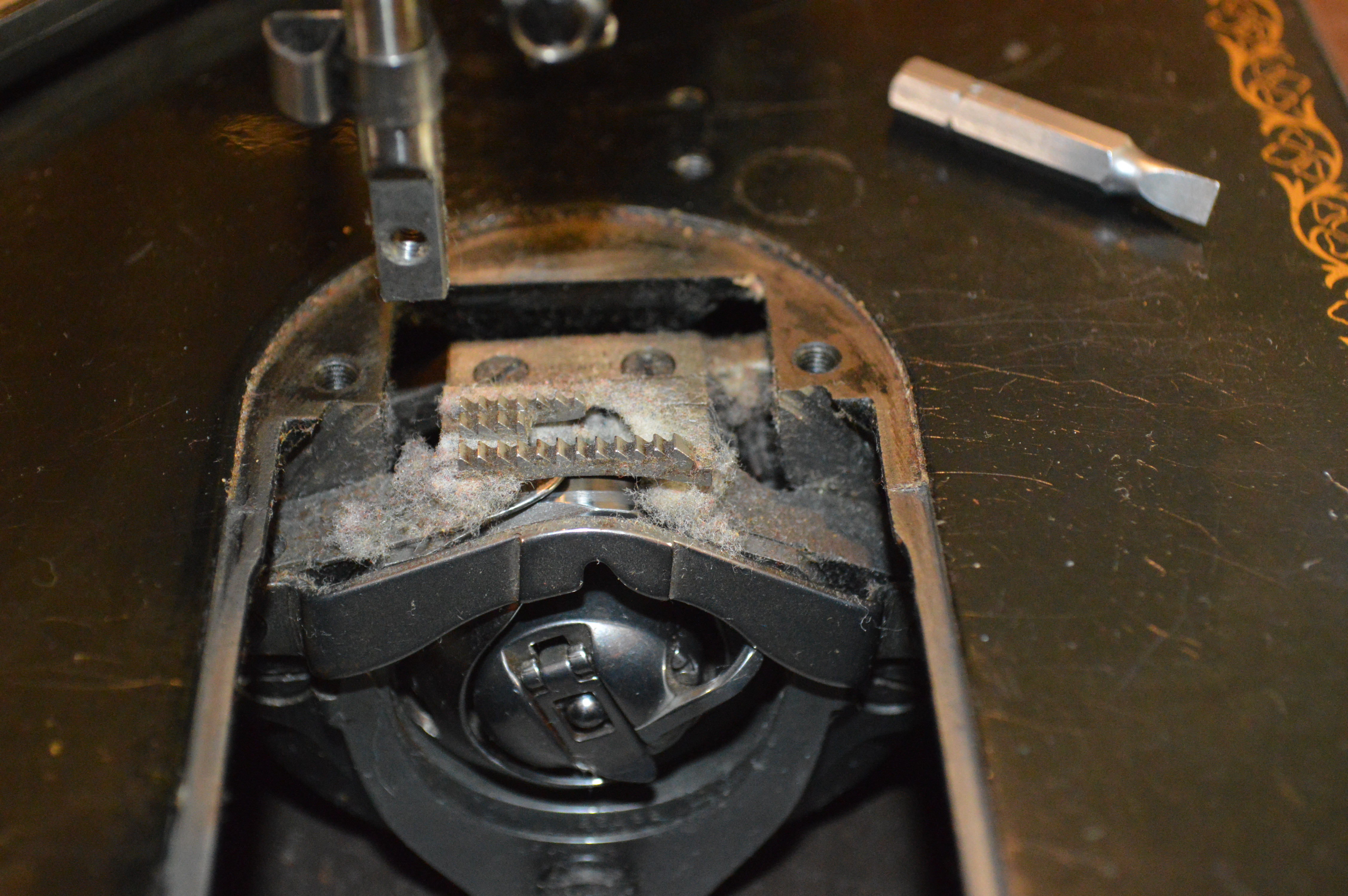 After my initial evaluation, I decided that all this machine needed was a full cleaning and servicing. Well… if was just a matter of cosmetic cleaning and oiling, I could stop here. This machine is in store for a little more. Of course, the body of the machine will be cleaned, but he sewing mechanisms will be deep cleaned to remove all traces of old oil and grease. All of the plates, fittings, bobbin assembly, and removable little bits will be ultrasonically cleaned. The motor will be partially disassembled to polish the armature and clean the brushes. The tension assemblies, both the top assembly and the bobbin case, will be disassembled and ultrasonically cleaned. So… here is the process in pictures…