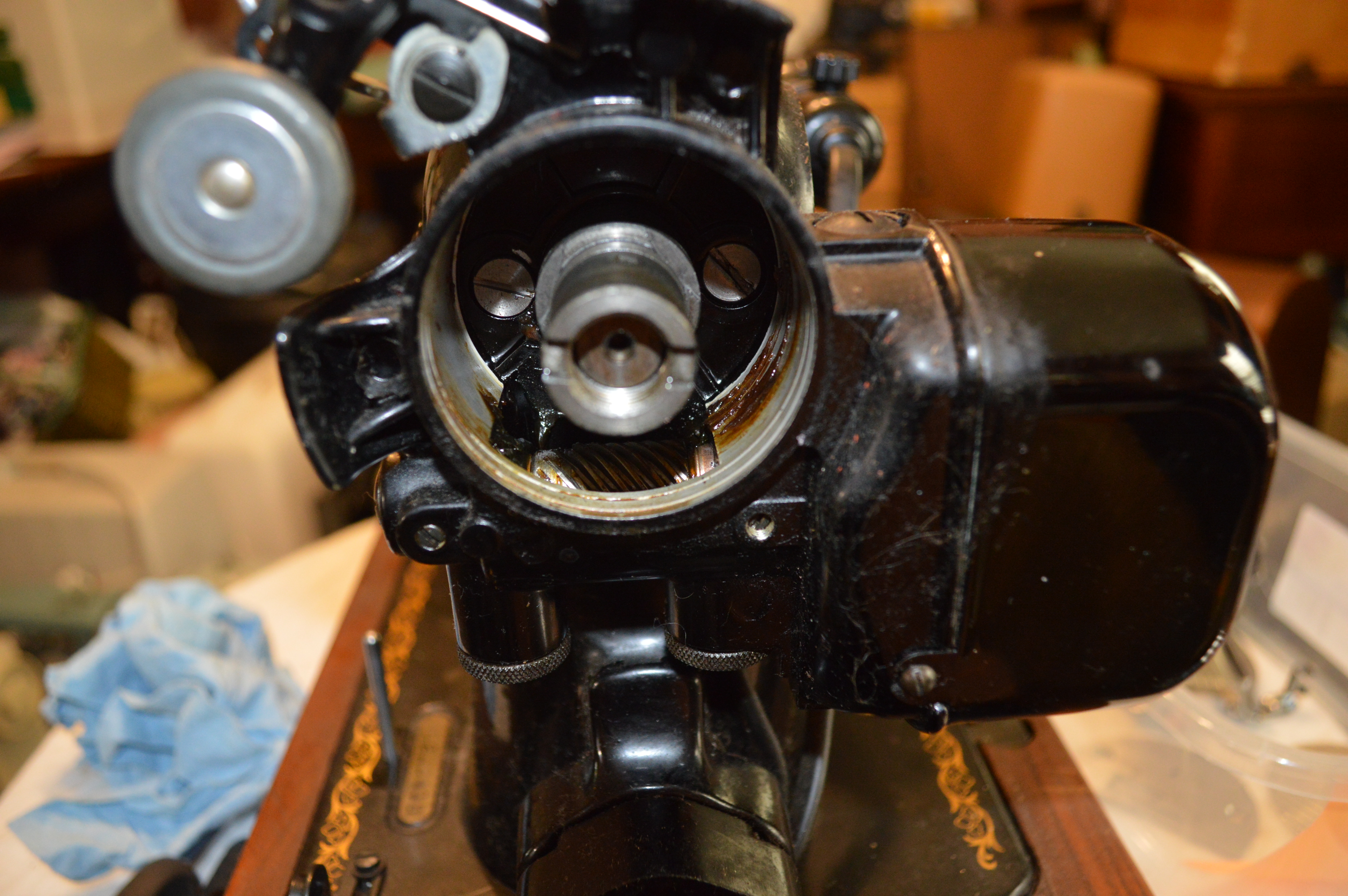 Notice the condition of the worm gears in the top sewing arm? One gear is bronze and the worm gear is heat treated steel. You may also notice that these gears are absent any indication of grease ever being applied.