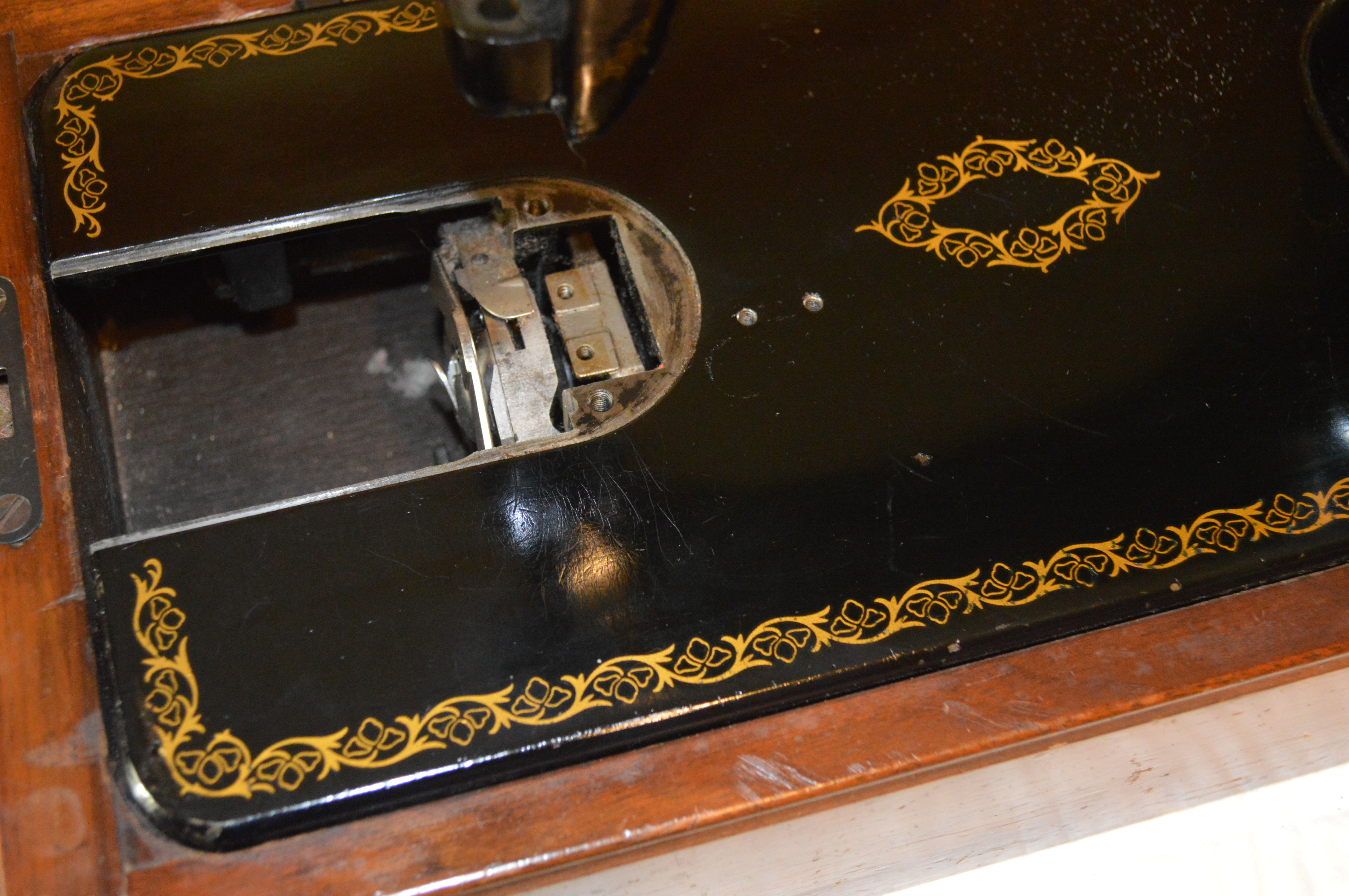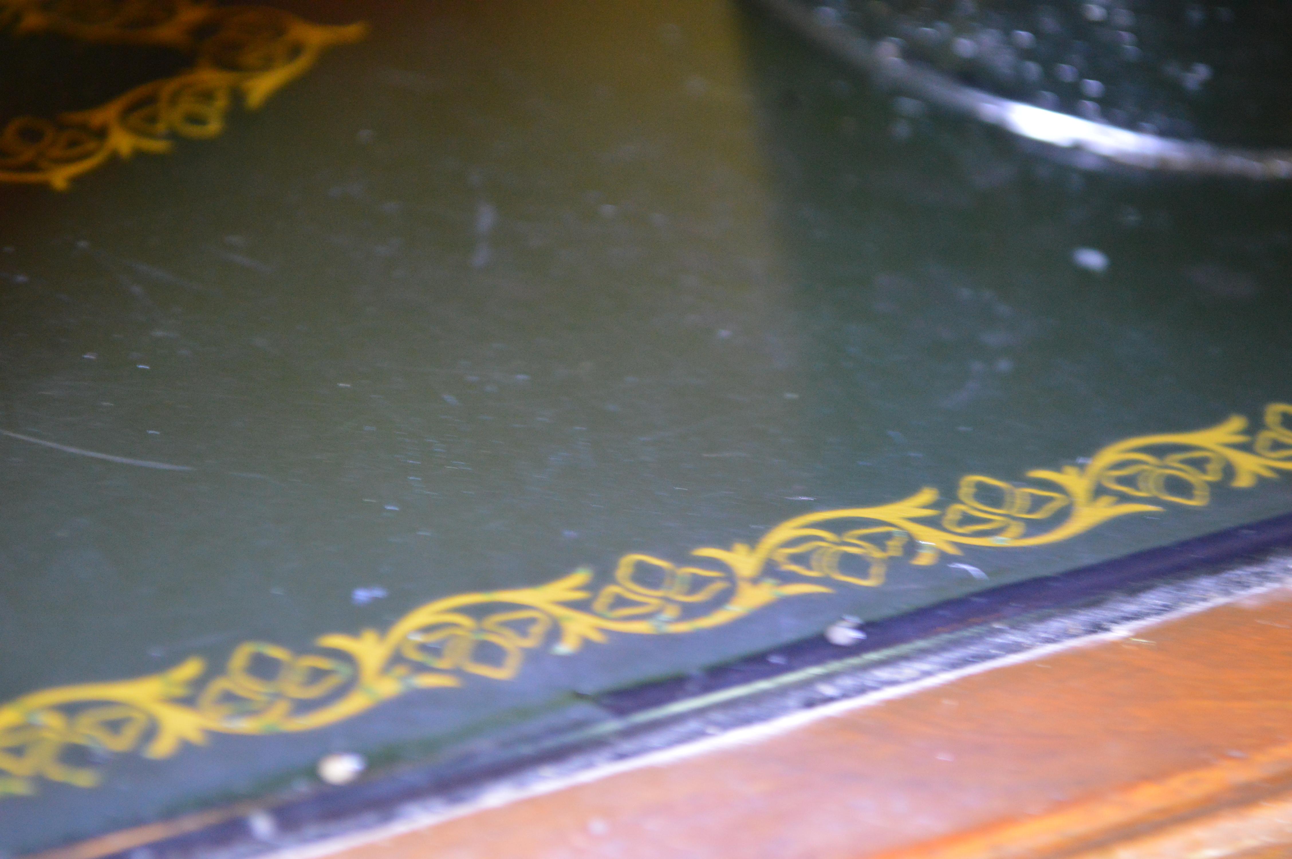 If you look at the bottom two pictures, you can see a strip along the edge of the bed that is blacker than the adjacent area. This is where the shellac coating has been worn away and is exposing the unprotected paint finish. If this extended over the decals, they too would be exposed and easily damaged if the machine is cleaned aggressively. Sewing machine oil will not damage the decals in these areas if they are GENTLY cleaned… Cotton balls and sewing machine oil. Don’t go any further cleaning if you are concerned about the decals, because decal damage cannot be reversed. Even if you stop here, the machine looks much better and you have nourished the finish.