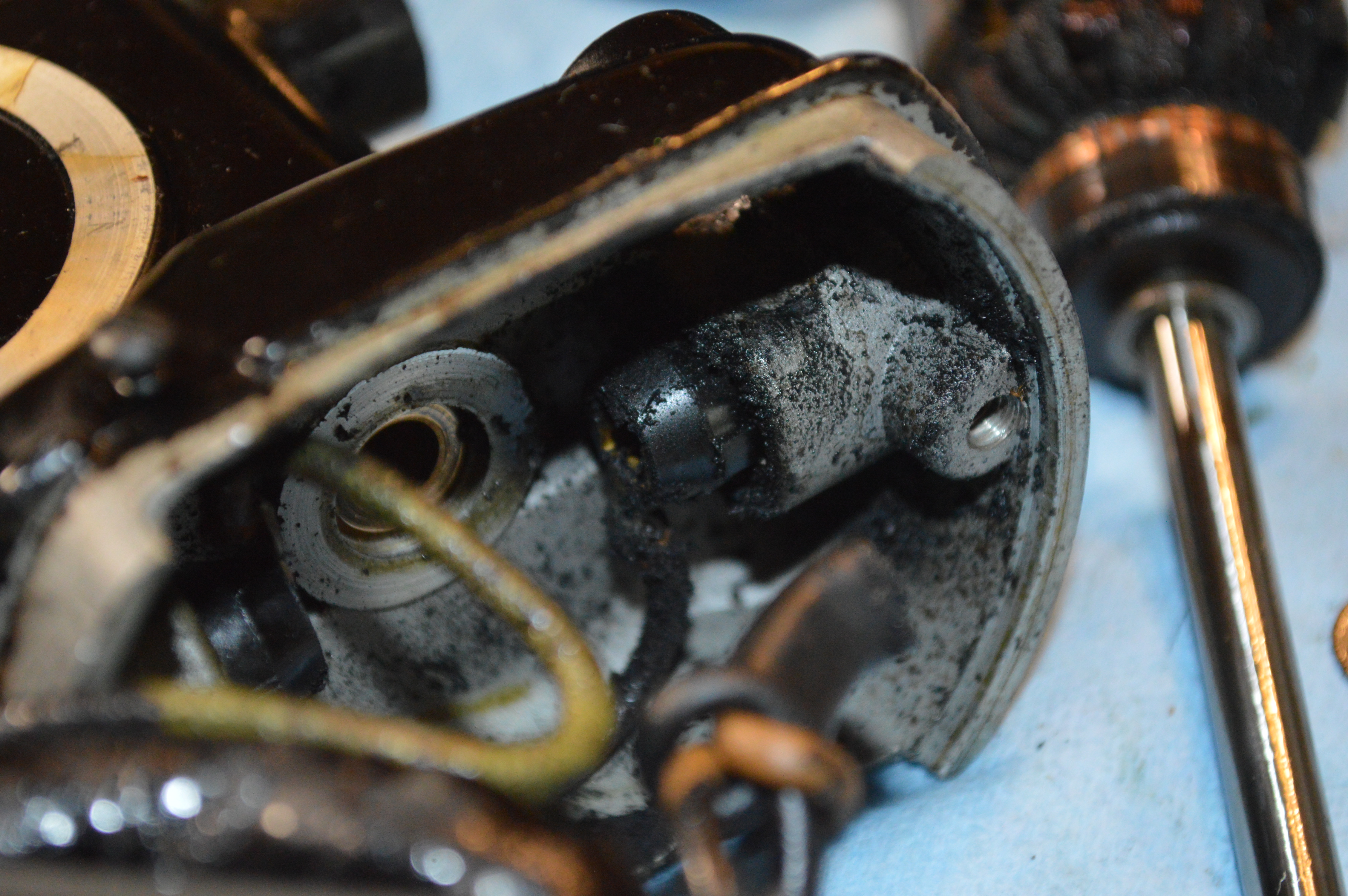 The Black Bits on the Bench is Old Wire Insulation That Fell OffDried Grease wicksSee the Black Surface of the Armature Commutator?… Also, Note the Brittle Wires on the Field Coil