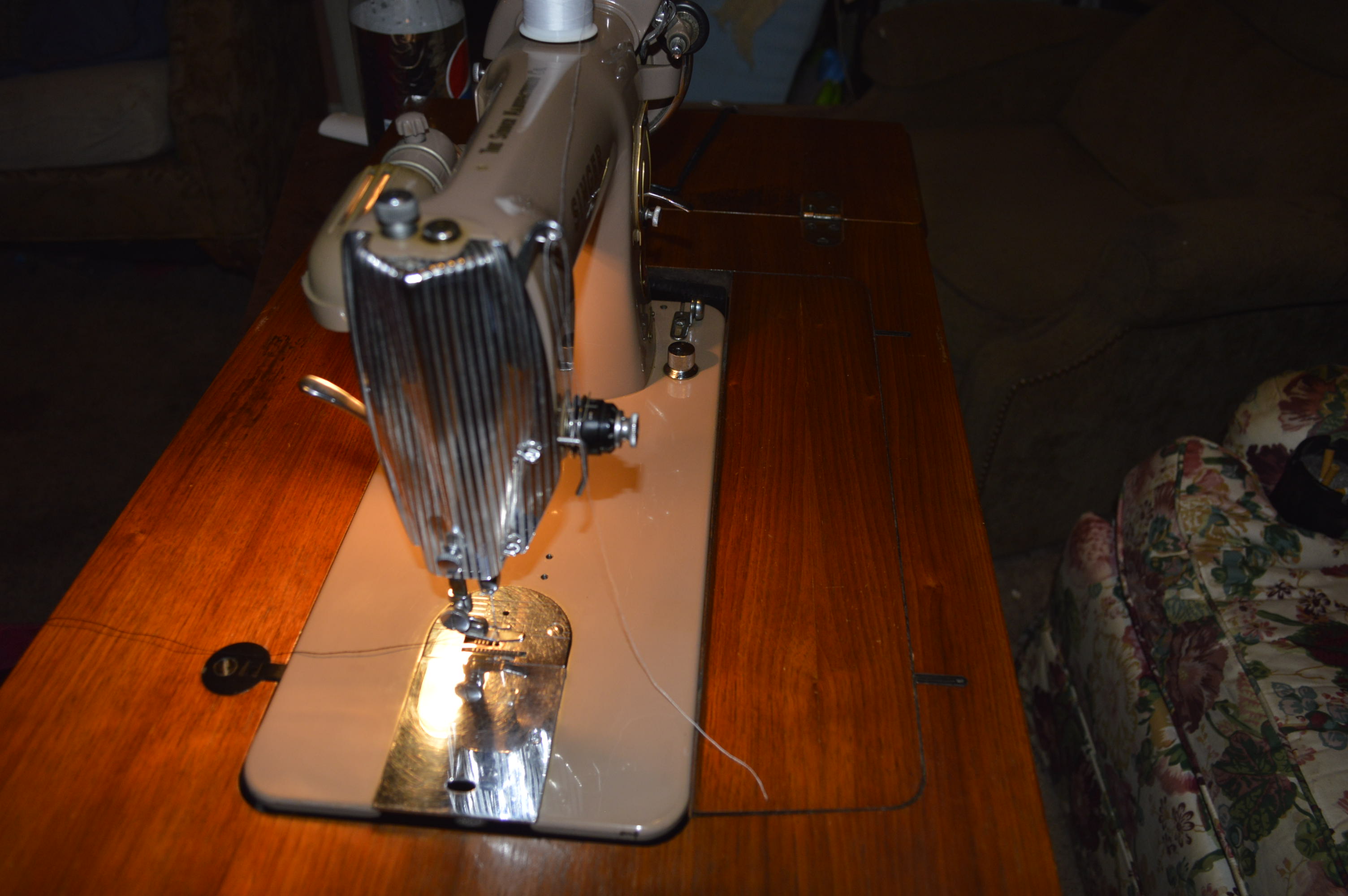 The Singer model 191U was made in Japan in the late 1950’s, early 1960’s. It uses a class 15 side loading bobbin, uses an oscillating hook mechanism, uses standard 15×1 needles, has a drop feed dog mechanism controlled by a knob located on the bed in front of the pillar. It is driven by an external belt drive motor.